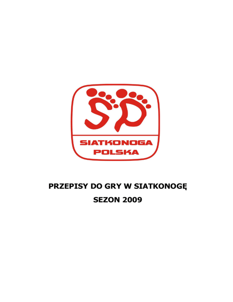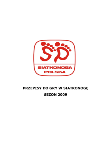 PRZEPISY DO GRY W SIATKONOGĘ SEZON 2009 2009 Przepisy do gry w siatkonogę. 1. Boisko do gry 1.1 Jedna połowa boiska ma wymiary 8.2m (max 9) x 6.4m. Strefy serwisowe są podzielone, a ich wymiary to 4.1 x 6.4 m. 1.2 Boisko jest podzielone na dwie części poprzez siatkę. 1.3 Linie boczne i końcowe są częścią boiska. Linie powinny mieć wymiary 5 + 1 cm szerokości. Wymiary powinny być z dokładnością do +/- 5 cm. 1.4 Strefa boiska powinna być zagrodzona przez bandy reklamowe, minimum 3 metry od linii bocznych, oraz minimum 3,5 metra od linii końcowych. 2. Siatka 2.1 Definicja: część boiska znajdująca się dokładnie w połowie. Zamocowana na specjalnych słupkach. Słupki są integralną częścią siatki, która dzieli boisko na dwie części. 2.2 Słupki są integralną częścią siatki i umieszczone są pionowo na liniach bocznych. Słupki posiadają antenki o wysokości od 90 do 100 cm ponad siatkę. 2.2 Siatka jest naciągnięta na dwóch końcach, tak by jej górna część znajdowała się 110 cm ponad podłożem. Maksymalna granica błędu to + 2 cm. 3. Piłka 3.1 Oficjalna piłka do siatkonogi powinna być w kolorze czarno-białym, składać się z 32 paneli. Powinna być wykonana z syntetycznej, lub naturalnej skóry. Waga Piłki 396-453 gramy, średnica 680710 mm, ciśnienie 60-65 kPa, wysokość kozła 660-720 mm. Wysokość kozła jest mierzona po upuszczeniu piłki z wysokości 1 m. 4. Rozpoczęcie gry 4.1 Drużyna (zawodnik), który zwycięży losowanie ma prawo do decyzji o wyborze rozpoczęcia gry lub strony boiska. 4.2 W razie remisu po dwóch pierwszych setach spotkania, decyzję o wyborze strony boiska lub rozpoczęcia gry podejmuje drużyna z większą ilością zdobytych małych punktów w dwóch pierwszych setach. Jeśli ich liczba jest jednakowa dla obu drużyn, o wyborze połowy lub rozpoczęcia decyduje losowanie. 4.3 Czas trwania przerwy technicznej (jeżeli organizator nie postanowił inaczej): a) pomiędzy setami: 1 minuta b) Pomiędzy meczami: 5 minut Mecz jest odwołany, jeśli drużyna nie stawi się w terminie planowanego rozpoczęcia meczu przez organizatora. [email protected] www.siatkonoga.pl Strona 1 2009 Przepisy do gry w siatkonogę. 5. Serwis 5.1 Serwis jest egzekwowany poprzez kopnięcie piłki przez jakąkolwiek część ciała (za wyjątkiem dłoni, rąk, ramion) ze strefy serwisowej umieszczonej za linią końcową swojej połowy boiska w strefę serwisową boiska przeciwnika ponad siatką. 5.2 Serwis może być wykonany tylko z danego pola serwisowego przez dowolnego zawodnika serwującej drużyny z przebywających na boisku. Pola serwisowe zawierają się pomiędzy linią końcową, przedłużeniem linii bocznej oraz przedłużenie linii środkowej. 5.3 Odbierać serwis może dowolny z zawodników będących na placu gry w drużynie zagrywkę przyjmującej. 5.4 Serwis odbywa się diagonalnie z lewej na prawą oraz z prawej na lewą stronę w zależności od ilości zdobytych przez drużynę punktów w secie. Przy liczbie punktów parzystej (wyniki 0:0, 2:1, 4:6 itd.) serwis odbywa się z pola serwisowego prawego, a przy nieparzystej liczbie punktów (wyniki 1:0, 1:1, 1:2, 3:2 itd.) z pola serwisowego lewej. 5.5 Metody serwisu: kopnięcie piłki nogą z powietrza, po koźle, lub bezpośrednio z ziemi. Żadna część ciała oraz piłka nie ma prawa dotknąć boiska (w tym linii) podczas wykonywania serwisu. Przed wykonaniem serwisu piłka powinna znajdować się w ręku (ach) serwującego, lub leżeć na podłożu. 5.6 Na wykonanie serwisu serwujący ma 5 sekund od momentu gwizdka sędziego. 5.7 Piłka po serwisie powinna przelecieć przez siatkę, oraz wylądować w polu serwisowym przeciwnika lub dotknąć któregoś z graczy przeciwnika uczestniczących w grze. 5.8 Jeśli po wykonaniu serwisu, piłka spadnie na pole serwisowe przeciwnika lub dotknie któregoś z graczy przeciwnika wcześniej dotykając siatki (taśmy) serwis jest prawidłowy. 5.9 Serwującym jest zawsze zawodnik z drużyny, która zdobyła punkt. 5.10 Zawodnik drużyny odbierającej serwis ma prawo do dotknięcia piłki zanim ta nie dotknie podłoża po jego stronie boiska, ale nie ma prawa przebić pierwszej piłki na połowę przeciwnika. 6. Piłka w grze 6.1 Zawodnik ma prawo odbijać piłkę każdą częścią ciała (za wyjątkiem rąk). 6.2 Zawodnik nie ma prawa dotykać piłki w jednej akcji więcej niż raz z rzędu. 6.3 Maksymalna liczba odbić piłki od podłoża w grze podwójnej wynosi: 1. W czasie gry zawodnik nie ma obowiązku pozwolić piłce spaść na podłoże. 6.4 Maksymalna liczba kontaktów drużyny z piłką w jednej akcji w grze podwójnej wynosi: 3 Minimalna liczba kontaktu zawodnika z piłką, zanim piłka przejdzie na drugą stronę boiska to 1 za wyjątkiem sytuacji, kiedy zawodnik drużyny przyjmującej serwis przyjmie zagrywkę bezpośrednio (bez kozła), w takim przypadku minimalna liczba kontaktów z piłką drużyny przyjmującej zagrywkę wynosi 2. 6.5 Prawidłowo zagrana piłka, powinna po przeleceniu nad siatką spaść w pole boiska przeciwnika. [email protected] www.siatkonoga.pl Strona 2 2009 Przepisy do gry w siatkonogę. 6.6 Serwis jest powtórzony („nowa piłka”) jedynie w momencie gdy obcy obiekt dotknie pole gry, lub piłkę. 6.7 Żaden z zawodników nie ma prawa dotknąć siatki, także gdy akcja jest już zakończona. 6.8 Piłka jest zagrana prawidłowo jedynie w momencie gdy przeleci ponad siatką i upadnie w polu gry przeciwnika. (zasada 2.1). 6.9 Jeśli dwóch graczy znajdujących się po przeciwnych stronach siatki dotknie piłkę znajdującą się nad siatką w tym samym momencie (”martwa piłka”), a piłka wyleci poza boisko, serwis jest powtórzony. 6.10 Jeśli dwóch graczy znajdujących się po przeciwnych stronach siatki dotknie piłkę znajdującą się nad siatką w tym samym momencie (”martwa piłka”), a piłka zostanie w polu gry, gra toczy się dalej a zawodnika który brał udział w 