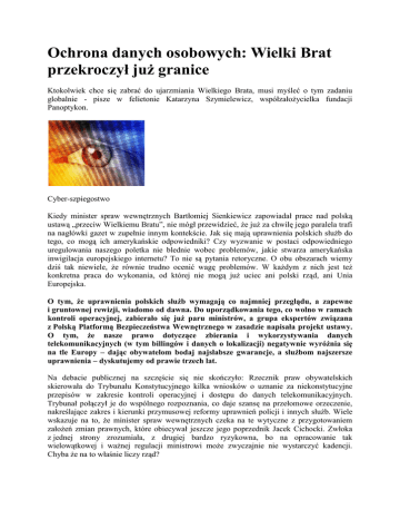 Ochrona danych osobowych: Wielki Brat przekroczył już granice Ktokolwiek chce się zabrać do ujarzmiania Wielkiego Brata, musi myśleć o tym zadaniu globalnie - pisze w felietonie Katarzyna Szymielewicz, współzałożycielka fundacji Panoptykon. Cyber-szpiegostwo Kiedy minister spraw wewnętrznych Bartłomiej Sienkiewicz zapowiadał prace nad polską ustawą „przeciw Wielkiemu Bratu”, nie mógł przewidzieć, że już za chwilę jego paralela trafi na nagłówki gazet w zupełnie innym kontekście. Jak się mają uprawnienia polskich służb do tego, co mogą ich amerykańskie odpowiedniki? Czy wyzwanie w postaci odpowiedniego uregulowania naszego poletka nie blednie wobec problemów, jakie stwarza amerykańska inwigilacja europejskiego internetu? To nie są pytania retoryczne. O obu obszarach wiemy dziś tak niewiele, że równie trudno ocenić wagę problemów. W każdym z nich jest też konkretna praca do wykonania, od której nie mogą już uciec ani polski rząd, ani Unia Europejska. O tym, że uprawnienia polskich służb wymagają co najmniej przeglądu, a zapewne i gruntownej rewizji, wiadomo od dawna. Do uporządkowania tego, co wolno w ramach kontroli operacyjnej, zabierało się już paru ministrów, a grupa ekspertów związana z Polską Platformą Bezpieczeństwa Wewnętrznego w zasadzie napisała projekt ustawy. O tym, że nasze prawo dotyczące zbierania i wykorzystywania danych telekomunikacyjnych (w tym billingów i danych o lokalizacji) negatywnie wyróżnia się na tle Europy – dając obywatelom bodaj najsłabsze gwarancje, a służbom najszersze uprawnienia – dyskutujemy od prawie trzech lat. Na debacie publicznej na szczęście się nie skończyło: Rzecznik praw obywatelskich skierowała do Trybunału Konstytucyjnego kilka wniosków o uznanie za niekonstytucyjne przepisów w zakresie kontroli operacyjnej i dostępu do danych telekomunikacyjnych. Trybunał połączył je do wspólnego rozpoznania, co daje szansę na przełomowe orzeczenie, nakreślające zakres i kierunki przymusowej reformy uprawnień policji i innych służb. Wiele wskazuje na to, że minister spraw wewnętrznych czeka na te wytyczne z przygotowaniem założeń zmian prawnych, które obiecywał jeszcze jego poprzednik Jacek Cichocki. Zwłoka z jednej strony zrozumiała, z drugiej bardzo ryzykowna, bo na opracowanie tak wielowątkowej i ważnej regulacji ministrowi może zwyczajnie nie wystarczyć kadencji. Chyba że na to właśnie liczy rząd? Jak się kończy unikanie trudnego tematu i liczenie na to, że „nie wypłynie”, dobitnie pokazała afera z amerykańskim programem PRISM. O tym, że Amerykanie mają przynajmniej szerokie możliwości pozyskiwania danych obywateli UE od podlegających ich jurysdykcji firm, wiadomo od ponad 10 lat. Jeszcze w 2002 r., w ramach dostosowywania amerykańskiego porządku prawnego do potrzeb wojny z terroryzmem, Kongres przyjął Foreign Intelligence Surveillance Act, którego ostrze zostało wymierzone właśnie w cudzoziemców. Firmy takie jak Google, Microsoft, Yahoo, Apple czy AOL nie mają wyjścia: w świetle prawa muszą udostępniać NSA i FBI dane swoich klientów. Można było dywagować o tym, jakie są skala czy tryb tego dostępu, jednak nie można było udawać, że problemu nie ma. Europejskie instytucje też nie udawały, że wszystko jest w porządku. W ubiegłym roku Parlament Europejski zamówił analizę na temat zagrożeń związanych z przechowywaniem danych w chmurze, czyli na wirtualnych serwerach zagranicznych firm. Nie zabrakło w niej odniesień do szczególnych uprawnień amerykańskich służb. Od dwóch lat na stole jest projekt porozumienia między Unią Europejską i USA o ochronie danych w sferze współpracy policyjnej i sądowej, które w zamyśle ma narzucić takie same standardy postępowania z danymi osobowymi organom egzekwowania prawa po obu stronach Atlantyku. Ale to wciąż tylko projekt. Komisja Europejska starała się też zawrzeć gwarancje zapobiegające takim praktykom, jak niekontrolowany dostęp organów innych państw do danych obywateli UE, w projekcie rozporządzenia o ochronie danych osobowych, nad którym prace są bardziej zaawansowane. Co prawda te gwarancje byłyby raczej papierowe, bo to, co Unia Europejska wpisze do swojego prawa, nie wpływa automatycznie na zagraniczne przepisy, takie jak FISAA. Jednak nawet to się nie udało. Z relacji brukselskich urzędników i dokumentów, jakie wyciekły do mediów, wynika, że zadziałała dyplomatyczna presja USA. Podobnie jak w Polsce – to, że wszyscy widzą problem, niekoniecznie pomaga w znalezieniu rozwiązania. Potrzebna jest jeszcze wola polityczna. Afera, jaka wybuchła po ujawnieniu szczegółów programu PRISM, niewiele wnosi do naszej wiedzy o skali i celach inwigilacji. Amerykańskie firmy zgodnie podważają rewelacje Snowdena i zapewniają, że „bezpośredniego dostępu do serwerów” nikomu nie dają. Komisarz ds. praw podstawowych Viviane Reding zadała amerykańskiemu prokuratorowi generalnemu siedem pytań, na które oczekuje „szybkich i konkretnych odpowiedzi”. Jeśli je dostanie, dowiemy się, czy rzeczywiście to, co mogą amerykańskie służby, jest powodem do większego niepokoju niż sytuacja, z jaką mierzymy się w Polsce. Już dziś jedno jest jednak pewne: ktokolwiek chce się zabrać do ujarzmiania Wielkiego Brata, musi myśleć o tym zadaniu globalnie. Nie ma sensu rozmowa o uprawnieniach polskich służb w oderwaniu od tego, jakie uprawnienia mają agencje wywiadowcze naszych politycznych sojuszników – tak jak nie ma sensu rozmowa o ochronie danych osobowych w Europie bez dyskusji o amerykańskich standardach i obowiązkach globalnych internetowych korporacji. Sztuczne oddzielenie gwarancji dotyczących zbierania i przetwarzania danych przez komercyjne firmy od przepisów, które dają dostęp do tych danych organom egzekwowania prawa, ma bardzo krótkie nogi. Sytuacja, w której ABW zwraca się z pro