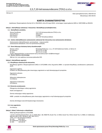 Brenntag Polska Sp. z o.o. ul. J. Bema 21, 47-224 Kędzierzyn-Koźle tel (48/77) 4721500, fax (48/77) 4721600 2,5,7,10-tetraoxaundecane (TOU) cz.d.a. Wersja: III Data sporządzenia karty: 2010-03-16 Aktualizacja: 2015-06-01 KARTA CHARAKTERYSTYKI (podstawa: Rozporządzenie Komisji UE nr 453/2010 z dnia 20 maja 2010r. zmieniające rozporządzenie (WE) nr 1907/2006 ws REACH) Sekcja 1. Identyfikacja substancji / mieszaniny i identyfikacja przedsiębiorstwa. 1.1. Identyfikator produktu. Nazwa handlowa: Identyfikator: Kod towaru: Inne nazwy: 2,5,7,10-tetraoxaundecane (TOU) cz.d.a. 4431-83-8 512982 2,5,7,10-Tetraoksaundekan 1.2. Istotne zidentyfikowane zastosowania substancji lub mieszaniny oraz zastosowania odradzane. Zastosowania zidentyfikowane: przemysłowe - rozpuszczalnik zastosowania odradzane: inne niż wymienione powyżej 1.3. Dane dotyczące dostawcy karty charakterystyki. Nazwa i adres: Brenntag Polska Sp. z o.o., 47-224 Kedzierzyn-Koźle, ul. Bema 21 Nr telefonu: 48 (77) 47 21 500 Nr faxu: 48 (77) 47 21 600 Osoba odpowiedzialna za opracowanie karty charakterystyki: [email protected] 1.4. Numer telefonu alarmowego. 998 lub 112, lub najbliższa terenowa jednostka PSP. Sekcja 2. Identyfikacja zagrożeń. 2.1. Klasyfikacja substancji lub mieszaniny. Klasyfikacja zgodnie z Rozporządzeniem (WE) nr 1272/2008 z dnia 16 grudnia 2008 r. w sprawie klasyfikacji, oznakowania i pakowania (CLP) Zagrożenie ogólnie: Produkt nie sklasyfikowany jako stwarzający zagrożenie w myśl obowiązujących przepisów. Zagrożenie zdrowia: nie dotyczy Własności niebezpieczne: nie dotyczy Zagrożenie środowiska: nie dotyczy 2.2. Elementy oznakowania Piktogramy określające rodzaj zagrożenia: Hasło ostrzegawcze: Zwroty wskazujące rodzaj zagrożenia: H000 - produkt nie sklasyfikowany jako stwarzający zagrożenie w myśl obowiązujących przepisów Zwroty określające warunki bezpiecznego stosowania: 2.3. Inne zagrożenia. nie dotyczy Sekcja 3. Skład / informacja o składnikach. Skład wg Rozporządzenia 1272/2008. < 0,1% 2-metoksyetanol (Flam. Liq. 3, H226; Repr. 1B, H360-FD; Acute Tox. 4, H332; Acute Tox. H312; Acute Tox. 4, H302; nr indeksowy: 603-011-00-4; CAS: 109-86-4; WE: 203-713-7) >97% 2,5,7,10-Tetraoksaundekan Nr CAS: 4431-83-8 Nr indeksowy: nie dotyczy Nr WE: 224-631-8 Karta opracowana przez firmę Brenntag Polska Sp. z o.o. Strona 1 z 6 Brenntag Polska Sp. z o.o. ul. J. Bema 21, 47-224 Kędzierzyn-Koźle tel (48/77) 4721500, fax (48/77) 4721600 2,5,7,10-tetraoxaundecane (TOU) cz.d.a. Sekcja 4. Środki pierwszej pomocy. 4.1. Opis środków pierwszej pomocy. Wdychanie: W razie narażenia inhalacyjnego zapewnić dostęp świeżego powietrza, w razie trudności z oddychaniem zapewnić pomoc medyczną. Kontakt ze skórą: W razie skażenia skóry zmyć dokładnie wodą z mydłem, przy wystąpieniu niepokojących objawów zapewnić pomoc medyczną. Kontakt z oczami: W razie zanieczyszczenia oczu natychmiast płukać wodą, przy wystąpieniu niepokojących objawów zapewnić pomoc medyczną. Spożycie: W razie połknięcia wypłukac usta, zapewnić pomoc medyczną. 4.2. Najważniejsze ostre i opóźnione objawy oraz skutki narażenia. brak dostępnych danych 4.3. Wskazania dotyczące wszelkiej natychmiastowej pomocy lekarskiej i szczególnego postępowania z poszkodowanym. brak dostępnych danych Sekcja 5. Postępowanie w przypadku pożaru. 5.1. Środki gaśnicze. W przypadku pożaru używać rozpyloną wodę, piany, proszki gaśnicze, dwutlenek węgla Nie stosować wody w pełnym strumieniu 5.2. Szczególne zagrożenia związane z substancją lub mieszaniną. Produkty rozkładu zawieraja formaldehyd. Produkty spalania zawierają tlenek i dwutlenek węgla. 5.3. Informacje dla straży pożarnej. Stosować niezależny aparat oddechowy oraz pełną odzież ochronną Sekcja 6. Postępowanie w przypadku niezamierzonego uwolnienia do środowiska. 6.1. Indywidualne środki ostrożności, wyposażenie ochronne i procedury w sytuacjach awaryjnych. Założyć rękawice ochronne, okulary ochronne, odzież ochronną 6.2. Środki ostrożności w zakresie ochrony środowiska. Zapobiec rozprzestrzenianiu się lub dostaniu się do kanalizacji, rowów lub rzek. 6.3. Metody i materiały zapobiegające rozprzestrzenianiu się skażenia i służące do usuwania skażenia. Usunąć źródła zapłonu. Rozlewy zebrać za pomoca obojętnego absorbenta do zamykanego pojemnika i przekazać do zniszczenia. 6.4. Odniesienia do innych sekcji. Usuwać zgodnie z zaleceniami przedstawionymi w sekcji 13 Sekcja 7. Postępowanie z substancjami i mieszaninami oraz ich magazynowanie. 7.1. Środki ostrożności dotyczące bezpiecznego postępowania. Nie wdychać gazów/dymów/oparów. Zapewnić odpowiednią wentylację/wyciąg w miejscu pracy. 7.2. Warunki bezpiecznego magazynowania, łącznie z informacjami dotyczącymi wszelkich wzajemnych niezgodności. Przechowywać w zamkniętych pojemnikach dobrze wentylowanym pomieszczeniu, z dala od bezpośredniego działania światła słonecznego i innych źródeł ciepła i zapłonu. Unikac kontaktu z powietrzem. 7.3. Szczególne zastosowania końcowe. brak dostępnych danych Sekcja 8. Kontrola narażenia / środki ochrony indywidualnej. 8.1. Parametry dotyczące kontroli. Najwyższe dopuszczalne stężenia: -2-metoksyetanol: NDS: 3 mg/m3; NDSCh: nie określono (wg Rozporządzenia MIPS z dn. 6 czerwca 2014, Dz.U. 2014, poz.817) Zalecenia dotyczące procedury monitoringu zawartości składników niebezpiecznych w powietrzu – metodyka pomiarów: -Rozporządzenie Ministra Zdrowia z dnia 2 luty 2011 r. w sprawie badań i pomiarów czynników szkodliwych dla zdrowia w środowisku pracy (Dz.U. 2011, nr 33, poz. 166) Karta opracowana przez firmę Brenntag Polska Sp. z o.o. Strona 2 z 6 Brenntag Polska Sp. z o.o. ul. J. Bema 21, 47-224 Kędzierzyn-Koźle tel (48/77) 4721500, fax (48/77) 4721600 2,5,7,10-tetraoxaundecane (TOU) cz.d.a. -PN-89/Z-01001/06. Ochrona czystości powietrza. Nazwy, okre