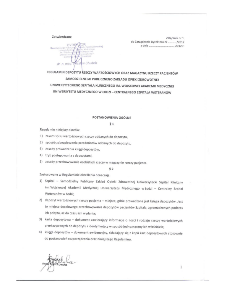 §3 Na mocy art. 39 Ustawy o prawach pacjenta i Rzeczniku Praw Pacjenta z dnia 6 listopada 2008r. (Dz. U. z 2012r., poz. 159), Rozporządzenia Ministra Zdrowia w sprawie prowadzenia depozytu w stacjonarnym zakładzie opieki zdrowotnej z dnia 30 lipca 2009r. (Dz. U. Nr 129, poz. 1068) oraz § 14 ust. 2 i 4 Regulaminu Organizacyjnego Uniwersyteckiego Szpitala Klinicznego im. Wojskowej Akademii Medycznej – Centralnego Szpitala Weteranów w Łodzi pacjentowi przyjętemu do Uniwersyteckiego Szpitala Klinicznego im. Wojskowej Akademii Medycznej – Centralnego Szpitala Weteranów w Łodzi przysługuje prawo do przechowywania wartościowych rzeczy w depozycie Szpitala oraz do przechowywania osobistych rzeczy w magazynie rzeczy pacjentów. ZAKRES SPISU WARTOŚCIOWYCH RZECZY ODDANYCH DO DEPOZYTU §4 Do przedmiotów wartościowych zalicza się: 1) środki pieniężne i płatnicze, 2) kruszce szlachetne i wyroby z tych kruszców oraz drogie kamienie (biżuteria), 3) papiery wartościowe, 4) inne przedmioty uznane za wartościowe przez Szpital, pacjenta lub rodzinę pacjenta. §5 Depozyt wartościowych rzeczy pacjenta znajduje się w Izbie Przyjęć Szpitala. §6 Szpital odpowiada za całość przyjętego depozytu. §7 W przypadku nie złożenia do depozytu posiadanych rzeczy wartościowych, Szpital zwolniony jest od ponoszenia odpowiedzialności w tym zakresie. §8 1. Szpital prowadzi księgę depozytową. 2. Księga depozytowa składa się z kopii kart depozytowych i skorowidza. 3. Wzór karty depozytowej stanowi załącznik nr 1 do niniejszego Regulaminu. §9 Pacjentowi przekazującemu wartościowe rzeczy do depozytu w Szpitalu, na czas pozostawania w Szpitalu, wydaje się kartę depozytową będącą pokwitowaniem przyjęcia określonych przedmiotów do depozytu. 2 § 10 Karta depozytowa zawiera w szczególności: 1) kolejny numer karty, 2) numer księgi głównej Szpitala, 3) oznaczenie Szpitala, 4) dane osobowe niezbędne do zidentyfikowania pacjenta: a) imię i nazwisko, b) data i miejsce urodzenia, c) adres miejsca zamieszkania lub adres do korespondencji, d) numer PESEL, jeżeli taki posiada, 5) spis rzeczy wartościowych oddanych do depozytu zawierający ich opis oraz liczbę, 6) datę wypełnienia karty, 7) podpis osoby przyjmującej depozyt, 8) podpis pacjenta, 9) dane osoby upoważnionej do odbioru depozytu w przypadku zgonu pacjenta lub przewiezienia do innego Szpitala, 10) datę i podpis osoby odbierającej depozyt, 11) informacje o wysłanych wezwaniach do odbioru depozytu. § 11 1. W przypadku, gdy pacjent jest nieprzytomny lub niezdolny do zrozumienia znaczenia informacji, Pielęgniarka Oddziałowa Izby Przyjęć albo pielęgniarka odpowiedzialna za dyżur na Izbie Przyjęć, komisyjnie sporządza spis rzeczy wartościowych oraz oddaje je do depozytu. 2. Niezwłocznie po ustaniu okoliczności, o których mowa w ust. 1, zawiadamia się pacjenta o złożeniu rzeczy wartościowych do depozytu. W przypadku wyrażenia woli dalszego przechowywania przedmiotów w depozycie, pacjent składa podpis na karcie depozytowej wraz z aktualną datą. 3. W przypadku trwania okoliczności, o których mowa w ust. 1, przez okres dłuższy niż 24 godziny od czasu przyjęcia pacjenta do Szpitala, Pielęgniarka Oddziałowa Izby Przyjęć o złożeniu rzeczy wartościowych do depozytu informuje pielęgniarkę oddziałową kliniki, w której pacjent jest hospitalizowany, a ona następnie informuje małżonka lub rodzeństwo pacjenta, a także inne osoby uprawnione, na podstawie odrębnych przepisów, do dysponowania ruchomościami pacjenta. § 12 Rzeczy wartościowe z depozytu odbiera się w dniach od poniedziałku do piątku w godzinach od 8°° do 14°°. 3 SPOSÓB ZABEZPIECZENIA WARTOŚCIOWYCH RZECZY ODDANYCH DO DEPOZYTU § 13 Rzeczy wartościowe przyjęte do depozytu powinny być zabezpieczone w sposób wykluczający wyjęcie lub zamianę przedmiotów bez naruszenia opakowania, zabezpieczone przed pożarem, uszkodzeniem, zniszczeniem i kradzieżą. § 14 1. Rzeczy wartościowe w depozycie przechowuje się w opakowaniu trwale zamkniętym, ostemplowanym pieczęcią Szpitala i oznaczonym numerem depozytu, pod którym został on zapisany w księdze depozytów. 2. W księdze depozytów, pod numerem depozytu, wyszczególnione są liczba oraz określenie przedmiotów znajdujących się wewnątrz opakowania, w którym depozyt jest przechowywany. 3. Opakowanie, w którym jest przechowywany depozyt, po wpisaniu do księgi depozytów, przechowuje się w sejfie. § 15 1. Klucze do sejfu, w którym znajduje się depozyt, posiada Pielęgniarka Oddziałowa Izby Przyjęć i Przełożona Pielęgniarek Lecznictwa Zamkniętego. 2. Zapasowy klucz do sejfu, w którym umieszczony jest depozyt znajduje się w zalakowanej kopercie, podpisanej przez Pielęgniarkę Oddziałową Izby Przyjęć i Przełożoną Pielęgniarek Lecznictwa Zamkniętego w Kasie Szpitala, a jej otwarcie może nastąpić wyłącznie komisyjnie w obecności Pielęgniarki Oddziałowej Izby Przyjęć lub Przełożonej Pielęgniarek Lecznictwa Zamkniętego. § 16 Przed otwarciem depozytu należy zwrócić uwagę, aby pieczęcie i opakowanie nie były naruszone. W przypadku stwierdzenia braku lub niezgodności między zawartością depozytu i kartą depozytową, należy sporządzić komisyjnie protokół ustalający rodzaj braków, wysokość szkód oraz stan opakowania. Do protokołu powinien być dołączony spis przedmiotów i opakowanie. ZASADY PROWADZENIA KSIĘGI DEPOZYTÓW § 17 1. Księgę depozytów prowadzi i przechowuje pielęgniarka odpowiedzialna za dyżur na Izbie Przyjęć. 2. Pielęgniarka, o której mowa w ust. 1, przyjmuje depozyt, po czym umieszcza go w sejfie oraz wydaje kartę depozytową. 3. Każdego dnia rano, rzeczy pacjentów znajdujące się w sejfie w depozycie Izby Przyjęć, przekazywane są komisyjnie do Kasy Szpitala. 4 4. Karty depozytowe (kopie), po odebraniu depozytu, powinny być przechowywane przez okres 5 lat od dnia odb