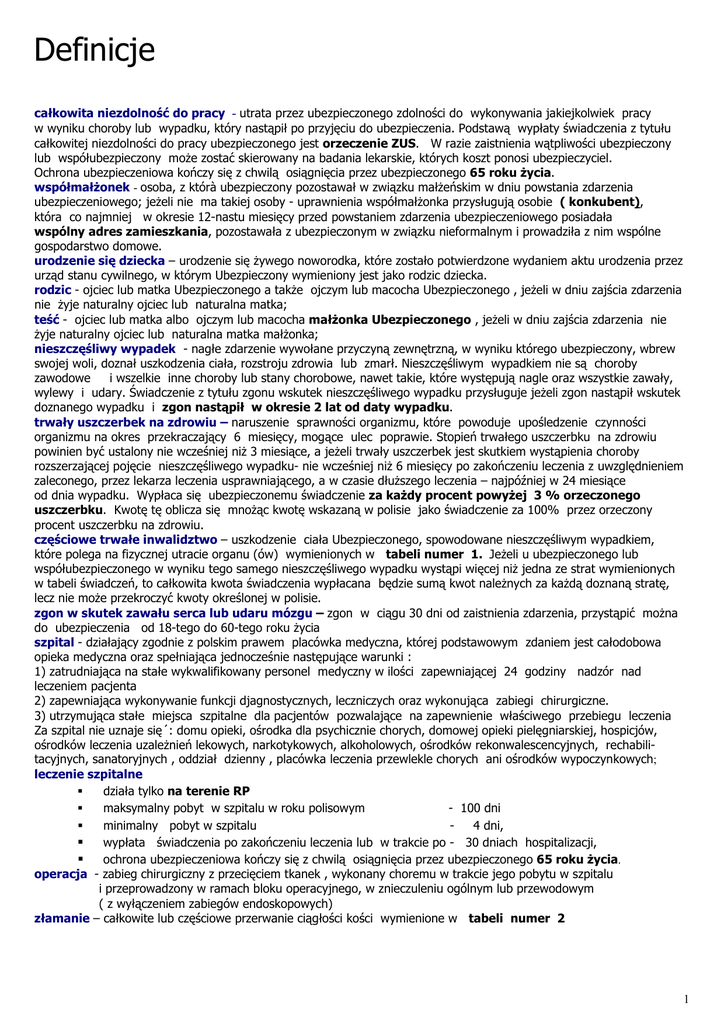 Definicje całkowita niezdolność do pracy - utrata przez ubezpieczonego zdolności do wykonywania jakiejkolwiek pracy w wyniku choroby lub wypadku, który nastąpił po przyjęciu do ubezpieczenia. Podstawą wypłaty świadczenia z tytułu całkowitej niezdolności do pracy ubezpieczonego jest orzeczenie ZUS. W razie zaistnienia wątpliwości ubezpieczony lub współubezpieczony moŜe zostać skierowany na badania lekarskie, których koszt ponosi ubezpieczyciel. Ochrona ubezpieczeniowa kończy się z chwilą osiągnięcia przez ubezpieczonego 65 roku Ŝycia. współmałŜonek - osoba, z którà ubezpieczony pozostawał w związku małŜeńskim w dniu powstania zdarzenia ubezpieczeniowego; jeŜeli nie ma takiej osoby - uprawnienia współmałŜonka przysługują osobie ( konkubent), która co najmniej w okresie 12-nastu miesięcy przed powstaniem zdarzenia ubezpieczeniowego posiadała wspólny adres zamieszkania, pozostawała z ubezpieczonym w związku nieformalnym i prowadziła z nim wspólne gospodarstwo domowe. urodzenie się dziecka – urodzenie się Ŝywego noworodka, które zostało potwierdzone wydaniem aktu urodzenia przez urząd stanu cywilnego, w którym Ubezpieczony wymieniony jest jako rodzic dziecka. rodzic - ojciec lub matka Ubezpieczonego a takŜe ojczym lub macocha Ubezpieczonego , jeŜeli w dniu zajścia zdarzenia nie Ŝyje naturalny ojciec lub naturalna matka; teść - ojciec lub matka albo ojczym lub macocha małŜonka Ubezpieczonego , jeŜeli w dniu zajścia zdarzenia nie Ŝyje naturalny ojciec lub naturalna matka małŜonka; nieszczęśliwy wypadek - nagłe zdarzenie wywołane przyczyną zewnętrzną, w wyniku którego ubezpieczony, wbrew swojej woli, doznał uszkodzenia ciała, rozstroju zdrowia lub zmarł. Nieszczęśliwym wypadkiem nie są choroby zawodowe i wszelkie inne choroby lub stany chorobowe, nawet takie, które występują nagle oraz wszystkie zawały, wylewy i udary. Świadczenie z tytułu zgonu wskutek nieszczęśliwego wypadku przysługuje jeŜeli zgon nastąpił wskutek doznanego wypadku i zgon nastąpił w okresie 2 lat od daty wypadku. trwały uszczerbek na zdrowiu – naruszenie sprawności organizmu, które powoduje upośledzenie czynności organizmu na okres przekraczający 6 miesięcy, mogące ulec poprawie. Stopień trwałego uszczerbku na zdrowiu powinien być ustalony nie wcześniej niŜ 3 miesiące, a jeŜeli trwały uszczerbek jest skutkiem wystąpienia choroby rozszerzającej pojęcie nieszczęśliwego wypadku- nie wcześniej niŜ 6 miesięcy po zakończeniu leczenia z uwzględnieniem zaleconego, przez lekarza leczenia usprawniającego, a w czasie dłuŜszego leczenia – najpóźniej w 24 miesiące od dnia wypadku. Wypłaca się ubezpieczonemu świadczenie za kaŜdy procent powyŜej 3 % orzeczonego uszczerbku. Kwotę tę oblicza się mnoŜąc kwotę wskazaną w polisie jako świadczenie za 100% przez orzeczony procent uszczerbku na zdrowiu. częściowe trwałe inwalidztwo – uszkodzenie ciała Ubezpieczonego, spowodowane nieszczęśliwym wypadkiem, które polega na fizycznej utracie organu (ów) wymienionych w tabeli numer 1. JeŜeli u ubezpieczonego lub współubezpieczonego w wyniku tego samego nieszczęśliwego wypadku wystąpi więcej niŜ jedna ze strat wymienionych w tabeli świadczeń, to całkowita kwota świadczenia wypłacana będzie sumą kwot naleŜnych za kaŜdą doznaną stratę, lecz nie moŜe przekroczyć kwoty określonej w polisie. zgon w skutek zawału serca lub udaru mózgu – zgon w ciągu 30 dni od zaistnienia zdarzenia, przystąpić moŜna do ubezpieczenia od 18-tego do 60-tego roku Ŝycia szpital - działający zgodnie z polskim prawem placówka medyczna, której podstawowym zdaniem jest całodobowa opieka medyczna oraz spełniająca jednocześnie następujące warunki : 1) zatrudniająca na stałe wykwalifikowany personel medyczny w ilości zapewniającej 24 godziny nadzór nad leczeniem pacjenta 2) zapewniająca wykonywanie funkcji djagnostycznych, leczniczych oraz wykonująca zabiegi chirurgiczne. 3) utrzymująca stałe miejsca szpitalne dla pacjentów pozwalające na zapewnienie właściwego przebiegu leczenia Za szpital nie uznaje się´: domu opieki, ośrodka dla psychicznie chorych, domowej opieki pielęgniarskiej, hospicjów, ośrodków leczenia uzaleŜnień lekowych, narkotykowych, alkoholowych, ośrodków rekonwalescencyjnych, rechabilitacyjnych, sanatoryjnych , oddział dzienny , placówka leczenia przewlekle chorych ani ośrodków wypoczynkowych; leczenie szpitalne działa tylko na terenie RP maksymalny pobyt w szpitalu w roku polisowym - 100 dni minimalny pobyt w szpitalu 4 dni, wypłata świadczenia po zakończeniu leczenia lub w trakcie po - 30 dniach hospitalizacji, ochrona ubezpieczeniowa kończy się z chwilą osiągnięcia przez ubezpieczonego 65 roku Ŝycia. operacja - zabieg chirurgiczny z przecięciem tkanek , wykonany choremu w trakcie jego pobytu w szpitalu i przeprowadzony w ramach bloku operacyjnego, w znieczuleniu ogólnym lub przewodowym ( z wyłączeniem zabiegów endoskopowych) złamanie – całkowite lub częściowe przerwanie ciągłości kości wymienione w tabeli numer 2 1 powaŜne zachorowania : Wypłacane jest świadczenie za kaŜdy rodzaj powaŜnego zachorowania 1 raz w ciągu całego okresu ubezpieczenia danej osobie w wysokościach podanych w pakietach świadczeń przyjętych w Programie. Zachorowania zestawione w jednym punkcie są traktowane jako jeden rodzaj zachorowania. Ochrona ubezpieczeniowa dotyczy wyłącznie tych rodzajów powaŜnych zachorowań, które nie wystąpiły u Ubezpieczonego przed objęciem go ubezpieczeniem powaŜnego zachorowania. Nie wypłaca się świadczenia, gdy choroba jest wynikiem pierwszej, za którą świadczenie zostało wypłacone W razie zaistnienia wątpliwości ubezpieczony lub współubezpieczony moŜe zostać skierowany na badania lekarskie, których koszt ponosi ubezpieczyciel. Ochrona ubezpieczeniowa kończy się z chwilą osiągni