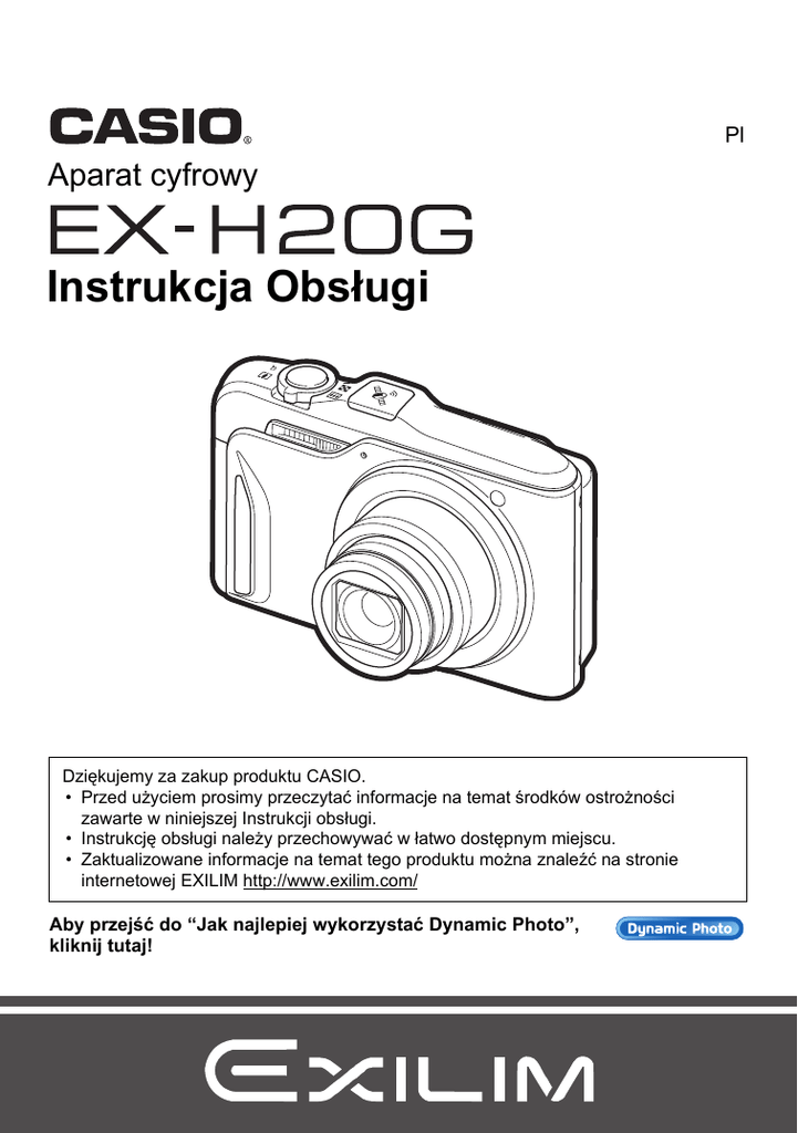 Pl Aparat cyfrowy Instrukcja Obsługi Dziękujemy za zakup produktu CASIO. • Przed użyciem prosimy przeczytać informacje na temat środków ostrożności zawarte w niniejszej Instrukcji obsługi. • Instrukcję obsługi należy przechowywać w łatwo dostępnym miejscu. • Zaktualizowane informacje na temat tego produktu można znaleźć na stronie internetowej EXILIM http://www.exilim.com/ Aby przejść do “Jak najlepiej wykorzystać Dynamic Photo”, kliknij tutaj! 1 Rozpakowanie Po rozpakowaniu aparatu, sprawdź czy wszystkie przedstawione poniżej akcesoria znajdują się w komplecie. Jeżeli zauważysz braki w wyposażeniu, skontaktuj się z punktem sprzedaży. Akumulator litowo-jonowy (NP-90) Aparat cyfrowy Aby przymocować pasek do aparatu Przymocuj 1 pasek w tym miejscu. * Kształt wtyczki przewodu zasilającego różni się w zależności od kraju lub obszaru geograficznego. 2 Przewód zasilający Kabel USB Ładowarka (BC-90L) Pasek Kabel AV CD-ROM 2 Skrócona instrukcja obsługi Koniecznie przeczytaj! • Treść niniejszego podręcznika oraz dołączonej Skróconej instrukcji obsługi może ulec zmianie bez powiadomienia. • Treść niniejszego podręcznika została skontrolowana na każdym etapie procesu produkcji. W przypadku zauważenia fragmentów budzących wątpliwości, błędów, itp., prosimy o kontakt. • Kopiowanie treści niniejszej Instrukcji obsługi, we fragmentach lub w całości, jest zabronione. Z wyjątkiem wykorzystania do celów osobistych, inne wykorzystanie treści tego podręcznika bez pozwolenia CASIO COMPUTER CO., LTD. jest zabronione na mocy praw autorskich. • Dane map, dane miejsc fotogenicznych oraz dane nazw miejsc dostarczone w pamięci aparatu przeznaczone są wyłącznie do użytku własnego. Wykorzystywanie ich do innych celów bez zgody prawowitego właściciela/i jest zakazane. • Dane map, dane rekomendowanych miejsc fotogenicznych i dane nazw miejsc wyświetlane przez aparat mogą nie zgadzać się z rzeczywistymi nazwami miejsc i nazwami własnymi. • CASIO COMPUTER CO., LTD. nie ponosi odpowiedzialności za wszelkie szkody lub utracone dochody poniesione przez nabywcę lub strony trzecie związane z użytkowaniem lub wadliwym działaniem niniejszego produktu. • Funkcja aparatu Hybrid-GPS została zaprojektowana i stworzona wyłącznie do użytku własnego w cyfrowym aparacie fotograficznym. Nie wolno jej nigdy używać jako instrumentu do nawigacji samolotu, pojazdu mechanicznego, nawigacji osobistej ani żadnego innego typu nawigacji lub pomiarów lądowych. CASIO nie ponosi żadnej odpowiedzialności za jakiekolwiek szkody poniesione na skutek prób wykorzystania informacji z niniejszego aparatu do ustalania położenia lub do innych celów wspomnianych powyżej. • CASIO COMPUTER CO., LTD. nie ponosi odpowiedzialności za wszelkie szkody, utraty dochodów oraz roszczenia poniesione przez nabywcę lub strony trzecie związane z użytkowaniem Photo Transport, Dynamic Photo Manager lub YouTube Uploader for CASIO. • CASIO COMPUTER CO., LTD. nie ponosi odpowiedzialności za wszelkie szkody lub utracone dochody spowodowane skasowaniem zawartości pamięci na skutek wadliwego działania, naprawy lub jakiegokolwiek innego powodu. • Prosimy pamiętać, że przykładowe ekrany i ilustracje produktu zamieszczone w niniejszej Instrukcji obsługi mogą różnić się nieznacznie od ekranów i konfiguracji prawdziwego aparatu. Monitor LCD Panel ciekłokrystaliczny ekranu monitora wykorzystuje wysokoprecyzyjną technologię, która zapewnia wydajność pikseli na poziomie ponad 99,99%. Oznacza to, że bardzo niewielka liczba pikseli może nie świecić się lub może świecić się przez cały czas. Wynika to z właściwości panelu ciekłokrystalicznego i nie oznacza wadliwego działania. Zrób kilka zdjęć próbnych Przed zrobieniem końcowego zdjęcia, wykonaj zdjęcie próbne, aby sprawdzić czy aparat nagrywa poprawnie. 3 Spis treści Rozpakowanie . . . . . . . . . . . . . . . . . . . . . . . . . . . . . . . . . . . . . . . . . . . . . . Koniecznie przeczytaj! . . . . . . . . . . . . . . . . . . . . . . . . . . . . . . . . . . . . . . . . Informacje ogólne . . . . . . . . . . . . . . . . . . . . . . . . . . . . . . . . . . . . . . . . . . . Zawartość ekranu monitora . . . . . . . . . . . . . . . . . . . . . . . . . . . . . . . . . . . . ... 2 ... 3 . . 10 . . 11 ❚❙ Szybki start 14 Co to jest aparat cyfrowy? . . . . . . . . . . . . . . . . . . . . . . . . . . . . . . . . . . . . . . . 14 Co można robić za pomocą aparatu CASIO . . . . . . . . . . . . . . . . . . . . . . . . . 15 Po pierwsze, przed użyciem naładuj akumulator. . . . . . . . . . . . . . . . . . . . . . 17 ❚ Aby naładować akumulator. . . . . . . . . . . . . . . . . . . . . . . . . . . . . . . . . . . . . . . . . 17 ❚ Aby włożyć akumulator . . . . . . . . . . . . . . . . . . . . . . . . . . . . . . . . . . . . . . . . . . . . 18 Konfigurowanie podstawowych ustawień przy pierwszym włączeniu aparatu . . . . . . . . . . . . . . . . . . . . . . . . . . . . . . . . . . . . . . . . . . . . . 20 Przygotowanie karty pamięci . . . . . . . . . . . . . . . . . . . . . . . . . . . . . . . . . . . . . 22 ❚ Obsługiwane karty pamięci . . . . . . . . . . . . . . . . . . . . . . . . . . . . . . . . . . . . . . . . . 22 ❚ Aby włożyć kartę pamięci . . . . . . . . . . . . . . . . . . . . . . . . . . . . . . . . . . . . . . . . . . 22 ❚ Aby sformatować nową kartę pamięci . . . . . . . . . . . . . . . . . . . . . . . . . . . . . . . . 23 Włączanie i wyłączanie zasilania aparatu . . . . . . . . . . . . . . . . . . . . . . . . . . . 24 ❚ Aby włączyć zasilanie . . . . . . . . . . . . . . . . . . . . . . . . . . . . . . . . . . . . . . . . . . . . . 24 ❚ Aby wyłączyć aparat . . . . . . . . . . . . . . . . . . . . . . . . . . . . . . . . . . . . . . . . . . . . . . 24 Prawidłowe trzymanie aparatu. . . . . . . . . . . . . . . . . . . 