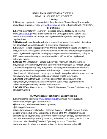 REGULAMIN KORZYSTANIA Z SERWISU ORAZ USŁUGI SMS MT „POBIERZ” I. Wstęp 1. Niniejszy regulamin (zwany dalej „Regulaminem”) określa ogólne zasady korzystania z usług serwisu www.obrazkovo.pl oraz Usługi SMS MT „POBIERZ”. II. Definicje 1. Serwis internetowy - „Serwis” - oznacza serwis, dostępny na stronie www.obrazkovo.pl wraz z treściami na niej udostępnionymi. Serwis jest przeznaczony do korzystania przez Użytkowników zgodnie z niniejszym regulaminem. 2. Użytkownik - osoba odwiedzająca stronę, która może korzystad z treści na niej zawartych w sposób zgodny z niniejszym regulaminem. 3. SMS MT - (Short Message Service Mobile Terminated) jest to wiadomośd SMS, która zostaje wysłana do użytkownika, w wykonaniu złożonego wcześniej przez użytkownika zgodnie z niniejszym Regulaminem zamówienia, który to SMS zawiera zamówioną przez użytkownika treśd, za którą użytkownik dokonuje opłaty. 4. Usługa MT „POBIERZ” - usługa subskrypcji Premium MT, którą może aktywowad wyłącznie Użytkownik telefonu komórkowego. W ramach usługi Użytkownik będzie trzy razy w tygodniu otrzymywał na telefon wiadomości zawierające treści ezoteryczne oraz informacje o nowościach na stronie obrazkovo.pl. Wiadomości dotyczące ezoteryki mają charakter humorystyczny i nie powinny byd traktowane jako wiarygodne źródło informacji. 5. SERWIS OBRAZKOVO.pl - serwis z contentem obrazkowym oraz rozrywkowym, umożliwiający aktywnym w subskrypcji użytkownikom pobieranie tapet na swój telefon lub komputer. 6. DOSTAWCA - Hastro Sp. z.o.o., 00-613 Warszawa, Tytusa Chałubioskiego 8, KRS 0000565124. III. Wymagania Techniczne. Zasady ogólne 1. Skorzystanie z serwisu www.obrazkovo.pl wymaga następujących minimalnych wymagao technicznych: a) komputer, lub inne mobilne urządzenie, b) Dostęp do Internetu, c) Zainstalowana przeglądarka – Internet Explorer, Mozilla Firefox, Opera, Google Chrome lub inna. Skorzystad z Usługi SMS MT „POBIERZ” mogą ponadto tylko użytkownicy telefonów komórkowych będący abonamentami sieci PTK Centertel Sp. z o.o. (ORANGE), Polkomtel S. A. (Plus), P4 Sp. z o. o. (Play) oraz sieci Polskiej Telefonii Cyfrowej Sp. z o.o.(T-Mobile) mający prawo do ich użytkowania w tym do korzystania z usług MT. 2. Użytkownicy zobowiązani są do korzystania z Serwisu w granicach obowiązującego w Polsce prawa, zgodnie z postanowieniami niniejszego Regulaminu oraz dobrymi obyczajami, w szczególności dotyczącymi korzystania z sieci internet. 3. Użytkownik w szczególności nie może: a) naruszad praw bądź zakłócad możliwości korzystania z Serwisu przez innych użytkowników; b) naruszad praw własności intelektualnej osób trzecich; c) korzystad z Serwisu w sposób, który może doprowadzid do naruszenia prawidłowego działania oferowanych w nim usług; 4. Poprzez zarejestrowanie się w serwisie www.obrazkovo.pl użytkownik akceptuje postanowienia niniejszego regulaminu oraz wyraża zgodę na otrzymywanie informacji o serwisie drogą elektroniczną na podany mail i numer telefonu oraz użytkownik wyraża zgodę na otrzymywanie informacji o nowościach a także treści reklamowych na maila i numer telefonu podanego podczas rozwiązywania testu. Użytkownik ma prawo w każdym czasie odwoład zgodę na otrzymywanie powyższych informacji poprzez zgłoszenie tego faktu administratorowi na adres mail [email protected]. IV. Uzyskanie dostępu do płatnych zasobów Serwisu 1. W celu skorzystania z płatnych zasobów serwisu Użytkownik powinien rozwiązad test, a następnie uruchomid usługę subskrypcji MT „POBIERZ”. 2. Aby uruchomid usługę subskrypcji MT „POBIERZ” Użytkownik powinien po rozwiązaniu testu, o którym mowa w ust.1 podad swój numer telefonu, dzięki czemu Użytkownik otrzyma specjalny kod PIN. Kod ten następnie Użytkownik powinien wprowadzid w formularzu, który pojawi się po ukooczeniu testu dzięki temu wprowadzeniu Użytkownik otrzyma również dostęp do strefy zawierającej wynik testu. Ponadto użytkownik może uruchomid usługę poprzez podanie swojego numeru telefonu, a następnie wysłanie wiadomości SMS o treści START POBIERZ na numer 60596. 3. Użytkownik w treści darmowej wiadomości SMS wysyłanej po rejestracji do usługi subskrypcji MT otrzyma bezpośredni link do pobrania regulaminu zamówionej usługi w aktualnej wersji wraz z informacją o potwierdzeniu zamówienia. 4.Użytkownik aktywujący subskrypcję usługi MT „POBIERZ” wyraża zgodę na otrzymywanie wiadomości z zamówioną treścią w częstotliwościach i o porach wskazanych w niniejszym Regulaminie na podany przez siebie numer telefonu. 5.Po aktywacji użytkownik otrzymuję wiadomośd powitalną. Koszt wiadomości powitalnej to 6,15 zł brutto. 6.Wiadomości będą wysyłane w poniedziałek, środę oraz piątek o godzinie 18:00. 7. Koszt usługi to 6,15 zł brutto za każdy SMS otrzymany w ramach subskrypcji. W ramach usługi Użytkownik otrzymuje maksymalnie trzy SMS na tydzieo oraz dodatkowy SMS po aktywacji subskrypcji. Łączny koszt usługi w okresie miesiąca to: 79,95zł brutto. Pobranie wybranych elementów multimedialnych może ponadto wiązad się z opłatami za transfer danych, zgodnie z cennikami operatora. 8. Usługa jest aktywowana na czas nieokreślony. 9. Użytkownik może w każdej chwili zrezygnowad z usługi. Aby dokonad rezygnacji należy wysład SMS o treści STOP POBIERZ na numer 60596. Koszt wysłania wiadomości jest zgodny z cennikiem operatora. 10. Usługa będzie dostępna od 24.06.2014 do odwołania. V. Prawo do odstąpienia od umowy Usługa MT „POBIERZ” jest aktywowana automatycznie po potwierdzenia wpłaty od Operatora SMS. Rozpoczęcie korzystania z usługi MT „POBIERZ”, oznacza żądanie świadczenia usługi przed upływem terminu odstąpienia od umowy tj. przed upływem 14 dni. Jest to równoznaczne z utratą przez Użytkownika prawa odstąpienia od umowy na usługę MT „POBIE