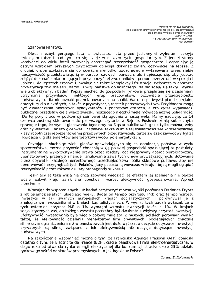 Tomasz E. Kołakowski "Nawet Marks był świadom, że żelaznych praw ekonomii nie da się przezwyciężyć za pomocą myślenia życzeniowego" Hans W. Sinn, Instytut Badań Ekonomicznych, Monachium Szanowni Państwo, Okres niezbyt gorącego lata, a zwłaszcza lata przed jesiennymi wyborami sprzyja refleksjom także i nad tym, co się dzieje w naszym życiu gospodarczym. Z jednej strony kandydaci do wielu foteli zaczynają dostrzegać rzeczywistość gospodarczą i ogarniając ją ostrym wzrokiem przyszłych zwycięzców obiecują dokonać zmian, oczywiście na lepsze. Z drugiej, grupa szykująca się do odejścia nie tylko podsumowuje wykreowaną przez siebie rzeczywistość przedstawiając ją w bardzo różowych barwach, ale i spiesząc się, aby jeszcze zdążyć dokonać zmian mogących przysporzyć jej zwolenników i pomóc przeczekać w spokoju i uśpieniu do lepszych czasów. Ujawniają się także kompleksy i frustracje, zwłaszcza w obszarze prywatyzacji tzw. majątku narodu i wizji państwa opiekuńczego. Na nic zdają się fakty i wyniki wielu obiektywnych badań. Popisy niechęci do gospodarki rynkowej przeplatają się z żądaniami utrzymania przywilejów niektórych grup pracowników, oczywiście przedsiębiorstw państwowych, dla niepoznaki przemianowanych na spółki. Walka o podwyżki płac i specjalne emerytury dla niektórych, a także z prywatyzacją resztek państwowych trwa. Przykładem mogą być oświadczenia niektórych syndykalistów z początków czerwca, a oto cytat wypowiedzi publicznej przedstawiciela władz związku noszącego niegdyś wiele mówiącą nazwę Solidarność: „Do tej pory prace w podkomisji sejmowej idą zgodnie z naszą wolą. Mamy nadzieję, że 14 czerwca zostaną skierowane do pierwszego czytania w Sejmie. Posłowie zdają sobie chyba sprawę z tego, że wyniki głosowania będziemy na Śląsku publikować, gdzie tylko można, żeby górnicy wiedzieli, jak kto głosował”. Zapewne, także w imię tej solidarności wielkoprzemysłowej klasy robotniczej reprezentowanej przez swoich przedstawicieli, tenże związek zawodowy był za likwidacją ulg dla emerytów energetyków i wdów po energetykach. Czytając i słuchając wielu głosów opowiadających się za dominacją państwa w życiu społeczeństwa, można przywołać chocholą wizję polskiej gospodarki spełniającej te postulaty. Instrumentalne wykorzystywanie prawa przez rozdęty, acz niesprawny aparat biurokratyczny, upaństwowiony przemysł i handel, anulowanie zawartych umów prywatyzacyjnych, dotowanie przez obywateli każdego nierentownego przedsiębiorstwa, półki sklepowe pustawe, aby nie denerwować i przygnębiać tych Polaków, jacy pozostaną wówczas w kraju i będą mogli oglądać rzeczywistość przez różowe okulary propagandy sukcesu. Tęskniący za taką wizją nie chcą zapewne wiedzieć, że efektem jej spełnienia nie będzie wcale rozkwit kraju, zanik sfer ubóstwa i wzrost efektywności gospodarowania. Wprost przeciwnie. Wracając do wspomnianych już badań przytoczyć można wyniki porównań Frederica Pryora z lat osiemdziesiątych ubiegłego wieku. Badał on tempo przyrostu PKB oraz tempo wzrostu inwestycji w tak zwanych europejskich krajach socjalistycznych i porównywał je z analogicznymi wskaźnikami w krajach kapitalistycznych. W wyniku tych badań wykazał, że w tych ostatnich przyrost PKB o 1% wymagał wzrostu inwestycji także o 1%. W krajach socjalistycznych zaś, do takiego wzrostu potrzebny był dwukrotnie większy przyrost inwestycji. Efektywność inwestowania była więc o połowę mniejsza. Z naszych, polskich porównań wynika także, że efektywność działania menedżerów firm prywatnych, podlegających znacznie silniejszym ograniczeniom niż w państwowych jest dużo wyższa, a decyzje dotyczące inwestycji prywatnych są silniej związane z ich efektywnością niż decyzje dotyczące inwestycji państwowych. Na zakończenie wspomnieć można o tym, że Francuska Agencja Prasowa (AFP) doniosła ostatnio o tym, że Electricité de France (EDF), ciągle państwowa firma elektroenergetyczna, w ciągu roku od otwarcia rynku energii elektrycznej dla konkurencji straciła około 25% udziału rynkowego wśród odbiorców przemysłowych. A jak będzie w Polsce? Tomasz E. Kołakowski