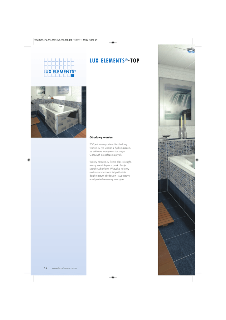 PRG2011_PL_05_TOP_lux_06_top.qxd 15.03.11 11:30 Seite 34 LUX ELEMENTS ® -TOP Obudowy wanien TOP jest rozwiązaniem dla obudowy wanien, w tym wanien z hydromasażem, ze stali oraz tworzywa sztucznego. Gotowych do położenia płytek. Wanny narożne, w formie elips i okrągłe, wanny sześciokątne – rynek oferuje szeroki wybór form. Wszystkie te formy można zaaranżować indywidualnie dzięki naszym obudowom i wyposażyć w odpowiednie otwory rewizyjne. 34 www.luxelements.com PRG2011_PL_05_TOP_lux_06_top.qxd 15.03.11 11:30 Seite 35 35 PRG2011_PL_05_TOP_lux_06_top.qxd 15.03.11 11:30 Seite 36 LUX ELEMENTS ®-TOP Formy wanien Firma LUX ELEMENTS oferuje obudowy wanien dla standardowych wanien prostokątnych, wanien częściowo (ćwierć) zaokrąglonych, elipsowych oraz sześciokątnych. Prostokątne Zaokrąglone Wymiary a Strona podłużna, wanny do 1700 mm Strona podłużna, wanny do 1800 mm Strona podłużna, wanny do 2100 mm Strona poprzeczna, wanny do 1700 mm Strona poprzeczna, wanny do 2100 mm 1685 mm 1785 mm 2100 mm Elipsa b Wymiary a, b Maksymalna długość ramienia wanny 1600 mm 800 mm 900 mm Sześciokąt Wymiary a, b Wymiary a, b maksymalna długość boku 2100 mm, maksymalna długość boku 1000 mm maksymalna długość wanny 2100 mm, maksymalna długość wanny 1000 mm 36 www.luxelements.com PRG2011_PL_05_TOP_lux_06_top.qxd 15.03.11 11:30 Seite 37 LUX ELEMENTS ®-TOP Wzory – Design Oferujemy cztery różne wzory dla obudowy wanien i wanien z hydromasażem: Elementy obudowy dla gładkiej i zwięzłej obudowy wanien Elementy obudowy ze stopniem Elementy obudowy z występem Elementy obudowy ze stopniem oraz występem Warianty oraz możliwości zabudowy Poniżej proponujemy różne zabudowy ze względu na kształt wanny oraz 4 wersje wzornictwa: Prostokątne Wolnostojące Zabudowa we wnęce Zaokrąglone Elipsa Wolnostojące Sześciokąt Wolnostojące Zabudowa we wnęce Zabudowa narożna Zabudowa 3-stronna Zabudowa narożna, lewa Zabudowa narożna, prawa Zabudowa narożna, lewa Zabudowa narożna, prawa Zabudowa narożna, skośna Zabudowa narożna, lewa Zabudowa z półką Zabudowa narożna, prawa 37 PRG2011_PL_05_TOP_lux_06_top.qxd 15.03.11 11:30 Seite 38 LUX ELEMENTS ®-TOP Obudowy wanien z hydromasażem Produkujemy obudowy dla wanien z hydromasażem w wersjach „z występem” oraz „stopniem/występem” do zabudowy w następujących wariantach: „wolnostojącym”, „wnękowym”, „narożnym”, „3-stronnym” – standardowo lub na wymiar. Otwór doprowadzenia powietrza może zostać wykonany wg życzeń klienta. Dla celów konserwacji i naprawy do wyboru są dwie techniki do otworów rewizyjnych. z występem stopniem/występem Wolnostojące Zabudowa we wnęce Zabudowa narożna Zabudowa 3-stronna Techniki do otworów rewizyjnych Technika: MONT-TOPREV Prosta, szybka i elastyczna technika dla wszystkich wariantów TOP. Po montażu obudowy wanny należy wykonać wycięcie pod otwór rewizyjny w pożądanym miejscu, o pożądanej wielkości, pasujące do siatki fug zastosowanej do płytek. Nałożyć profile mocujące MONT-TOPREV u góry i u dołu, wcisnąć wycięty element na ww. profile. Ukończyć układanie płytek, spoinę zamknąć, analogicznie jak w przypadku wycięcia, przy użyciu sylikonu. Podczas używania otworu rewizyjnego, silikon naciąć. MONT-TOPREV Technika: TOP-REVR Technika do obudowywania wanien z hydromasażem dla wersji z występem oraz stopniem/występem oraz wszystkich wanien na zamówienie. Otwór rewizyjny wykonywany po stronie poprzecznej lub podłużnej, w dowolnej wielkości, wg. życzeń klienta. Przez ukształtowanie niszy otrzymujemy całkowitą dowolność aranżacji oraz niezależność od stosowanego układu płytek. Możliwość szybkiego otwierania i zamykania otworu rewizyjnego przez zamknięcie magnetyczne. TOP-REVR 38 www.luxelements.com PRG2011_PL_05_TOP_lux_06_top.qxd 15.03.11 11:30 Seite 39 LUX ELEMENTS ®-TOP Pomoce montażowe TOP-WA – Pomoce montażowe do wanien, włącznie z akcesoriami TOP-AN – Pomoce montażowe do elementów obudowy, włącznie z akcesoriami. TOP-KIT – Dla wanien o formach: narożna, elipsa, sześciokąt oferowane są kompletne zestawy montażowe ze wszystkimi wymaganymi akcesoriami rozwiązań systemowych. TOP-WA TOP-AN TOP-KIT Podesty stopniowe TOP-KST – Podesty stopniowe z materiału pełnego, proste i zaokrąglone, do wszystkich form wanien. TOP-KST-… TOP-KST-KS 39 PRG2011_PL_05_TOP_lux_06_top.qxd 15.03.11 11:30 Seite 40 LUX ELEMENTS ®-TOP Dane produktu i opakowania – LUX ELEMENTS®-TOP (Wanny standardowe) TOP-TRS TOP-TRS TOP-WA TOP-AN TOP-TRU TOP-KST-TRS TOP-TRU Dane produktu Numer artykułu Nazwa artykułu Opis artykułu Wymiary Szerokość x Głębokość x Grubość Jednostka LTOPE1002 LTOPE1004 LTOPE1054 LTOPE1006 TOP-TRS 1685 S TOP-TRS 1785 S TOP-TRS 1860 S TOP-TRS 2100 S 1685 x 600 x 30 mm 1785 x 600 x 30 mm 1860 x 600 x 30 mm 2100 x 600 x 30 mm Sztuk Sztuk Sztuk Sztuk LTOPE1010 LTOPE1055 LTOPE1011 LTOPE1032 LTOPE1033 LTOPE1050 TOP-TRS 800 S TOP-TRS 900 S TOP-KST-TRS TOP-WA 1000 TOP-WA 500 TOP-AN 800 x 600 x 30 mm 900 x 600 x 30 mm maksymalną wysokością 200, głębokością 300 mm 1000 x 100 x 50 mm 500 x 100 x 50 mm 500 x 50 x 50 mm Sztuk Sztuk mb Zestaw Zestaw Zestaw LTOPE1017 TOP-TRU 2100 S 2100 x 600 x 30 mm Sztuk LTOPE1021 LTOPE1032 LTOPE1033 LTOPE1050 TOP-TRU 900 S TOP-WA 1000 TOP-WA 500 TOP-AN Obudowy dla wanien do 1700 mm Obudowy dla wanien do 1800 mm Obudowy dla wanien do 1900 mm Obudowy dla wanien do 2100 mm lub wanien z czołową półką Obudowa wanny do strony poprzecznej Obudowa wanny do strony poprzecznej Podest stopniowy do wszystkich wanien standardowych Pomoce montażowe do wanien, włącznie z akcesoriami (3 szt. FIX-FID 110) Pomoce montażowe do wanien, włącznie z akcesoriami (2 szt. FIX-FID 110) Pomoce montażowe do elementów obudowy, 2 ograniczniki EL 50 z 2 szt. FIX-FID 110 każdy obudowa wanien ze stopniem dla wanien do 2100 mm lub wanien z czołową