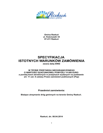 Gmina Rzekuń ul. Kościuszki 33 07-411 Rzekuń SPECYFIKACJA ISTOTNYCH WARUNKÓW ZAMÓWIENIA zwana dalej SIWZ W TRYBIE PRZETARGU NIEOGRANICZONEGO O WARTOŚCI SZACUNKOWEJ POWYŻEJ 14 000 EURO a poniżej kwot określonych w przepisach wydanych na podstawie art. 11 ust. 8 ustawy Prawo zamówień publicznych (Pzp) Przedmiot zamówienia: Bieżące utrzymanie dróg gminnych na terenie Gminy Rzekuń. Rzekuń, dn. 08.04.2014 1 Rozdział I. NAZWA I ADRES ZAMAWIAJĄCEGO. Zamawiającym jest: Nazwa: Adres: Adres poczty elektronicznej: Strona internetowa: Numer telefonu: Numer faksu: Godziny urzędowania: Gmina Rzekuń 07-411 Rzekuń, ul. Kościuszki 33 [email protected] www.rzekun.pl (29) 761 73 01 wew. 149 (29) 643 20 93 pn, śr, cz, od 745 do 1545 wt 745 do 1700 pt 745 do 1300 Rozdział II. TRYB UDZIELENIA ZAMÓWIENIA. Postępowanie o udzielenie zamówienia publicznego prowadzone jest w trybie przetargu nieograniczonego zgodnie z art. 10 ust.1 oraz art. 39-46 ustawy z dnia 29 stycznia 2004 r. Prawo zamówień publicznych (Pzp). Podstawa prawna opracowania specyfikacji istotnych warunków zamówienia: 1. Ustawa Pzp ( Dz. U. z 2013 r. poz. 907, 984,1047, 1473). 2. Rozporządzenie Prezesa Rady Ministrów z dnia 19 lutego 2013 r. w sprawie rodzajów dokumentów jakich może żądać zamawiający od wykonawcy, oraz form, w jakich te dokumenty mogą być składane ( Dz. U. z 2013 r., poz. 231), 3. Rozporządzenie Prezesa Rady Ministrów z dnia 23 grudnia 2013 r. w sprawie średniego kursu złotego w stosunku do euro, stanowiącego podstawę przeliczania wartości zamówień publicznych ( Dz. U. z 2013 r. poz.1692). 4. Ustawa z dnia 16 kwietnia 1993 r. o zwalczaniu nieuczciwej konkurencji (Dz. U. z 2003r. Nr 153, poz. 1503 z późn. zm.), 5. Ustawy z dnia 29 sierpnia 1997 r. o ochronie danych osobowych ( Dz. U. z 2002r. Nr 101, poz. 926 z późn. zm.), 6. Ustawa z dnia 16 lutego 2007 r. o ochronie konkurencji i konsumentów ( Dz.U. Nr 50, poz. 331, z późn. zm.) 7. Kodeks cywilny. Rozdział III. OPIS PRZEDMIOTU ZAMÓWIENIA. Oznaczenie wg Wspólnego Słownika Zamówień: 14210000-6 Żwir, piasek, kamień kruszony i kruszywo 14212120-7 Źwir 14212200-2 Kruszywo 2 1. Przedmiotem zamówienia jest usługa polegająca na dostawie mieszanki żwirowej na bieżące utrzymanie dróg gminnych na terenie Gminy Rzekuń w 2014 r. wraz z transportem rozplantowaniem i przygotowaniem podłoża pod nawierzchnię mieszanki żwirowej. przygotowaniem Zakres podłoża pod zadania obejmuje nawierzchnię dostawę, mieszanki załadunek, żwirowej, transport i wbudowanie mieszanki żwirowej przez Wykonawcę w miejscu wskazanym przez Zamawiającego, znajdującym się na terenie gminy Rzekuń. Przewidywana wielkość zamówienia to 3760 m³ mieszanki żwirowej. Parametry mieszanki żwirowej zostały określone w załączonej Szczegółowej Specyfikacji Technicznej Wykonania i Odbioru Robót - załącznik nr 7. Wykonawca przed przystąpieniem do wykonania pierwszej dostawy dostarczy Zamawiającemu laboratoryjne badanie mieszanki żwirowej do akceptacji Zamawiającemu (w razie wątpliwości co do jakości mieszanki żwirowej, Zamawiający może zlecić powtórne badania kontrolne dostarczonej mieszanki żwirowej, na koszt Wykonawcy. Wykonawca będzie zobowiązany do dokonania wykonania usługi dostawy wraz z wbudowaniem i przygotowaniem podłoża pod nawierzchnię mieszanki żwirowej określonej pisemnie partii kruszyw w ciągu 3 dni od daty przekazania przez Zamawiającego stosownego zapotrzebowania. Rozliczenie za wykonaną dostawę będzie się odbywać w cyklu kwartalnym. Podstawą do wystawienia faktury za dany kwartał będą protokoły odbioru kruszywa, podpisane przez uprawnionego pracownika Urzędu Gminy Rzekuń, który każdorazowo będzie stwierdzał ilość, jakość i rodzaj kruszywa w wykonanych dostawach częściowych. 2. Wykonawca zapewni wykonanie usługi polegającej na dostawie mieszanki żwirowej na bieżące utrzymanie dróg gminnych na terenie Gminy Rzekuń w 2014r. wraz z transportem rozplantowaniem i przygotowaniem podłoża pod nawierzchnię mieszanki żwirowej w terminie nie dłuższym niż 3 dni od daty zgłoszenia zamówienia w godzinach pracy Urzędu Gminy w Rzekuniu tj. pn, śr, cz, od 745 do 1545 ,wt 745 do 1700 , pt 745 do 1300 na wskazane drogi na terenie Gminy Rzekuń. 3. Zamawiający zastrzega sobie możliwość zmniejszenia ilości zakupu usługi polegającej na dostawie mieszanki żwirowej na bieżące utrzymanie dróg gminnych na terenie Gminy Rzekuń w 2014r. wraz z transportem rozplantowaniem i przygotowaniem podłoża pod nawierzchnię mieszanki żwirowej w Rozdziale III pkt 1.SIWZ będącej przedmiotem niniejszej umowy. 3 określonego 4. Wykonawca oświadcza, że nie będzie wnosił roszczeń względem Zamawiającego z tytułu zmniejszenia ilości mieszanki żwirowej określonej w Rozdziale III pkt 1.SIWZ, niniejszej umowy. 5. Na dzień podpisania umowy oraz na każde żądanie Wykonawca przedstawi Zamawiającemu do wglądu dokument potwierdzający, że zakupiona mieszanka żwirowa pochodzi ze żwirowni posiadającej koncesję na wydobycie żwiru. Rozdział IV. TERMIN WYKONANIA ZAMÓWIENIA . Termin realizacji zamówienia ustala się do dnia 31.12.2014 roku Rozdział V. WARUNKI UDZIAŁU W POSTĘPOWANIU ORAZ OPIS SPOSOBU DOKONYWANIA OCENY SPEŁNIANIA TYCH WARUNKÓW: 1.O udzielenie zamówienia mogą ubiegać się wszyscy Wykonawcy, którzy : 1) spełniają warunki określone w art. 22 ust.1 ustawy – Pzp, dotyczące: a) posiadania uprawnienia do wykonywania określonej działalności lub czynności, jeżeli przepisy prawa nakładają obowiązek ich posiadania, b) posiadania wiedzy i doświadczenia, tj. wykonali w okresie trzech lat minimum: • jedną usługę polegającą na dostawie mieszanki żwirowej. c) dysponowania odpowiednim potencjałem technicznym oraz osobami zdolnymi do wykonania zamówienia, d) znajdują się w sytuacji ekonomicznej i finansowej zapewniającej wykonanie zamówieni
