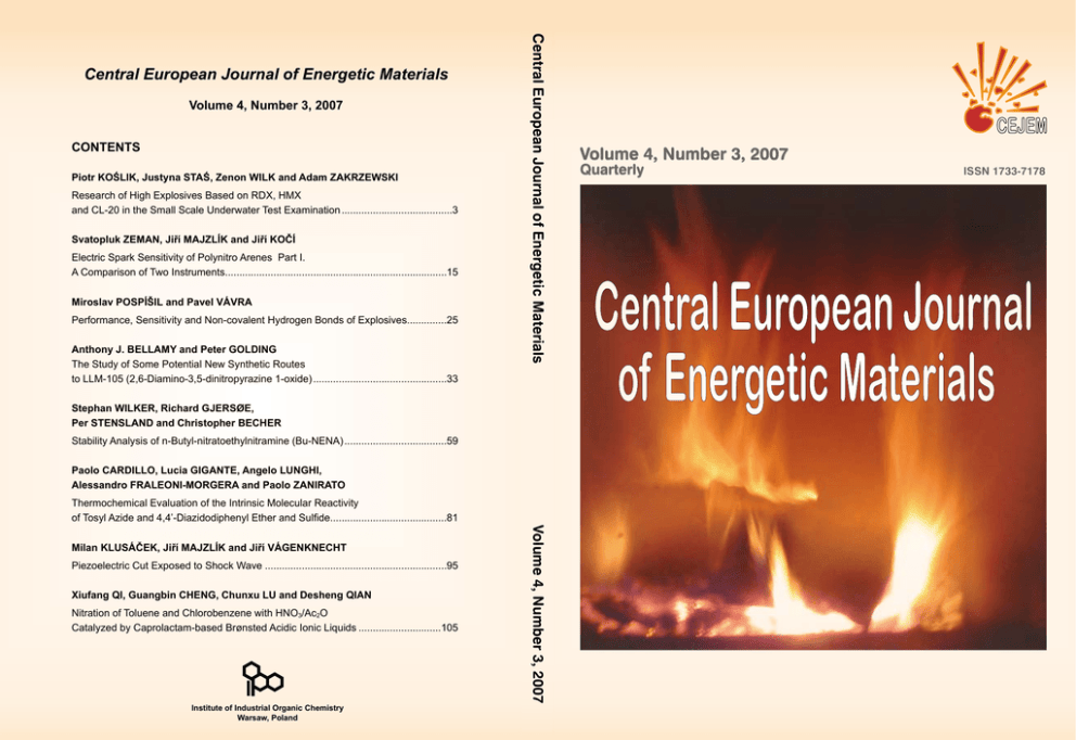 Volume 4, Number 3, 2007 CONTENTS Piotr KOŚLIK, Justyna STAŚ, Zenon WILK and Adam ZAKRZEWSKI Research of High Explosives Based on RDX, HMX and CL-20 in the Small Scale Underwater Test Examination........................................3 Svatopluk Zeman, Jiří Majzlík and Jiří Kočí Electric Spark Sensitivity of Polynitro Arenes Part I. A Comparison of Two Instruments...............................................................................15 Miroslav PospíšiL and Pavel VÁVRA Performance, Sensitivity and Non-covalent Hydrogen Bonds of Explosives..............25 Anthony J. BELLAMY and Peter GOLDING The Study of Some Potential New Synthetic Routes to LLM-105 (2,6-Diamino-3,5-dinitropyrazine 1-oxide)................................................33 Central European Journal of Energetic Materials Central European Journal of Energetic Materials Stephan WILKER, Richard GJERSØE, Per STENSLAND and Christopher BECHER Stability Analysis of n-Butyl-nitratoethylnitramine (Bu-NENA).....................................59 Paolo CARDILLO, Lucia GIGANTE, Angelo LUNGHI, Alessandro FRALEONI-MORGERA and Paolo ZANIRATO Thermochemical Evaluation of the Intrinsic Molecular Reactivity of Tosyl Azide and 4,4’-Diazidodiphenyl Ether and Sulfide..........................................81 Piezoelectric Cut Exposed to Shock Wave.................................................................95 Xiufang QI, Guangbin CHENG, Chunxu LU and Desheng QIAN Nitration of Toluene and Chlorobenzene with HNO3/Ac2O Catalyzed by Caprolactam-based Brønsted Acidic Ionic Liquids..............................105 Institute of Industrial Organic Chemistry Warsaw, Poland Volume 4, Number 3, 2007 Milan KLUSÁČEK, Jiří MAJZLÍK and Jiří VÁGENKNECHT Volume 4, Number 3, 2007 Quarterly ISSN 1733-7178