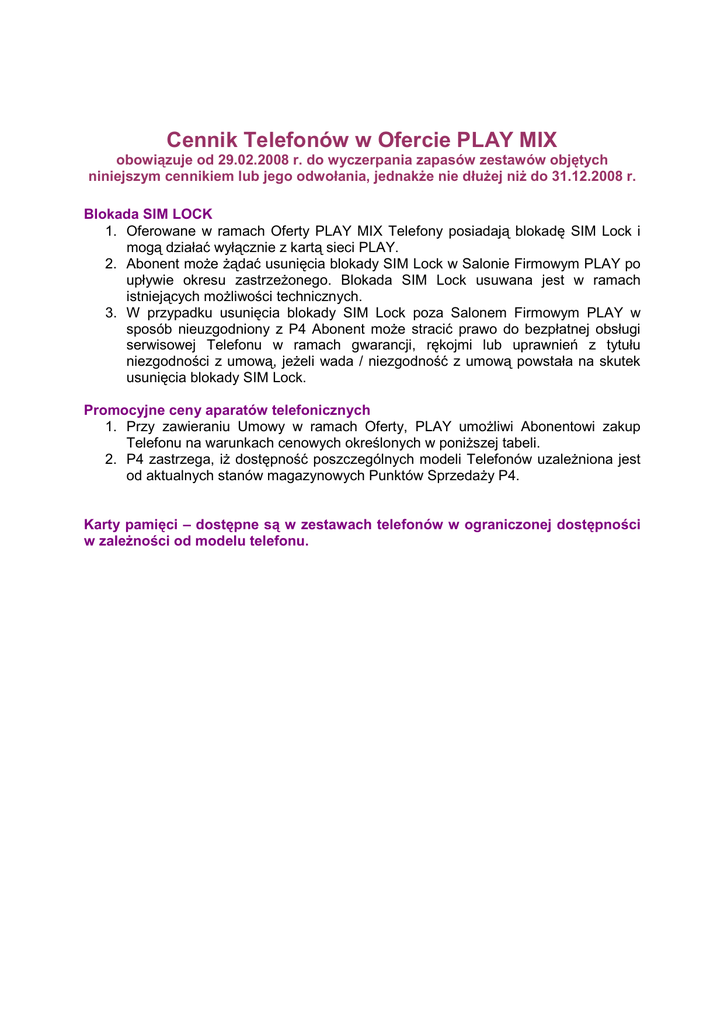 Cennik Telefonów w Ofercie PLAY MIX obowiązuje od 29.02.2008 r. do wyczerpania zapasów zestawów objętych niniejszym cennikiem lub jego odwołania, jednakŜe nie dłuŜej niŜ do 31.12.2008 r. Blokada SIM LOCK 1. Oferowane w ramach Oferty PLAY MIX Telefony posiadają blokadę SIM Lock i mogą działać wyłącznie z kartą sieci PLAY. 2. Abonent moŜe Ŝądać usunięcia blokady SIM Lock w Salonie Firmowym PLAY po upływie okresu zastrzeŜonego. Blokada SIM Lock usuwana jest w ramach istniejących moŜliwości technicznych. 3. W przypadku usunięcia blokady SIM Lock poza Salonem Firmowym PLAY w sposób nieuzgodniony z P4 Abonent moŜe stracić prawo do bezpłatnej obsługi serwisowej Telefonu w ramach gwarancji, rękojmi lub uprawnień z tytułu niezgodności z umową, jeŜeli wada / niezgodność z umową powstała na skutek usunięcia blokady SIM Lock. Promocyjne ceny aparatów telefonicznych 1. Przy zawieraniu Umowy w ramach Oferty, PLAY umoŜliwi Abonentowi zakup Telefonu na warunkach cenowych określonych w poniŜszej tabeli. 2. P4 zastrzega, iŜ dostępność poszczególnych modeli Telefonów uzaleŜniona jest od aktualnych stanów magazynowych Punktów SprzedaŜy P4. Karty pamięci – dostępne są w zestawach telefonów w ograniczonej dostępności w zaleŜności od modelu telefonu. Play MIX Producent LG Model KU990 wraz z kartą pamięci 1GB K3 wraz z kartą pamięci 1GB 24 miesiące 36 miesiące 1349 PLN 1 249 PLN 669 PLN 569 PLN 569 PLN 469 PLN 799 PLN 699 PLN 1199 PLN 1099 PLN 299 PLN 49 PLN 529 PLN 429 PLN 699 PLN 599 PLN 2 599 PLN 2 499 PLN 1 349 PLN 1 249 PLN 999 PLN 899 PLN 299 PLN 199 PLN 649PLN 549 PLN 869 PLN 769 PLN 1 349 PLN 1 249 PLN 549 PLN 499 PLN 1099 PLN 999 PLN 599 PLN 499PLN 1199 PLN 1099 PN V6 maxx Motorola wraz z kartą pamięci 1GB V9 Z8 wraz z kartą pamięci 512MB 6151 wraz z kartą pamięci 512MB 6288 wraz z kartą pamięci 512MB Nokia E51 wraz z kartą pamięci 1GB E90 wraz z kartą pamięci 512MB Samsung Sony Ericsson Toshiba F500 wraz z kartą pamięci 1GB G800 SGH-L760 wraz z kartą pamięci 1GB U700 wraz z kartą pamięci 1GB SGH-i600 wraz z kartą pamięci 1GB P1 wraz z kartą pamięci 1GB K800i wraz z kartą pamięci 1GB K850i wraz z kartą pamięci 512MB G500 G900 wraz z kartą pamięci mini SD 1GB Opłata za telefony podana jest w złotych i zawiera podatek VAT. Oferta telefonów o ograniczonej dostępności: Producent Nokia Samsung Motorola Model N76 wraz z kartą pamięci 1GB SGH-Z370 wraz z kartą pamięci 512MB SGH-Z630 wraz z kartą pamięci 512MB V3xx wraz z kartą pamięci 1GB i zestawem słuchawkowym Bluetooth HT820 Opłata za telefony podana jest w złotych i zawiera podatek VAT. 24 miesiące 36 miesiące 1269 PLN 1169 PLN 199 PN 99 PLN 599 PLN 499 PLN 999 PLN 899 PLN