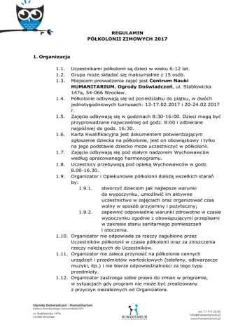REGULAMIN PÓŁKOLONII ZIMOWYCH 2017 1. Organizacja 1.1. 1.2. 1.3. Uczestnikami półkolonii są dzieci w wieku 6-12 lat. Grupa może składać się maksymalnie z 15 osób. Miejscem prowadzenia zajęć jest Centrum Nauki HUMANITARIUM. Ogrody Doświadczeń, ul. Stabłowicka 147a, 54-066 Wrocław. 1.4. Półkolonie odbywają się od poniedziałku do piątku, w dwóch jednotygodniowych turnusach: 13-17.02.2017 i 20-24.02.2017 r. 1.5. Zajęcia odbywają się w godzinach 8:30-16:00. Dzieci mogą być przyprowadzane najwcześniej od godz. 8:00 i odbierane najpóźniej do godz. 16:30. 1.6. Karta Kwalifikacyjna jest dokumentem potwierdzającym zgłoszenie dziecka na półkolonie, jest on obowiązkowy i tylko na jego podstawie dziecko może uczestniczyć w półkolonii. 1.7. Zajęcia odbywają się pod stałym nadzorem Wychowawców według opracowanego harmonogramu. 1.8. Uczestnicy przebywają pod opieką Wychowawców w godz. 8.00-16.30. 1.9. Organizator i Opiekunowie półkolonii dołożą wszelkich starań by: 1.9.1. stworzyć dzieciom jak najlepsze warunki do wypoczynku, umożliwić im aktywne uczestnictwo w zajęciach oraz organizować czas wolny w sposób przyjemny i pożyteczny; 1.9.2. zapewnić odpowiednie warunki zdrowotne w czasie wypoczynku zgodnie z obowiązującymi przepisami w zakresie stanu sanitarnego pomieszczeń i otoczenia. 1.10. Organizator nie odpowiada za rzeczy zagubione przez Uczestników półkolonii w czasie półkolonii oraz za zniszczenia rzeczy należących do Uczestników. 1.11. Organizator nie zaleca przynosić na półkolonie cennych urządzeń i przedmiotów wartościowych (telefony, odtwarzacze muzyki, itp.) i nie bierze odpowiedzialności za tego typu przedmioty. 1.12. Organizator zastrzega sobie prawo do zmian w programie, w sytuacjach gdy program nie może być zrealizowany z przyczyn niezależnych od Organizatora. 1.13. Organizator zobowiązuje się do natychmiastowego powiadomienia Rodziców/Opiekunów Prawnych o zaistniałych wypadkach, urazach i problemach wychowawczych. 1.14. Plan zajęć sporządzany jest przez Kierownika i Wychowawców półkolonii. 1.15. Organizator zapewnia wyżywienie (tj. śniadanie, obiad, deser i napój) tylko tym Uczestnikom, którzy wykupili półkolonię z opcją cateringu. 1.16. Uczestnicy mogą przynosić własne napoje, kanapki lub inne wyżywienie. Organizator jednak nie zapewnia ich przechowywania i podgrzewania. 1.17. Organizator zapewnia gry planszowe, akcesoria sportowe oraz materiały plastyczne niezbędne do przeprowadzenia zajęć. 2. Płatności 2.1. 2.2. Rodzic/Opiekun Prawny zobowiązany jest do uiszczenia opłaty za udział dziecka w półkolonii. Opłata może być uiszczona w dwóch transzach, tj. Transza I (50% wartości ceny) do dwóch dni od dokonania rezerwacji drogą telefoniczną (71 734 70 00) lub mailową ([email protected]). Transza II (50% wartości ceny) do 10.02.2016 r. Transza I jest bezzwrotną opłatą rezerwacyjną. 3. Kadra 3.1. 3.2. 3.3. 3.4. Kierownik półkolonii jest osobą koordynującą całość wypoczynku. Jego obowiązkiem jest czuwać nad zgodnością wypoczynku z obowiązującymi przepisami. Kierownik oraz Wychowawcy posiadają kwalifikacje zgodnie z rozporządzeniem Ministra Edukacji Narodowej w sprawie warunków, jakie muszą spełniać organizatorzy wypoczynku dla dzieci i młodzieży z dnia 21.01.1997 r. z późniejszymi zmianami. Opiekun ma obowiązek: 3.3.1. zapoznać się z Kartami Kwalifikacyjnymi Uczestników wypoczynku; 3.3.2. prowadzić Dziennik Zajęć; 3.3.3. prowadzić zajęcia zgodnie z rozkładem dnia; 3.3.4. pilnować Uczestników i nie pozostawiać ich bez opieki; 3.3.5. zapewnić bezpieczeństwo Uczestnikom wypoczynku; 3.3.6. szanować godność każdego Uczestnika półkolonii. Po zakończeniu programu półkolonii Wychowawca ma obowiązek dostarczyć do Kierownika uzupełnione Karty Uczestników wraz z prowadzonym Dziennikiem Zajęć. Kierownik po sprawdzeniu tych dokumentów ma obowiązek dostarczyć je do Organizatora półkolonii. 4. Rodzice/Opiekunowie Prawni: 4.1. nie uczestniczą czynnie w zajęciach organizowanych w ramach półkolonii; 4.2. są zobowiązani do punktualnego przyprowadzania i odbierania dzieci zgodnie z planem zajęć, oraz odnotowania tego faktu w Karcie Wejść i Wyjść u Wychowawcy grupy; 4.3. są odpowiedzialni za bezpieczną drogę dziecka do miejsca wypoczynku i z powrotem; 4.4. w razie konieczności zobowiązani są wskazać Osoby Upoważnione, które mogą odbierać dziecko z półkolonii i zawrzeć te informacje w Karcie Kwalifikacyjnej. 4.5. w przypadku zgody na samodzielne przychodzenie Uczestnika na zajęcia i powrotu z zajęć do domu, zobowiązani są zawrzeć tę informację w Karcie Kwalifikacyjnej. Uczestnik taki zobowiązany jest do odnotowania swojego wyjścia w Karcie Wejść i Wyjść u Wychowawcy grupy. 4.6. wyrażają zgodę na nieodpłatne utrwalenie wizerunku dziecka w formie fotografii i/lub filmu przez HUMANITARIUM w trakcie każdego dnia półkolonii oraz jego publikację dla potrzeb informacyjnych za pośrednictwem dowolnego medium. 5. Uczestnicy 5.1. Uczestnicy mają prawo do: 5.1.1. spokojnego, radosnego i bezpiecznego wypoczynku; 5.1.2. uczestniczenia we wszystkich zajęciach organizowanych podczas półkolonii; 5.1.3. wnoszenia próśb i skarg do Wychowawców; 5.1.4. uzyskania niezbędnej pomocy od Wychowawców lub Kierownika półkolonii. 5.2. Uczestnicy mają obowiązek: 5.2.1. wykonywać polecenia kadry prowadzącej zajęcia; 5.2.2. przestrzegać regulaminów i aktualnie obowiązujących przepisów prawa; 5.2.3. dbać o czystość i porządek; 5.2.4. przestrzegać zasady BHP i ppoż., a w razie dostrzeżenia sytuacji stwarzającej zagrożenie dla życia i zdrowia innych, informować Wychowawcę; 5.2.5. zgłaszać Wychowawcy chęć każdorazowego oddalenia się od grupy i Wychowawcy (np. wyjście 5.3. 5.4. 5.5. 5.6. 5.7. 5.8. 5.9. do toalety i innych obiektów na terenie HUMANITARIUM); 5.2.6. zgłaszać Wy