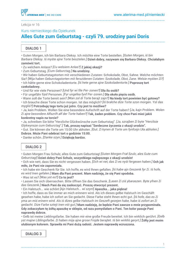 www.aterima-med.pl/niemiecki Lekcja nr 16 Kurs niemieckiego dla Opiekunek Alles Gute zum Geburtstag - czyli 79. urodziny pani Doris DIALOG 1 • Guten Morgen, ich bin Barbara Oleksy. Ich möchte eine Torte bestellen. [Guten Morgen, iś bin Barbara Oleksy. Iś myśte ajne Torte besztelen.] Dzień dobry, nazywam się Barbara Oleksy. Chciałabym zamówić tort. • Zu welchem Anlass? [Cu welsiem Anlas?] Z jakiej okazji? • Zum Geburtstag. [Cum Geburctag.] Na urodziny. • Wir haben Geburtstagstorten mit verschiedenen Zutaten: Schokolade, Obst, Sahne. Welche möchten Sie? [Wija haben Geburctagstorten mit ferszidenen Cutaten: Szokolade, Obst, Zane. Welsie myśten Zi?] • Ich hätte gerne eine Schokoladentorte. [Iś hete gerne ajne Szokoladentorte.] Poproszę tort czekoladowy. • Und für wie viele Personen? [Und fyr wi file Per-zonen?] Dla ilu osób? • Für ungefähr fünf Personen. [Fyr ungefea fynf Per-zonen.] Dla około pięciu osób. • Wann soll die Torte bereit sein? [Wan zol di Torte berajt zajn?] Na kiedy tort powinien być gotowy? • Ich brauche diese Torte schon morgen. Ist das möglich? [Iś brałche dize Torte szon morgen. Yst das mygliś?] Potrzebuję tego tortu już jutro. Czy jest to możliwe? • Ja, kein Problem. Wollen Sie eine besondere Aufschrift auf der Torte haben? [Ja, kajn Problem. Wolen Zi ajne bezondere Ałfszrift ałf der Torte haben?] Tak, żaden problem. Czy chce Pani mieć jakiś konkretny napis na torcie? • Ja, schreiben Sie bitte "Herzliche Glückwünsche zum Geburtstag". [Ja, szrajben Zi byte "Herclisie Glykwynsze cum Geburctag".] Tak, proszę napisać "Serdeczne życzenia z okazji urodzin". • Gut. Sie können die Torte um 15:00 Uhr abholen. [Gut. Zi kynen di Torte um fynfcejn Uła abholen.] Dobrze. Może Pani odebrać tort o godzinie 15:00. • Danke schön. [Danke szyn.] Dziękuję bardzo. DIALOG 2 • Guten Morgen Frau Schulz, alles Gute zum Geburtstag! [Guten Morgen Frał Szulc, ales Gute cum Geburctag!] Dzień dobry Pani Schulz, wszystkiego najlepszego z okazji urodzin! • Och wie nett, dass Sie es nicht vergessen haben. [Och wi net, das Zi es nyśt fergesen haben.] Och jak miło, że Pani nie zapomniała. • Ich habe ein Geschenk für Sie. Ich hoffe, es wird Ihnen gefallen. [Iś habe ajn Geszenk fyr Zi. Iś hofe, es wird Inen gefalen.] Mam dla Pani prezent. Mam nadzieję, że się Pani spodoba. • Was ist es? [Was yst es?] Co to jest? • Lassen Sie sich überraschen. Bitte öffnen Sie das Geschenk. [Lasen Zi ziś ybaraszen. Byte yfnen Zi das Geszenk.] Niech Pani da się zaskoczyć. Proszę otworzyć prezent. • Ein Halstuch... wie schön! [Ajn Halstuch... wi szyn!] Apaszka... jaka piękna! • Ich hoffe, dass es Sie immer an mich erinnern wird. Als ich dieses gelbe Halstuch im Geschäft gesehen habe, habe ich sofort an Sie gedacht. Diese Farbe steht Ihnen echt gut. [Iś hofe, das es Zi yma an miś erinern wird. Als iś dizes gelbe Halstuch im Geszeft gezejen habe, habe iś zofort an Zi gedacht. Dize Farbe sztejt Inen eśt gut.] Mam nadzieję, że będzie Pani zawsze o mnie przypominała. Gdy zobaczyłam tę żółtą apaszkę w sklepie, od razu pomyślałam o Pani. Ten kolor pasuje Pani naprawdę dobrze. • Gelb ist meine Lieblingsfarbe. Sie haben mir eine große Freude bereitet. Ich bin wirklich gerührt. [Gelb yst majne Liblingsfarbe. Zi haben mija ajne grose Frojde berajtet. Iś bin wirkliś geryrt.] Żółty jest moim ulubionym kolorem. Sprawiła mi Pani dużą radość. Jestem naprawdę wzruszona. DIALOG 3 1 www.aterima-med.pl/niemiecki • Ich habe gestern eine Geburtstagstorte bestellt. Vielleicht laden wir spontan ein paar Gäste ein? Ihr Sohn kommt doch auch am Abend vorbei. [Iś habe gestern ajne Geburctagstorte besztelt. Filajśt laden wija szpontan ajn paar Geste ajn? Ir Zon komt doch ałch am Abend forbaj.] Zamówiłam wczoraj tort urodzinowy. Może zaprosimy spontanicznie paru gości? Pani syn też przecież przyjdzie wieczorem. • Könnten Sie meine Freundin Katharina anrufen und sie ebenfall einladen? [Kynten Zi majne Frojndin Katarina anrufen und zi ebenfal ajnladen?] Mogłaby Pani zadzwonić do mojej przyjaciółki Kathariny i także ją zaprosić? • Ja, kein Problem, aber wo finde ich die Telefonnummer? [Ja, kajn Problem, aba wo finde iś di Telefonnuma?] Tak, żaden problem, ale gdzie znajdę numer telefonu? • Ich habe alle Nummern in meinem Notizbuch. Es liegt wahrscheinlich im Wohnzimmer neben dem Telefon. [Iś habe ale Numern in majnem Noticbuch. Es ligt farszajnliś im Woncima nejben dem Telefon.] Wszystkie numery mam w moim notesie. On leży prawdopodobnie w salonie obok telefonu. DIALOG 4 • Hallo, Frau Schmidt, ich bin Barbara Oleksy, die Betreuerin von Frau Schulz. Ich möchte Sie herzlich im Namen von Frau Schulz zu ihrer Geburtstagsparty einladen. [Halo, Frał Szmid, iś bin Barbara Oleksy, di Betrojerin fon Frał Szulc. Iś myśte Zi hercliś im Namen fon Frał Szulc cu ira Geburctagsparti ajnladen.] Hallo, Pani Schmidt, jestem Barbara Oleksy, opiekunka pani Schulz. Chciałabym w imieniu pani Schulz zaprosić Panią serdecznie na jej przyjęcie urodzinowe. • Guten Tag, vielen Dank für die Einladung, ich komme gern vorbei. Wann beginnt denn die Party? [Guten Tag, filen Dank fyr di Ajnladung, iś kome gern forbaj. Wan begint den di Parti?] Dzień dobry, dziękuję bardzo za zaproszenie, chętnie przyjdę. Kiedy zaczyna się przyjęcie? • Heute bei uns zu Hause gegen 18:00 Uhr. [Hojte baj uns cu Hałze gejgen achcejn Uła.] Dzisiaj u nas w domu około godziny 18:00. • Wunderbar. Also bis heute Abend. [Wundabar. Alzo bis hojte Abend.] Cudownie. Tak więc do wieczora. DIALOG 5 • Frau Schulz, die Gäste sind schon da. [Frał Szulc, di Geste zind szon da.] Pani Schulz, goście już są. • Sehen Sie, was für schöne Blumen mir mein Sohn geschenkt hat. [Zejen Zi, was fyr szyne Blumen mija majn Zon geszenkt hat.] Niech Pani zobaczy, jakie piękne kwiaty podarował mi mój syn. • Ich stelle die Tul