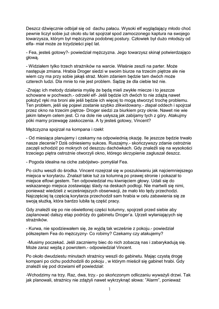 Deszcz dźwięcznie odbijał się od dachu pałacu. Wysoki elf wyglądający młodo choć pewnie liczył sobie juŜ około stu lat spojrzał spod zamoczonego kaptura na swojego towarzysza, którym był męŜczyzna podobnej postury. Człowiek był duŜo młodszy od elfa- miał moŜe ze trzydzieści pięć lat. - Fea, jesteś gotowy?- powiedział męŜczyzna. Jego towarzysz skinął potwierdzająco głową. - Widziałem tylko trzech straŜników na warcie. Właśnie zeszli na parter. MoŜe następuje zmiana. Hrabia Droger siedzi w swoim biurze na trzecim piętrze ale nie wiem czy ma przy sobie jakąś straŜ. Moim zdaniem będzie tam dwóch moŜe czterech ludzi. Dla mnie to nie jest problem. Sądzę Ŝe dla ciebie teŜ nie. -Znając ich metody działania myślę Ŝe będą mieli zwykłe miecze i to jeszcze schowane w pochwach.- odrzekł elf- Jeśli będzie ich dwóch to nie zdąŜą nawet połoŜyć ręki ma broni ale jeśli będzie ich więcej to mogą stworzyć trochę problemu. Ten problem, jeśli się pojawi zostanie szybko zlikwidowany.- złapał oddech i spojrzał przez okno na trzecim piętrze- Droger siedzi za biurkiem przy oknie. Nawet nie wie jakim łatwym celem jest. Ci na dole nie usłyszą jak zabijamy tych z góry. Atakujmy póki mamy przewagę zaskoczenia. A ty jesteś gotowy, Vincent? MęŜczyzna spojrzał na kompana i rzekł: - Od miesiąca planujemy i czekamy na odpowiednią okazję. Ile jeszcze będzie trwało nasze zlecenie? Dziś odniesiemy sukces. Ruszajmy.- skończywszy zdanie ostroŜnie zaczęli schodzić po mokrych od deszczu dachówkach. Gdy znaleźli się na wysokości trzeciego piętra ostroŜnie otworzyli okno, którego skrzypienie zagłuszał deszcz. - Pogoda idealna na ciche zabójstwo- pomyślał Fea. Po cichu weszli do środka. Vincent rozejrzał się w poszukiwaniu jak najciemniejszego miejsca w korytarzu. Znalazł takie tuŜ za kolumną po prawej stronie i pokazał to miejsce elfowi gestem. Ten odpowiedział mu kiwnięciem głowy. Udali się do wskazanego miejsca zostawiając ślady na deskach podłogi. Nie martwili się nimi, poniewaŜ wiedzieli z wcześniejszych obserwacji, Ŝe mało kto tędy przechodzi. Najczęściej tą częścią korytarza przechodził sam hrabia w celu zabawienia się ze swoją słuŜką, która bardzo lubiła tą część pracy. Gdy znaleźli się po nie oświetlonej części kolumny, spojrzeli przed siebie aby zaplanować dalszy etap podróŜy do gabinetu Droger’a. Ujrzeli wyłaniających się straŜników. - Kurwa, nie spodziewałem się, Ŝe wyjdą tak wcześnie z pokoju.- powiedział półszeptem Fea do męŜczyzny- Co robimy? Czekamy czy atakujemy? -Musimy poczekać. Jeśli zaczniemy biec do nich zobaczą nas i zabarykadują się. MoŜe zaraz wejdą z powrotem.- odpowiedział Vincent. Po około dwudziestu minutach straŜnicy weszli do gabinetu. Mając czystą drogę kompani po cichu podchodzili do pokoju , w którym mieścił się gabinet hrabi. Gdy znaleźli się pod drzwiami elf powiedział: -Wchodzimy na trzy. Raz, dwa, trzy.- po skończonym odliczaniu wywaŜyli drzwi. Tak jak planowali, straŜnicy nie zdąŜyli nawet wykrzyknąć słowa: ”Alarm”, poniewaŜ 1 zostali ugodzeni noŜami do rzucania, które utkwiły straŜnikom w krtaniach. Hrabia zaskoczony tak szybką likwidacją swoich podwładnych zaniemiał. Wtedy Fea rzekł: -Hrabio Estebanie Droger, decyzją WyŜszej Rady Królestwa zostałeś skazany na śmierć za zdradę i zmowę z dowódcą orkowej armii, magiem Colebem. Czy masz jakieś argumenty na swoją obronę, które postawią cię w świetle niewinnego? Droger nadal zszokowany po dłuŜszej chwili odpowiedział: - Wiedziałem, Ŝe zostanę skazany przez Radę ale nie spodziewałem się, Ŝe przyślą po mnie skrytobójców. Moje zadanie zostało skończone. Nie będę się bronił przed karą za moje czyny i nie chcę domagać się statusu niewinnego. Tak jestem winny. Mam tylko jedną prośbę, którą moŜecie spełnić. - Jaką?- spytał Vincent. - Chcę aby moja śmierć była szybka i bezbolesna. MoŜecie to chyba zrobić? - To moŜemy ci załatwić.- odpowiedział elf i wyciągnął nóŜ schowany za cholewą i podciął gardło skazańca.- JuŜ więcej nikogo nie skrzywdzisz. Niech ci ziemia lekką będzie.- dodał wycierając ostrze. - Utnij mu palec na dowód zabójstwa. Rada będzie zadowolona z naszego sukcesupowiedział Vincent. Obaj udali się do wyjścia. Gdy byli w połowie drogi do okna, którym weszli, ujrzeli zbliŜających się straŜników. Nie spodziewali się takiej sytuacji. - O Ŝesz kurwa. Skrytobójcy!- zawołał jeden z nich- Milan! Do broni! Niestety były to ostatnie słowa jakie usłyszeli z jego ust, poniewaŜ cios miecza w brzuch spowodował, Ŝe straŜnik nie mógł więcej nic powiedzieć. Wykrwawił się dość szybko. StraŜnik Milan natomiast postanowił stawiać czynny opór i wyciągnął broń. Walkę z nim podjął Fea, dla którego przestraszony człowiek, który widział przed chwilą jak jego kolega umiera, nie stanowił Ŝadnej przeszkody. Opór trwał trochę dłuŜej niŜ elf się spodziewał. Pierwszy jego cios został sparowany i na tym skończyła się walka ze straŜnikiem, poniewaŜ drugi cios został wyprowadzony za szybko dla człowieka, co równało się z jego natychmiastowym zgonem. -Dobrze, Ŝe juŜ z nim skończyłeś. I tak straciliśmy duŜo czasu. Zabierajmy się zanim ogłoszą alarm.- powiedział Vincent, który wychodząc przez okno szepnął do siebieJak ja nienawidzę tych nocnych ucieczek. Wsiedli na konie i popędzili galopem niknąc w mroku. Przejechali przez bramę miasta i nikt ich więcej tej nocy nie widział. Po dwóch dniach do stolicy królestwa dotarła paczka zaadresowana do WyŜszej Rady Królestwa. Przewodniczący otwierając ją poczuł odór padliny, a gdy uniósł wieko zwymiotował na posadzkę. Odebrał od niego paczkę wiceprzewodniczący i wyciągnął z niej palec zawinięty w szmatę oraz list, który brzmiał tak: