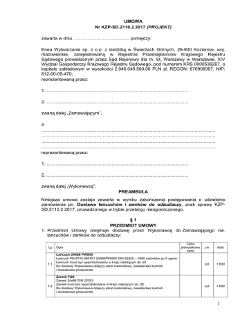 UMOWA Nr KZP-SD.2110.2.2017 (PROJEKT) zawarta w dniu ……………………............... pomiędzy: Enea Wytwarzanie sp. z o.o. z siedzibą w Świerżach Górnych, 26-900 Kozienice, woj. mazowieckie, zarejestrowaną w Rejestrze Przedsiębiorców Krajowego Rejestru Sądowego prowadzonym przez Sąd Rejonowy dla m. St. Warszawy w Warszawie, XIV Wydział Gospodarczy Krajowego Rejestru Sądowego, pod numerem KRS 0000536267, o kapitale zakładowym w wysokości 2.046.049.500,00 PLN zł; REGON: 670908367, NIP: 812-00-05-470; reprezentowaną przez: 1. ............................................................................................................... 2. ............................................................................................................... zwaną dalej „Zamawiającym”, a ........................................................................................................................................ ........................................................................................................................................ ........................................................................................................................................ ........................................................................................................................................ reprezentowaną przez: 1. ............................................................................................................... 2. ............................................................................................................... zwaną dalej „Wykonawcą”. PREAMBUŁA Niniejsza umowa zostaje zawarta w wyniku zakończenia postępowania o udzielenie zamówienia pn. Dostawa łańcuchów i zamków do odżużlaczy, znak sprawy KZPSD.2110.2.2017, prowadzonego w trybie przetargu nieograniczonego. §1 PRZEDMIOT UMOWY 1. Przedmiot Umowy obejmuje dostawę przez Wykonawcę do Zamawiającego nw. łańcuchów i zamków do odżużlaczy: Lp. Opis Łańcuch 24X86 PW9X5 Łańcuch PN-97/G-460701 24X86PW9X5 DIN 22252 – 1600 odcinków po 5 ogniw Łańcuch musi być wyprodukowany w kraju należącym do UE 1.1. Do dostawy Wykonawca dołączy atest materiałowy, świadectwo kontroli i świadectwo producenta Zamek FI24 Zamek 24x86 DIN 22253 Zamek musi być wyprodukowany w kraju należącym do UE 1.2. Do dostawy Wykonawca dołączy atest materiałowy, świadectwo kontroli i świadectwo producenta Cena jednostkowa netto j.m. ilość szt. 1 600 szt. 1 600 1 2. Zakres dostaw opisany w ust. 1 zostanie wykonany i dostarczony do Zamawiającego w terminach: poz. 1.1. – 800 szt. do …………...... – 800 szt. do …………...... poz. 1.2. – 800 szt. do …………...... – 800 szt. do …………...... 3. Wykonawca ponosi pełną, związaną z Przedmiotem Umowy, odpowiedzialność i ryzyko przypadkowej utraty, uszkodzenia lub zniszczenia Przedmiotu Umowy w całości lub w części, aż do momentu przejęcia Przedmiotu Umowy przez Zamawiającego. §2 PRZEDSTAWICIELE STRON Do dokonywania uzgodnień techniczno-organizacyjnych przedmiotu Umowy upoważnieni są: 1) ze strony Zamawiającego: związanych z realizacją ……………………………………………………………………………………………………. 2) ze strony Wykonawcy: ……………………………………………………………………………………………………. §3 WARUNKI DOSTAWY I ODBIORU 1. Miejscem dostawy jest siedziba Zamawiającego. Dostawa w dni powszednie w godzinach 8:00 – 14:00. Do dostawy należy dołączyć dokument dostawy (Faktura, Wz lub List Przewozowy), na którym należy umieścić nr Umowy Enea Wytwarzanie sp. z o.o. Dostawa bez takiego dokumentu będzie zwrócona. 2. Przedmiot Umowy będzie nowy, nie używany. §4 ROZLICZENIA FINANSOWE Za wykonanie Przedmiotu Umowy opisanego w § 1 ust. 1 ustala się cenę w wysokości zł ……………… (słownie złotych: …..………………………………………………………), płatną na podstawie faktur VAT po zrealizowaniu dostaw. Do ceny zostanie doliczony podatek VAT. 2. Zamawiający zobowiązuje się przekazać Wykonawcy należności na rachunek bankowy wskazany na fakturze w terminie 30 dni od daty doręczenia Zamawiającemu przedmiotu umowy i prawidłowo wystawionej faktury VAT. W przypadku gdy termin płatności przypada w sobotę lub dzień ustawowo wolny od pracy, płatność wynagrodzenia nastąpi w pierwszy dzień roboczy przypadający po tych dniach. 3. Za prawidłowo wystawioną fakturę Strony uznają dokument zawierający następujące dodatkowe informacje: numer umowy, numer zamówienia w IFS numer MPK/imię i nazwisko osoby/osób podpisujących umowę/zlecenie – jeśli nie ma numeru umowy/zlecenia, 1. 2 4. 5. 6. 7. 8. nazwę komórki organizacyjnej – jeśli dotyczy, oznaczenie dokumentu/protokołu odbioru (w szczególności nr dokumentu odbioru i akceptacji zrealizowanych prac) – jeśli dotyczy. Faktury, o których mowa w ustępach powyżej będą kierowane przez Wykonawcę na następujący adres: Enea Wytwarzanie sp. z o.o. Centrum Zarządzania Dokumentami ul. Zacisze 28, 65-775 Zielona Góra Dopuszcza się przesyłanie faktur drogą elektroniczną na adres: [email protected] w dowolnym formacie elektronicznym, w wersji nieedytowalnej (celem zapewnienia autentyczności pochodzenia i integralności treści faktury). W przypadku nieterminowej zapłaty należności Wykonawca może naliczyć ustawowe odsetki za zwłokę. Za datę zapłaty uważa się datę obciążenia rachunku bankowego Zamawiającego. W przypadku gdy termin płatności przypada w sobotę lub dzień ustawowo wolny od pracy, płatność wynagrodzenia nastąpi w pierwszy dzień roboczy przypadający po tych dniach. Zamawiający oświadcza, że jest upoważniony do otrzymywania faktur VAT i upoważnia Wykonawcę do wystawienia faktur VAT bez podpisu Zamawiającego. 8.1. NIP Zama
