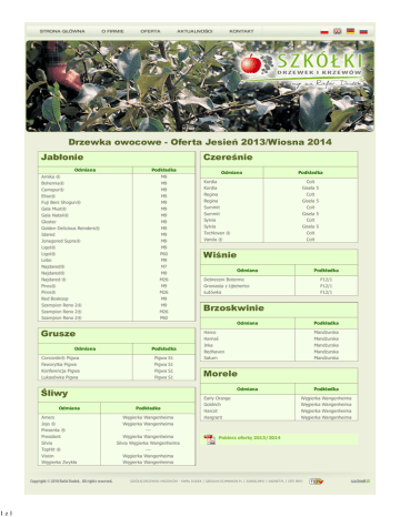 1z1 Drzewka owocowe - Oferta Jesień 2013/Wiosna 2014 Jabłonie Odmiana Czereśnie Podkładka Odmiana Podkładka Arnika ® M9 Bohemia® Camspur® M9 M9 Kordia Kordia Colt Gisela 5 Elise® Fuji Beni Shogun® M9 M9 Regina Regina Colt Gisela 5 Gala Must® Gala Natali® M9 M9 Summit Colt Gloster M9 Summit Sylvia Gisela 5 Colt Golden Delicious Reinders® Idared M9 M9 Sylvia Techlovan ® Gisela 5 Colt Jonagored Supra® Ligol® M9 M9 Vanda ® Ligol® Lobo P60 M9 Wiśnie Najdared® Najdared® M7 M9 Najdared ® M26 Debreceni Botermo F12/1 Piros® Piros® M9 M26 Groniasta z Ujtehertoi Łutówka F12/1 F12/1 Red Boskoop Szampion Reno 2® M9 M9 Szampion Reno 2® Szampion Reno 2® M26 P60 Colt Odmiana Podkładka Brzoskwinie Odmiana Grusze Odmiana Podkładka Concorde® Pigwa Pigwa S1 Faworytka Pigwa Pigwa S1 Konferencja Pigwa Lukasówka Pigwa Pigwa S1 Pigwa S1 Podkładka Amers Węgierka Wangenheima Jojo ® Presenta ® Węgierka Wangenheima --- President Węgierka Wangenheima Silvia TopHit ® Silvia Węgierka Wangenheima --- Vision Węgierka Zwykła Harco Mandżurska Harnaś Inka Mandżurska Mandżurska Redhaven Saturn Mandżurska Mandżurska Morele Odmiana Śliwy Odmiana Podkładka Podkładka Early Orange Goldrich Węgierka Wangenheima Węgierka Wangenheima Harcot Hargrant Węgierka Wangenheima Węgierka Wangenheima Pobierz ofertę 2013/2014 Węgierka Wangenheima Węgierka Wangenheima SZKÓŁKI DRZEWEK I KRZEWÓW - RAFAŁ DUDEK | SZKOLKA-OCHMANOW.PL | JOKRIS.INFO | SADNET.PL | SITE INFO