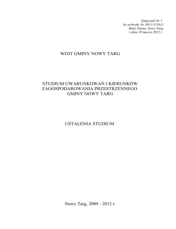 Załącznik Nr 1 do uchwały Nr XIV/115/2012 Rady Gminy Nowy Targ z dnia 20 marca 2012 r. WÓJT GMINY NOWY TARG STUDIUM UWARUNKOWAŃ I KIERUNKÓW ZAGOSPODAROWANIA PRZESTRZENNEGO GMINY NOWY TARG USTALENIA STUDIUM Nowy Targ, 2009 - 2012 r. Studium uwarunkowań i kierunków zagospodarowania przestrzennego Gminy Nowy Targ Organ sporządzający studium: Wójt Gminy Nowy Targ ul. Bulwarowa 9 34-400 Nowy Targ Jednostka opracowująca projekt planu: Pracownia Projektowa Architektury i Urbanistyki – Jacek Banduła 30-081 Kraków, ul. Królewska 69/38 tel./fax 012 - 636-73-78, 0668-48-20-10 Zespół projektowy: mgr inż. arch. Jacek Banduła - mgr inż. arch. Dariusz Nawałka mgr inż. Stanisław Albricht inż. Andrzej Gorcziński mgr Andrzej Sułkowski Mariusz Kamiński - Nowy Targ - 2009 - 2012 r. główny projektant, kierownik zespołu członek Okręgowej Izby Urbanistów z siedzibą w Katowicach, wpis nr KT – 056/02; uprawnienia urbanistyczne nr RP-upr. 5/93 współpraca projektowa, zagadnienia przestrzenne zagadnienia komunikacji infrastruktura techniczna zagadnienia ochrony środowiska współpraca, opracowanie graficzne 2 Studium uwarunkowań i kierunków zagospodarowania przestrzennego Gminy Nowy Targ SPIS TREŚCI WPROWADZENIE.................................................................................................................................................................4 UWARUNKOWANIA ROZWOJU GMINY........................................................................................................................5 KIERUNKI ZAGOSPODAROWANIA I POLITYKI PRZESTRZENNEJ GMINY.....................................................34 UZASADNIENIE I SYNTEZA USTALEŃ STUDIUM.....................................................................................................59 ANEKS . Nowy Targ - 2009 - 2012 r. .............................................................................................................................................60 3 Studium uwarunkowań i kierunków zagospodarowania przestrzennego Gminy Nowy Targ WPROWADZENIE 1.1. Podstawy prawne opracowania Do zadań samorządu gminnego należy kształtowanie i prowadzenie polityki przestrzennej na terenie gminy. Jednym z podstawowych instrumentów tej polityki, obok miejscowych planów zagospodarowania przestrzennego, jest studium uwarunkowań i kierunków zagospodarowania przestrzennego gminy, którego uchwalenie, zgodnie z art. 18 ust. 2 pkt 5 ustawy z dnia 8 marca 1990 r. o samorządzie gminnym (Dz. U. z 2001 r. Nr 142, poz. 1591 z późn. zm.) należy do wyłącznej właściwości rady gminy. Rangę prawną oraz zakres merytoryczny i rzeczowy studium określają przepisy ustawy z dnia 27 marca 2003 r. o planowaniu i zagospodarowaniu przestrzennym (Dz. U. Nr 80, poz. 717 z późn. zm.). Studium, w myśl art. 9 ust. 5 w/w ustawy nie jest aktem prawa miejscowego. Jest to akt kierownictwa wewnętrznego gminy, którego ustalenia są wiążące dla jej organów, w szczególności przy sporządzaniu planów miejscowych. 1.2. Charakter i zawartość opracowania Opracowanie niniejsze zawiera ustalenia tekstowe Studium uwarunkowań i kierunków zagospodarowania przestrzennego gminy Nowy Targ, stanowiące załącznik nr 1 do uchwały Rady Gminy Nowy Targ w sprawie uchwalenia studium; integralną częścią studium są plansze graficzne: - Nr 1 pt. „Uwarunkowania rozwoju przestrzennego” (załącznik nr 2 do uchwały), - Nr 2 pt. „Kierunki zagospodarowania przestrzennego” (załącznik nr 3 do uchwały). Opracowanie niniejsze zawiera drugą edycję Studium. Studiu w pierwszej edycji opracowane zostało w latach 1998-1999 i zatwierdzone uchwałą Nr XV/116/99 Rady Gminy Nowy Targ z dnia 9 grudnia 1999 roku. Podjęcie zmiany studium wynikło z nowych potrzeb w zakresie zagospodarowania przestrzennego, uwidocznionych m.in. w trakcie sporządzania planów miejscowych dla obszaru gminy Nowy Targ oraz przy tworzeniu strategii rozwoju gminy. Wobec regulacji prawnych zawartych w ustawie z dnia 27 marca 2003 r. o planowaniu i zagospodarowaniu przestrzennym (Dz. U. Nr 80, poz. 717 z późn. zm.), warunkiem wdrożenia pożądanych rozwiązań planistycznych jest zmiana ustaleń studium. Przy tworzeniu niniejszego dokumentu wykorzystano szereg dostępnych materiałów i opracowań specjalistycznych. Wykorzystano bogate materiały dotychczas obowiązującego Studium uwarunkowań i kierunków zagospodarowania przestrzennego gminy Nowy Targ, w znacznej część nadal aktualne. Uwzględniono pozostałe opracowania określające podstawy polityki gminy Nowy Targ, w tym m.in. Strategię Rozwoju Gminy Nowy Targ na lata 2007-2013, a także dokumenty dotyczące polityki przestrzennej o zasięgu ponadlokalnym, w tym Plan zagospodarowania przestrzennego województwa małopolskiego. Studium w swojej treści zawiera informacje o cechach stanu istniejącego, dotychczasowych trendach, prognozach i uwarunkowaniach rozwoju, wreszcie formułuje wnioski i zalecenia dla kierunków przyszłościowych działań. Nowy Targ - 2009 - 2012 r. 4 Studium uwarunkowań i kierunków zagospodarowania przestrzennego Gminy Nowy Targ UWARUNKOWANIA ROZWOJU GMINY 2. Ogólna charakterystyka stanu zagospodarowania przestrzennego gminy 2.1. Podstawowe dane o gminie Gmina Nowy Targ położona jest w województwie małopolskim na terenie powiatu nowotarskiego. Jest to największa gmina powiatu, obejmująca swoim obszarem 21 sołectw: Dębno, Długopole, Dursztyn, Gronków, Harklowa, Klikuszowa, Knurów, Krauszow, Krempachy, Lasek, Ludźmierz, Łopuszna, Morawczyna, Nowa Biała, Obidowa, Ostrowsko, Pyzówka, Rogoźnik, Szlembark, Trute, Waksmund. Gmina Nowy Targ graniczy od północy z masywem Gorców, z kolei południowa jej część to fragment Kotliny Orawsko-Nowotarskiej. Od strony południowo-wschodniej ogranicza ją Pieniński Pas Skalicowy. Gminy sąsiadujące z Gminą Nowy Targ to: gminy powiatu nowotarskiego: gmina miejska Nowy Targ, którą obszar gminy 
