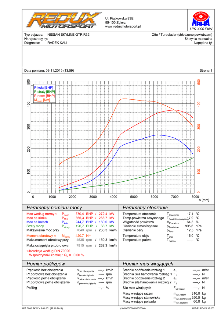 Ul. Piątkowska 83E 95-100 Zgierz www.reduxmotorsport.pl LPS 3000 PKW Typ pojazdu: NISSAN SKYLINE GTR R32 Nr.rejestracyjny: Diagnosta: RADEK KALI Otto / Turbolader (chłodzone powietrzem) Skrzynia manualna Napęd na tył 500 Strona 1 500 Data pomiaru: 09.11.2015 (13:59) 400 300 200 100 0 0 100 200 300 400 P-koła [BHP] P-straty [BHP] P-norm [BHP] Mnorm [Nm] 0 1000 2000 3000 4000 Parametry pomiaru mocy Moc według normy Moc na silniku Moc na kołach Straty mocy Maksymalna moc przy 1) Pnorm PMot Pkoła Pstraty 370,4 365,3 244,7 120,7 7040 5000 6000 7000 8000 n [rpm] Parametry otoczenia BHP BHP BHP BHP rpm / 272,4 kW / 268,7 kW / 180,0 kW / 88,7 kW / 233,3 km/h Temperatura otoczenia Temp.powietrza zasysanego Wilgotność powietrza Cisnienie atmosferyczne Cisnienie pary TOtoczenie 17,1 TPowietrze zasysane 17,9 HPowietrze 64,3 pPowietrze 995,6 pPara 12,5 Temperatura oleju Temperatura paliwa TOlej TPaliwo Moment obrotowy 1) Mnorm Maks.moment obrotowy przy 420,7 Nm 4535 rpm / 150,3 km/h Maks.osiągnięta pr.obrotowa 7915 rpm / 262,3 km/h °C °C % hPa hPa 15,0 °C ----,- °C 1) Korekcja według DIN 70020 Współczynniki korekcji: QV = 0,00 % Pomiar poślizgów Prędkość bez obciążenia Pr.obrotowa bez obciążenia Prędkość pełne obciążenie Pr.obrotowa pełne obciążenie Poślizg LPS 3000 PKW V 2.01.001 (28.10.2011) Pomiar mas wirujących vbez obciążenia nbez obciążenia vpełne obciążenie npełne obciążenie ----,--------,----- km/h rpm km/h rpm ---,-- % Średnie opóźnienie rozbieg 1 Średnia Siła hamowania rozbieg 1 Średnie opóźnienie rozbieg 2 Średnie siła hamowania rozbieg 2 a1 F1 a2 F2 ---,-------,---,-------,- Siła mas wirujących Fwir.razem -----,- N Masy wirujące razem Masy wirujące stanowiska Masy wirujące pojazdu mwir.razem 310,0 kg mwir.stanowiska 250,0 kg mwir.pojazdu 60,0 kg (100/000/0000/000/0000) m/s2 N m/s2 N LPS-EURO V1.36.003