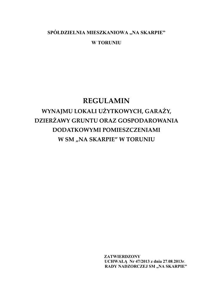 SPÓŁDZIELNIA MIESZKANIOWA „NA SKARPIE” W TORUNIU REGULAMIN WYNAJMU LOKALI UŻYTKOWYCH, GARAŻY, DZIERŻAWY GRUNTU ORAZ GOSPODAROWANIA DODATKOWYMI POMIESZCZENIAMI W SM „NA SKARPIE” W TORUNIU ZATWIERDZONY UCHWAŁĄ Nr 47/2013 z dnia 27.08.2013r. RADY NADZORCZEJ SM „NA SKARPIE” I. Postanowienia ogólne §1 Podstawą prawną niniejszego Regulaminu jest Statut Spółdzielni Mieszkaniowej „Na Skarpie” w Toruniu. §2 Regulamin dotyczy najemców, dzierżawców lub użytkowników: - lokali użytkowych, garaży, gruntów, - dodatkowych pomieszczeń (komórek lokatorskich). §3 1. Stawki eksploatacyjne dla lokali użytkowych, dzierżawy i garaży ustalane są na 1 m² powierzchni użytkowej i uwzględniają: 1) zasady racjonalnego gospodarowania w oparciu o roczny plan gospodarczo - finansowy Spółdzielni, 2) uchwały Rady Miasta Torunia, 3) ceny stosowane przez dostawców mediów, 2. Wysokość stawek uchwala Zarząd Spółdzielni po zatwierdzeniu ich przez Radę Nadzorczą. II . Ogólne warunki wynajmu lokali użytkowych, garaży oraz gruntu §4 1. Wolne lokale użytkowe, garaże oraz grunty są wystawiane na przetarg zgodnie z „Regulaminem organizowania przetargów na najem lokali, dzierżawę gruntu oraz ustanawianie praw do lokali”. 2. Organizatorem przetargu jest Zarząd Spółdzielni. 3. Jeżeli przetarg nie przyniesie rozstrzygnięcia to przekazuje się wolne lokale użytkowe, garaże oraz grunty do Spółdzielczego Biura Obrotu Nieruchomościami w celu pozyskania użytkownika. 2 §5 Podstawą wynajmu lokalu użytkowego, garażu, najmu lub dzierżawy gruntu jest złożona oferta pisemna zawierająca: l. określenie podmiotu najmu lub dzierżawy, 2. określenie charakteru prowadzonej działalności, 3. określenie powierzchni użytkowej w m², 4. określenie stawki czynszowej najmu lub stawki dzierżawnej, 5. nr konta bankowego, wyciąg z Krajowego Rejestru Sądowego, zaświadczenie o prowadzeniu działalności gospodarczej, NIP, Regon, Pesel. III. Szczegółowe warunki wynajmu lokali użytkowych, garaży oraz gruntu §6 Szczegółowe warunki wynajmu lokalu użytkowego i garażu będącego własnością Spółdzielni zawarte są w umowie. 1. Umowa zawierać powinna: 1) dokładne określenie stron umowy, 2) dokładne określenie lokalizacji i charakteru działalności, 3) wysokość czynszu z podziałem na: - stawkę czynszową najmu z zastrzeżeniem, że zmiana wysokości stawki o wskaźnik inflacji wprowadzana jest przez Spółdzielnię jednostronnie w formie zawiadomienia, natomiast powyżej wskaźnika inflacji wprowadzana jest na podstawie aneksu, - opłaty niezależne od Spółdzielni ( c.o., c.w. ,z.w., energia elektryczna, gaz, podatek od nieruchomości i opłata za użytkowanie wieczyste, odpady gospodarcze) w przypadku zmian cen ustalanych przez ich dostawców wprowadzane są przez Spółdzielnię jednostronnie w formie zawiadomienia, 4) wzajemne prawa i obowiązki w szczególności: - przeprowadzanie remontów i konserwacji wewnątrz lokalu należy do Najemcy, a w częściach wspólnych do Spółdzielni, - zmiana branży wymaga zgody Zarządu Spółdzielni, - podnajem całości lub części lokalu jest możliwy tylko za zgodą Zarządu Spółdzielni, 2. Załącznikiem do umowy jest protokół zdawczo - odbiorczy z przekazania lokalu. Protokół spisuje się komisyjnie. Załącznik do protokołu stanowi dokumentacja fotograficzna. Skład komisji ustala każdorazowo Kierownik Działu GZM. 3. W lokalach użytkowych położonych w budynkach mieszkalnych warunkiem dodatkowym jest prowadzenie działalności nieuciążliwej dla mieszkańców. 3 §7 Szczegółowe warunki najmu lub dzierżawy gruntu: 1. Umowa zawierać powinna: 1) dokładne określenie stron umowy, 2) określenie usytuowania i powierzchni dzierżawy oraz charakter działalności, 3) wysokość czynszu z podziałem na: - stawkę czynszu dzierżawnego z zastrzeżeniem, że zmiana wysokości stawki wskaźnik inflacji jest wprowadzana przez Spółdzielnię jednostronnie w formie zawiadomienia, natomiast powyżej wskaźnika inflacji wprowadzana jest na podstawie aneksu, - opłaty niezależne od Spółdzielni tj.: c.o., c.w. ,z.w., energia elektryczna, gaz, podatek od nieruchomości i opłata za użytkowanie wieczyste w przypadku zmian cen przez ich dostawców wprowadzane są przez Spółdzielnię jednostronnie w formie zawiadomienia, 4) wzajemne prawa i obowiązki, 5) utrzymanie porządku w obrębie 6 mb szerokości od i wokół pawilonu przez Użytkownika. IV. Targowisko §8 1. Handel obwoźny na placu targowym istniejący na terenie osiedla, odbywa się na podstawie planu zagospodarowania targowiska zatwierdzony przez Wydział Architektury U.M. oraz zawartej umowy pomiędzy Spółdzielnią, a Wydziałem Handlu U.M w następujących formach: 1) Pawilony tymczasowe (kioski) będące własnością osób trzecich posiadają zawarte ze Spółdzielnią umowy na zasadach określonych w § 7 regulaminu. 2) Stragany - obowiązują dzienne opłaty w oparciu o cennik Urzędu Miejskiego uchwalony przez Radę Miasta Torunia. 2. Przyjmowanie opłat, rozliczanie się z nich oraz kierowanie targowiskiem należy do Administratora Targowiska, na podstawie umowy zawartej ze Spółdzielnią. 4 V. Użytkowanie i opłaty za garaże o statusie własnościowym i odrębnej własności §9 1. Użytkownik garażu obowiązany jest do bieżącego odnawiania garażu oraz do dokonywania napraw i remontów garażu wewnątrz i z zewnątrz we własnym zakresie. 2. Użytkownik garażu zobowiązany jest do: 1) wyposażenia garażu w sprzęt przeciwpożarowy, 2) utrzymania czystości i porządku wokół garażu, 3) usuwania w okresie zimy śniegu i lodu przed garażem, 3. Użytkownik ponosi odpowiedzialność za ewentualne nieszczęśliwe wypadki oraz szkody, pozostające w związku przyczynowym z niewykonaniem obowiązków, o których mowa w ust. 1 i 2. § 10 1. Użytkownik garażu zobowiązany jest do pokrywania kosztów gospodarki zasobam