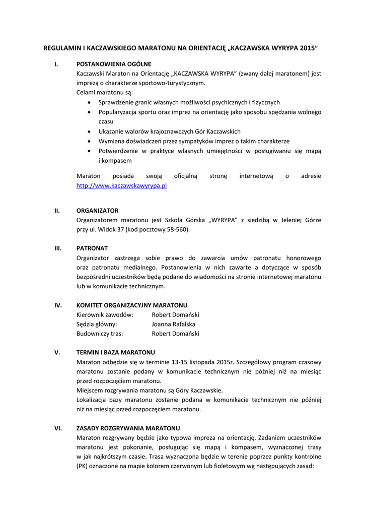 REGULAMIN I KACZAWSKIEGO MARATONU NA ORIENTACJĘ „KACZAWSKA WYRYPA 2015” I. POSTANOWIENIA OGÓLNE Kaczawski Maraton na Orientację „KACZAWSKA WYRYPA” (zwany dalej maratonem) jest imprezą o charakterze sportowo-turystycznym. Celami maratonu są: Sprawdzenie granic własnych możliwości psychicznych i fizycznych Popularyzacja sportu oraz imprez na orientację jako sposobu spędzania wolnego czasu Ukazanie walorów krajoznawczych Gór Kaczawskich Wymiana doświadczeń przez sympatyków imprez o takim charakterze Potwierdzenie w praktyce własnych umiejętności w posługiwaniu się mapą i kompasem Maraton posiada swoją http://www.kaczawskawyrypa.pl oficjalną stronę internetową o adresie II. ORGANIZATOR Organizatorem maratonu jest Szkoła Górska „WYRYPA” z siedzibą w Jeleniej Górze przy ul. Widok 37 (kod pocztowy 58-560). III. PATRONAT Organizator zastrzega sobie prawo do zawarcia umów patronatu honorowego oraz patronatu medialnego. Postanowienia w nich zawarte a dotyczące w sposób bezpośredni uczestników będą podane do wiadomości na stronie internetowej maratonu lub w komunikacie technicznym. IV. KOMITET ORGANIZACYJNY MARATONU Kierownik zawodów: Robert Domański Sędzia główny: Joanna Rafalska Budowniczy tras: Robert Domański V. TERMIN I BAZA MARATONU Maraton odbędzie się w terminie 13-15 listopada 2015r. Szczegółowy program czasowy maratonu zostanie podany w komunikacie technicznym nie później niż na miesiąc przed rozpoczęciem maratonu. Miejscem rozgrywania maratonu są Góry Kaczawskie. Lokalizacja bazy maratonu zostanie podana w komunikacie technicznym nie później niż na miesiąc przed rozpoczęciem maratonu. VI. ZASADY ROZGRYWANIA MARATONU Maraton rozgrywany będzie jako typowa impreza na orientację. Zadaniem uczestników maratonu jest pokonanie, posługując się mapą i kompasem, wyznaczonej trasy w jak najkrótszym czasie. Trasa wyznaczona będzie w terenie poprzez punkty kontrolne (PK) oznaczone na mapie kolorem czerwonym lub fioletowym wg następujących zasad: a) miejsce startu - trójkąt równoboczny o boku 7 mm z jednym wierzchołkiem skierowanym w stronę pierwszego PK; b) punkt kontrolny (PK) - okrąg o średnicy 5-6 mm, przy czym miejsce ustawienia lampionu znajduje się dokładnie w jego środku; c) meta - dwa współśrodkowe okręgi o średnicach 5 i 7 mm; d) połączenie PK dla (dla odcinków o obowiązkowej kolejności zaliczania PK) - linie proste. e) numeracja PK - cyfry arabskie o wysokości 5-7 mm umieszczone zgodnie z kierunkiem północnym na mapie; f) odcinki obowiązkowe - linie przerywane; g) obszar niebezpieczny - ograniczająca linia konturowa z ukośnie krzyżowym zakreśleniem pola; h) obszar zakazany - ograniczająca linia konturowa z pionowym zakreśleniem pola; i) punkty pierwszej pomocy medycznej - krzyż równoramienny o wysokości 7 mm i szerokości ramienia 3 mm; j) punkt wydawania napojów - piktogramowy kubeczek o wysokości 5 mm. Dodatkowe informacje o usytuowaniu PK w terenie przekazane będą zawodnikom w formie możliwie zwięzłych i precyzyjnych opisów PK, które będą przygotowane w formie symboli zgodnie z przepisami IOF lub pisemnie w języku polskim. Dopuszcza się załączenie do opisu PK wycinka dokładniejszej mapy, obejmującego bezpośrednie sąsiedztwo tego PK. Potwierdzanie PK odbywać się będzie na karcie startowej, którą uczestnik otrzyma od organizatora przed startem. Sposób potwierdzania PK zostanie określony w komunikacie technicznym przed rozpoczęciem imprezy. Start maratonu odbędzie się jako masowy, osobno dla każdej trasy (TP25, TP50, TP100, TR75, TR150). Spóźnienie zawodnika na start nie zawinione przez organizatora nie powoduje zmiany jego czasu startu, który liczony jest od chwili startu masowego dla trasy na której startuje zawodnik. Zawodnik otrzymuje mapę na 15 minut przed startem. Od chwili rozpoczęcia wydawania map, zawodnikowi który znajduje się w strefie startowej nie wolno opuszczać tej strefy. W przypadku tras złożonych z dwóch pętli lub odcinków specjalnych obowiązkiem zawodnika jest sprawdzenie czy otrzymał mapę przeznaczoną dla jego trasy. Przeznaczenie mapy będzie w wyraźny sposób oznaczone na niej. Na 30 minut przed startem każdej trasy, w strefie startowej odbędzie się odprawa techniczna, w której udział jest obowiązkowy. Zawodnik nie może biegać ani jeździć rowerem na trasie przez uprawy leśne i rolne, ogrodzone sady oraz inne tereny oznaczone jako obszar zakazany. Nie dopuszcza się stosowania w celach nawigacyjnych urządzeń GPS. Dopuszczalne jest ich stosowanie do zapisu pokonywanej trasy oraz pomiaru prędkości i dystansu. VII. TRASY PIESZE Zawody rozegrane będą na trzech dystansach pieszych oznaczonych TP25, TP50 i TP100. Długość tras mierzona wariantem optymalnym będzie zawierała się w granicach: dla trasy TP25 – pomiędzy 23km a 27 km, dla trasy TP50 – pomiędzy 45km a 55km, dla trasy TP100 – pomiędzy 100km a 110km. Ostateczne parametry tras takie jak: długość, przewyższenia, ilość PK, limit czasu na jej pokonanie zostaną podane w komunikacie technicznym przed rozpoczęciem imprezy. VIII. TRASA ROWEROWA Zawody rozegrane będą na dwóch dystansach rowerowym oznaczonym TR75 i TR150. Długość trasy mierzona wariantem optymalnym będzie zawierała się w granicach: dla trasy TR75 – pomiędzy 75km a 80km dla trasy TR150 – 150km a 160km. Ostateczne parametry trasy takie jak: długość, przewyższenia, ilość PK, limit czasu na jej pokonanie zostaną podane w komunikacie technicznym przed rozpoczęciem maratonu. IX. PUNKTY KONTROLNE Punktem kontrolnym (PK) jest charakterystyczne miejsce w terenie zaznaczone na mapie i oznakowane w terenie lampionem. Za lampion uważa się element przestrzenny zbudowany ze ścian bocznych graniastosłupa prawidłowego trójkątnego, którego wysokość i długość boku podstawy wynoszą po 30cm z tolerancją wymiaru do 5cm. Każda ściana boczna lamp