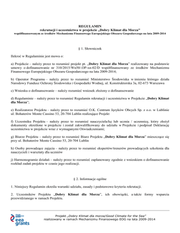 REGULAMIN rekrutacji i uczestnictwa w projekcie „Dobry Klimat dla Morza” współfinansowanym ze środków Mechanizmu Finansowego Europejskiego Obszaru Gospodarczego na lata 2009-2014 § 1. Słowniczek Ilekroć w Regulaminie jest mowa o: a) Projekcie – należy przez to rozumieć projekt pt. „Dobry Klimat dla Morza” realizowany na podstawie umowy o dofinansowanie nr 310/2015/Wn50/.OP-xn-02/D współfinansowany ze środków Mechanizmu Finansowego Europejskiego Obszaru Gospodarczego na lata 2009-2014; b) Operator Programu – należy przez to rozumieć Ministerstwo Środowiska w imieniu którego działa Narodowy Fundusz Ochrony Środowiska i Gospodarki Wodnej, ul. Konstruktorska 3a, 02-673 Warszawa c) Wniosku o dofinansowanie – należy rozumieć wniosek złożony o dofinansowanie d) Regulaminie – należy przez to rozumieć Regulamin rekrutacji i uczestnictwa w Projekcie „Dobry Klimat dla Morza”; e) Realizatorze Projektu – należy przez to rozumieć O.K. Centrum Języków Obcych Sp. z o.o. w Lublinie ul. Bohaterów Monte Cassino 53, 20-704 Lublin realizujące Projekt f) Uczestniku Projektu – należy przez to rozumieć nauczyciela/kę lub ucznia / uczennicę, który złożył dokumenty określone w projekcie i został zakwalifikowany do udziału w Projekcie i podpisał Deklarację uczestnictwa w projekcie wraz z wymaganymi Oświadczeniami; g) Biurze Projektu – należy przez to rozumieć Biuro Projektu „Dobry Klimat dla Morza” mieszczące się przy ul. Bohaterów Monte Cassino 53, 20-704 Lublin h) Osoby prowadzące zajęcia – należy przez to rozumieć ekspertów/trenerów prowadzących szkolenia dla nauczycieli i warsztaty dla uczniów j) Harmonogramie działań – należy przez to rozumieć zaplanowany zgodnie z wnioskiem o dofinansowanie rozkład zadań projektu w czasie jego realizacji. § 2. Informacje ogólne 1. Niniejszy Regulamin określa warunki udziału, zasady i podstawowe kryteria rekrutacji. 2. Uczestników Projektu „Dobry Klimat dla Morza”, ich obowiązki, a także formy wsparcia przewidzianego w ramach Projektu. Projekt „Dobry Klimat dla morza/Good Climate for the Sea” realizowany w ramach Mechanizmu Finansowego EOG na lata 2009-2014 3. Projekt „Dobry Klimat dla Morza” realizowany jest w okresie 01.05.2015- 30.04.2016 r. 4. Projekt jest skierowany nauczycieli oraz dzieci i młodzieży w wieku szkolnym. 5. Uczestnictwo w Projekcie jest bezpłatne i dobrowolne. 6. Celem projektu jest wzrost świadomości społecznej nt. różnorodności biologicznej oraz edukacja w tej dziedzinie w powiązaniu ze zmianami klimatycznymi i ekonomiczną wartością ekosystemów. Kampania ma uświadomić mieszkańcom Polski wartość różnorodności biologiczną morza oraz przybliżyć jej specyfikę i unikalność. Kampania ma pokazać, że w wielu miejscach naszego morza różnorodność zanika lub jest zagrożona. 7. Zaplanowane w Projekcie działania obejmują: a) Cykl filmów "Dobry Klimat dla Morza" do emisji w TVP. Cykl pokazuje problemy związane ze zmianami bioróżnorodności morza, które badają i prezentują wybitni polscy i norwescy naukowcy. Wydana zostanie pomoc dydaktyczna dla szkół-DVD z cyklem filmów, scenariuszami lekcji i kartami pracy dla ucznia. b) Rozbudowany, dynamiczny Portal internetowy "Dobry Klimat dla Morza". Portal stanowić będzie klamrę spinającą wszystkie elementy kampanii i oraz istotne narzędzie upowszechniania wiedzy o bioróżnorodności wśród całego społeczeństwa. c) Warsztaty dla uczniów d) Szkolenia dla nauczycieli e) Konkurs „Bioróżnorodność z klasą”, którego tematem będzie prowadzenie blogów na temat bioróżnorodności w morzu. Nagrodą główną jest wycieczka. f) Akcja plenerowa "Morscy Odkrywcy" 8. Zajęcia będą odbywały się na terenie szkoły jak i również poza. § 3. Rekrutacja 1. Uczestnikami Projektu mogą zostać nauczyciele i uczniowie placówek oświatowych tj. szkoła podstawowa, gimnazjum szkoła średnia) 2. Rekrutacja rozpocznie się 01.052015 i będzie odbywać się do 30.09.2015 lub do wyczerpania dostępnej ilości miejsc. 3. Osoba zainteresowana udziałem w szkoleniu dla nauczycieli składa Deklarację uczestnictwa w Projekcie wraz z niezbędnymi oświadczeniami. Formularz Deklaracji jest dostępny w Biurze Projektu oraz na stronie internetowej projektu www.dobryklimatdlamorza.pl 4. Osoba zainteresowana udziałem w szkoleniu dla nauczycieli ma również możliwość skorzystania z elektronicznego Formularza zgłoszeniowego. 5. Wypełnienie go i przesłanie za pośrednictwem strony internetowej jest równoznaczne ze zgłoszeniem się 2 Projekt „Dobry Klimat dla morza/Good Climate for the Sea” realizowany w ramach Mechanizmu Finansowego EOG na lata 2009-2014 na szkolenie. 6. O udziale uczestnika projektu w danej formie wsparcia decyduje kolejność. 7. Po wyczerpaniu dostępnych limitów miejsc, zostanie utworzona lista rezerwowa. 8. Rekrutacja uczestników do Projektu odbywać się będzie z zgodnie z zasadą równych szans w dostępie do udziału w zajęciach realizowanych w ramach Projektu. § 4. Zasady realizacji działań projektu oraz pozostałych form wsparcia 1. Informacje o terminach i miejscach realizacji działań Projektu zostaną przekazane Uczestnikom Projektu przez Eksperta ds. szkoleń oraz będą zamieszczone na stronie internetowej projektu www.dobryklimatdlamorza.pl. 2. Działania Projektu będą odbywały się w przeciągu realizacji całego Projektu, zgodnie z Harmonogramem działań. Daty i godziny realizacji danego działania będą ustalane i przekazane przez Eksperta ds. szkoleń oraz umieszczane na stronie projektu www.dobryklimatdlamorza.pl i portalach społecznościowych. § 5. Prawa i obowiązki uczestnika projektu 1. Każdy Uczestnik Projektu nieodpłatnie otrzyma materiały dydaktyczne. Otrzymanie powyższych materiałów Uczestnik Projektu potwierdza podpisując listę odbioru materiałów dydaktycznych. 2. Uczestnik zobowiązany jes