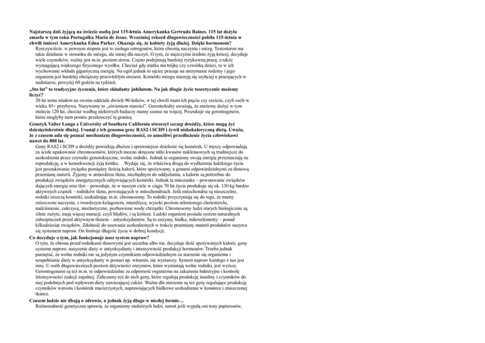 Najstarszą dziś żyjącą na świecie osobą jest 115-letnia Amerykanka Gertruda Baines. 115 lat dożyła zmarła w tym roku Portugalka Maria de Jesus. Wcześniej rekord długowieczności pobiła 115-letnia w chwili śmierci Amerykanka Edna Parker. Okazuje się, że kobiety żyją dłużej. Dzięki hormonom? Rzeczywiście, w pewnym stopniu jest to zasługa estrogenów, które chronią naczynia i mózg. Testosteron ma takie działanie w stosunku do mózgu, ale mniej dla naczyń. O tym, że mężczyźni średnio żyją krócej, decyduje wiele czynników, ważny jest m.in. poziom stresu. Często podejmują bardziej ryzykowną pracę, a także wymagającą większego fizycznego wysiłku. Chociaż gdy matka ma trójkę czy czwórkę dzieci, to w ich wychowanie wkłada gigantyczną energię. Na ogół jednak to ojciec pracuje na utrzymanie rodziny i jego organizm jest bardziej obciążony przewlekłym stresem. Komórki mózgu starzeją się szybciej u pracujących w nadmiarze, powyżej 60 godzin na tydzień. „Sto lat” to tradycyjne życzenia, które składamy jubilatom. Na jak długie życie teoretycznie możemy liczyć? 30 lat temu miałem na swoim oddziale dwóch 90-latków, w tej chwili mam ich pięciu czy sześciu, czyli osób w wieku 85+ przybywa. Nazywamy to „siwieniem starości”. Gerontolodzy uważają, że możemy dożyć w tym stuleciu 120 lat, chociaż według niektórych badaczy mamy szanse na więcej. Poszukuje się gerontogenów, które mogłyby nam pomóc przekroczyć tę granicę. Genetyk Valter Longo z University of Southern California stworzył szczep drożdży, które mogą żyć dziesięciokrotnie dłużej. Usunął z ich genomu geny RAS2 i SCH9 i żywił niskokaloryczną dietą. Uważa, że z czasem uda się poznać mechanizm długowieczności, co umożliwi przedłużenie życia człowiekowi nawet do 800 lat. Geny RAS2 i SCH9 u drożdży powodują dłuższe i sprawniejsze dzielenie się komórek. U myszy odpowiadają za ścisłe upakowanie chromosomów, których mocno skręcone nitki kwasów nukleinowych są trudniejsze do uszkodzenia przez czynniki genotoksyczne, wolne rodniki. Jednak te organizmy swoją energię przeznaczają na reprodukcję, a w konsekwencji żyją krótko. Wydaje się, że właściwą drogą do wydłużenia ludzkiego życia jest poszukiwanie związku pomiędzy ilością kalorii, które spożywamy, a genami odpowiedzialnymi za tlenową przemianę materii. Żyjemy w atmosferze tlenu, niezbędnym do oddychania, a kalorie są potrzebne do produkcji związków energetycznych odżywiających komórki. Jednak ta mieszanka – powstawanie związków dających energię oraz tlen – powoduje, że w naszym ciele w ciągu 70 lat życia produkuje się ok. 130 kg bardzo aktywnych cząstek – rodników tlenu, powstających w mitochondriach. Jeśli mitochondria są nieszczelne, rodniki niszczą komórki, uszkadzając m.in. chromosomy. To rodniki przyczyniają się do tego, że mamy zniszczone naczynia, z twardszym kolagenem, miażdżycę, wysoki poziom utlenionego cholesterolu, nadciśnienie, cukrzycę, nieelastyczne, pozbawione wody chrząstki. Chromosomy ludzi starych biologicznie są silnie zużyte, mają więcej mutacji, czyli błędów, i są krótsze. Ludzki organizm posiada system naturalnych zabezpieczeń przed aktywnym tlenem – antyoksydantów. Są to enzymy, białka, mikroelementy – ponad kilkadziesiąt związków. Zdolność do usuwania uszkodzonych w trakcie przemiany materii produktów nazywa się systemem napraw. On limituje długość życia w dobrej kondycji. Co decyduje o tym, jak funkcjonuje nasz system napraw? O tym, że obrona przed rodnikami tlenowymi jest szczelna albo nie, decyduje ilość spożywanych kalorii, geny systemu napraw, nasycenie diety w antyoksydanty i intensywność produkcji hormonów. Trzeba jednak pamiętać, że wolne rodniki nie są jedynym czynnikiem odpowiedzialnym za starzenie się organizmu i uzupełnianie diety w antyoksydanty w postaci np. witamin, nie wystarczy. System napraw każdego z nas jest inny. U osób długowiecznych poziom aktywności enzymów, które wymiatają wolne rodniki, jest wyższy. Gerontogenami są też m.in. te odpowiedzialne za odporność organizmu na zakażenia bakteryjne i kontrolę intensywności reakcji zapalnej. Zaliczamy też do nich geny, które regulują produkcję insuliny i czynników do niej podobnych pod wpływem diety zawierającej cukier. Ważne dla starzenia są też geny regulujące produkcję czynników wzrostu i komórek macierzystych, naprawiających białkowe uszkodzenia w komórce i zniszczonej tkance. Czasem ludzie nie dbają o zdrowie, a jednak żyją długo w niezłej formie… Różnorodność genetyczna sprawia, że organizmy niektórych ludzi, nawet jeśli wypalą oni tony papierosów, będą się dłużej broniły. Chociaż gdyby nie palili, żyliby jeszcze dłużej. Gerontogeny potrafią ochronić człowieka przed dużymi ilościami toksyn, poziomem stresu, niezdrową dietą. Mamy w Polsce kilka tysięcy stulatków, jednak osób zdrowych jest w tej grupie mało. Większość po prostu toleruje bez szkodliwych następstw chorobę i to wyróżnia osoby długowieczne – utrzymana adaptacja do choroby. Są rejony świata, w których ludzie żyją dłużej i w lepszej kondycji. Co mówi na ten temat etnogerontologia? W grupach, które żyją długo lub krótko, można zauważyć wspólne cechy. U tych długowiecznych znaczenie ma wolniejsze tempo życia i pewna odległość od cywilizacji, co wspomaga ochronę narządów i naczyń Stwierdzono też, że ludzie żyją dłużej tam, gdzie niedojadają, a nawet gdzie bywają okresy głodu. Także tam, gdzie w diecie jest mało mięsa, a dużo ryb, i tam, gdzie pracuje się na roli. Gdy po wojnie badało się byłych więźniów obozów niewoli, okazywało się, że mieli mniej zaawansowaną miażdżycę. Z powodu niedojadania i głodu żyli potem dłużej w porównaniu z normalnie żywiącymi się ludźmi. Oczywi