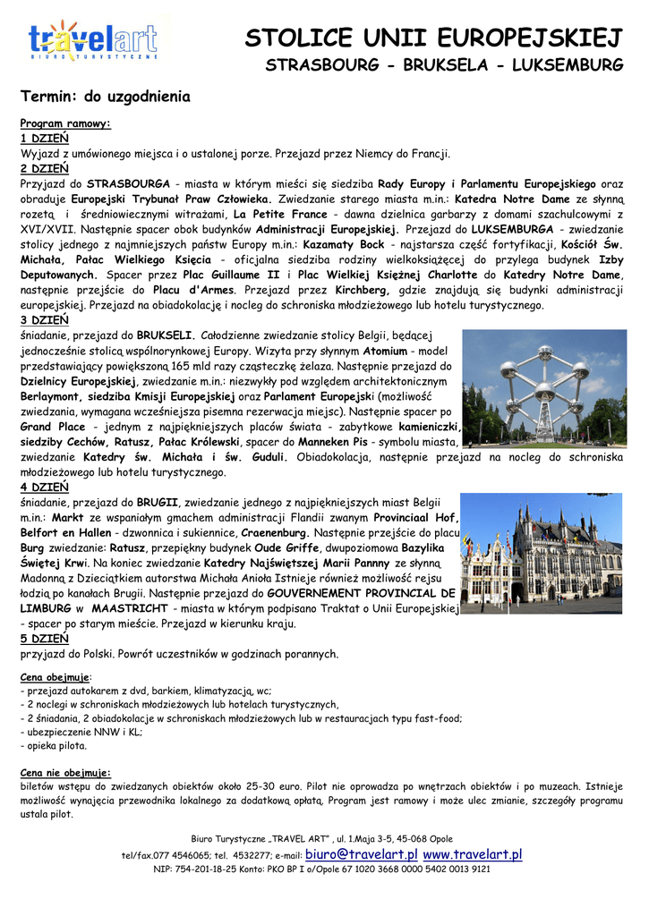 STOLICE UNII EUROPEJSKIEJ STRASBOURG - BRUKSELA - LUKSEMBURG Termin: do uzgodnienia Program ramowy: 1 DZIEŃ Wyjazd z umówionego miejsca i o ustalonej porze. Przejazd przez Niemcy do Francji. 2 DZIEŃ Przyjazd do STRASBOURGA - miasta w którym mieści się siedziba Rady Europy i Parlamentu Europejskiego oraz obraduje Europejski Trybunał Praw Człowieka. Zwiedzanie starego miasta m.in.: Katedra Notre Dame ze słynną rozetą i średniowiecznymi witrażami, La Petite France - dawna dzielnica garbarzy z domami szachulcowymi z XVI/XVII. Następnie spacer obok budynków Administracji Europejskiej. Przejazd do LUKSEMBURGA - zwiedzanie stolicy jednego z najmniejszych państw Europy m.in.: Kazamaty Bock - najstarsza część fortyfikacji, Kościół Św. Michała, Pałac Wielkiego Księcia - oficjalna siedziba rodziny wielkoksiążęcej do przylega budynek Izby Deputowanych. Spacer przez Plac Guillaume II i Plac Wielkiej Księżnej Charlotte do Katedry Notre Dame, następnie przejście do Placu d'Armes. Przejazd przez Kirchberg, gdzie znajdują się budynki administracji europejskiej. Przejazd na obiadokolację i nocleg do schroniska młodzieżowego lub hotelu turystycznego. 3 DZIEŃ śniadanie, przejazd do BRUKSELI. Całodzienne zwiedzanie stolicy Belgii, będącej jednocześnie stolicą wspólnorynkowej Europy. Wizyta przy słynnym Atomium - model przedstawiający powiększoną 165 mld razy cząsteczkę żelaza. Następnie przejazd do Dzielnicy Europejskiej, zwiedzanie m.in.: niezwykły pod względem architektonicznym Berlaymont, siedziba Kmisji Europejskiej oraz Parlament Europejski (możliwość zwiedzania, wymagana wcześniejsza pisemna rezerwacja miejsc). Następnie spacer po Grand Place - jednym z najpiękniejszych placów świata - zabytkowe kamieniczki, siedziby Cechów, Ratusz, Pałac Królewski, spacer do Manneken Pis - symbolu miasta, zwiedzanie Katedry św. Michała i św. Guduli. Obiadokolacja, następnie przejazd na nocleg do schroniska młodzieżowego lub hotelu turystycznego. 4 DZIEŃ śniadanie, przejazd do BRUGII, zwiedzanie jednego z najpiękniejszych miast Belgii m.in.: Markt ze wspaniałym gmachem administracji Flandii zwanym Provinciaal Hof, Belfort en Hallen - dzwonnica i sukiennice, Craenenburg. Następnie przejście do placu Burg zwiedzanie: Ratusz, przepiękny budynek Oude Griffe, dwupoziomowa Bazylika Świętej Krwi. Na koniec zwiedzanie Katedry Najświętszej Marii Pannny ze słynną Madonną z Dzieciątkiem autorstwa Michała Anioła Istnieje również możliwość rejsu łodzią po kanałach Brugii. Następnie przejazd do GOUVERNEMENT PROVINCIAL DE LIMBURG w MAASTRICHT - miasta w którym podpisano Traktat o Unii Europejskiej - spacer po starym mieście. Przejazd w kierunku kraju. 5 DZIEŃ przyjazd do Polski. Powrót uczestników w godzinach porannych. Cena obejmuje: - przejazd autokarem z dvd, barkiem, klimatyzacją, wc; - 2 noclegi w schroniskach młodzieżowych lub hotelach turystycznych, - 2 śniadania, 2 obiadokolacje w schroniskach młodzieżowych lub w restauracjach typu fast-food; - ubezpieczenie NNW i KL; - opieka pilota. Cena nie obejmuje: biletów wstępu do zwiedzanych obiektów około 25-30 euro. Pilot nie oprowadza po wnętrzach obiektów i po muzeach. Istnieje możliwość wynajęcia przewodnika lokalnego za dodatkową opłatą. Program jest ramowy i może ulec zmianie, szczegóły programu ustala pilot. Biuro Turystyczne „TRAVEL ART” , ul. 1.Maja 3-5, 45-068 Opole tel/fax.077 4546065; tel. 4532277; e-mail: [email protected] www.travelart.pl NIP: 754-201-18-25 Konto: PKO BP I o/Opole 67 1020 3668 0000 5402 0013 9121