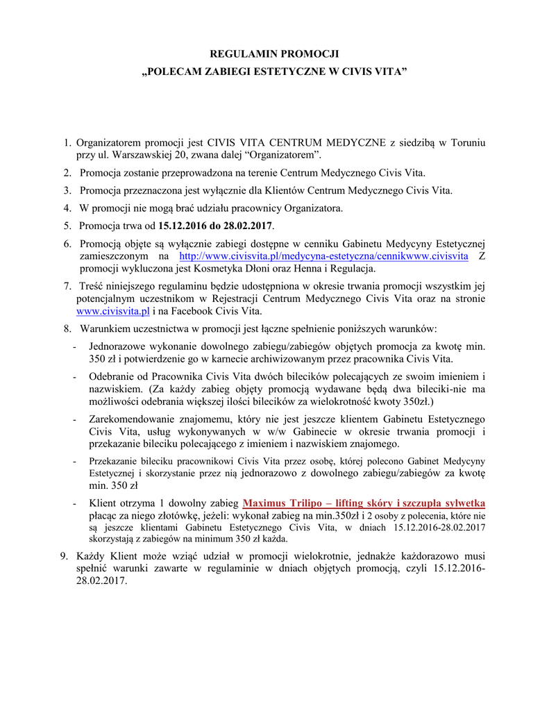 REGULAMIN PROMOCJI „POLECAM ZABIEGI ESTETYCZNE W CIVIS VITA” 1. Organizatorem promocji jest CIVIS VITA CENTRUM MEDYCZNE z siedzibą w Toruniu przy ul. Warszawskiej 20, zwana dalej “Organizatorem”. 2. Promocja zostanie przeprowadzona na terenie Centrum Medycznego Civis Vita. 3. Promocja przeznaczona jest wyłącznie dla Klientów Centrum Medycznego Civis Vita. 4. W promocji nie mogą brać udziału pracownicy Organizatora. 5. Promocja trwa od 15.12.2016 do 28.02.2017. 6. Promocją objęte są wyłącznie zabiegi dostępne w cenniku Gabinetu Medycyny Estetycznej zamieszczonym na http://www.civisvita.pl/medycyna-estetyczna/cennikwww.civisvita Z promocji wykluczona jest Kosmetyka Dłoni oraz Henna i Regulacja. 7. Treść niniejszego regulaminu będzie udostępniona w okresie trwania promocji wszystkim jej potencjalnym uczestnikom w Rejestracji Centrum Medycznego Civis Vita oraz na stronie www.civisvita.pl i na Facebook Civis Vita. 8. Warunkiem uczestnictwa w promocji jest łączne spełnienie poniższych warunków: - Jednorazowe wykonanie dowolnego zabiegu/zabiegów objętych promocja za kwotę min. 350 zł i potwierdzenie go w karnecie archiwizowanym przez pracownika Civis Vita. - Odebranie od Pracownika Civis Vita dwóch bilecików polecających ze swoim imieniem i nazwiskiem. (Za każdy zabieg objęty promocją wydawane będą dwa bileciki-nie ma możliwości odebrania większej ilości bilecików za wielokrotność kwoty 350zł.) - Zarekomendowanie znajomemu, który nie jest jeszcze klientem Gabinetu Estetycznego Civis Vita, usług wykonywanych w w/w Gabinecie w okresie trwania promocji i przekazanie bileciku polecającego z imieniem i nazwiskiem znajomego. - Przekazanie bileciku pracownikowi Civis Vita przez osobę, której polecono Gabinet Medycyny Estetycznej i skorzystanie przez nią jednorazowo z dowolnego zabiegu/zabiegów za kwotę min. 350 zł - Klient otrzyma 1 dowolny zabieg Maximus Trilipo – lifting skóry i szczupła sylwetka płacąc za niego złotówkę, jeżeli: wykonał zabieg na min.350zł i 2 osoby z polecenia, które nie są jeszcze klientami Gabinetu Estetycznego Civis Vita, w dniach 15.12.2016-28.02.2017 skorzystają z zabiegów na minimum 350 zł każda. 9. Każdy Klient może wziąć udział w promocji wielokrotnie, jednakże każdorazowo musi spełnić warunki zawarte w regulaminie w dniach objętych promocją, czyli 15.12.201628.02.2017. 10. Nagrodą w promocji jest dowolnie wskazany przez Klienta jeden zabieg z poniższej listy: Twarz + okolica oczu Cała twarz + okolica oczu + szyja + podbródek Dłonie Brzuch + boki Całe uda Pośladki Ramiona 11. Nagroda może zostać zrealizowana wyłącznie po spełnieniu wszystkich warunków promocji i po zapisaniu się na dostępny w terminarzu Placówki termin. 12. Odbiór nagrody musi nastąpić do dn. 15.03.2017. 13. W kwotę uprawniającą do wzięcia udziału w promocji nie wlicza się koszt konsultacji lekarza medycyny estetycznej. 14. Zabieg wykonany w ramach nagrody nie jest promowany bilecikiem polecającym. 15. Civis Vita Centrum Medyczne ponosi pełną odpowiedzialność za organizację, przebieg promocji, treść regulaminu, wydanie nagród oraz ewentualne reklamacje. 16. Nadzór nad przebiegiem promocji pełni : Dr Joanna Migda – Z-ca Dyrektora Civis Vita Magdalena Szmura – Kierownik Biura Obsługi Klienta; Barbara Witkowska – Pracownik Centrum Medycznego Civis Vita. 17. Reklamacje dotyczące przebiegu promocji mogą być zgłaszane w ciągu 7 dni od daty jej zakończenia na adres Organizatora: CIVIS VITA CENTRUM MEDYCZNE, 87 – 100 Toruń ul. Warszawska 20 18. Decyzja komisji zostanie przesłana do uczestnika promocji zgłaszającego reklamację w terminie 14 dni od daty otrzymania reklamacji przez Organizatora. Decyzja komisji jest ostateczna. Załącznik nr 1 Wzór karnetu promocyjnego Załącznik nr 2 Wzór bilecik polecającego