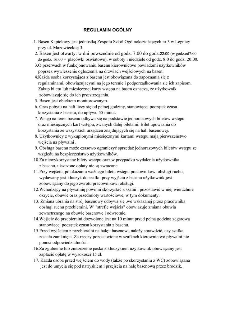 REGULAMIN OGÓLNY 1. Basen Kąpielowy jest jednostką Zespołu Szkół Ogólnokształcących nr 3 w Legnicy przy ul. Mazowieckiej 3. 2. Basen jest otwarty: w dni powszednie od godz. 7:00 do godz.22:00 (w godz.od7:00 do godz. 16:00 - placówki oświatowe), w soboty i niedziele od godz. 8:0 do godz. 20:00. 3.O przerwach w funkcjonowaniu basenu kierownictwo powiadomi użytkowników poprzez wywieszenie ogłoszenia na drzwiach wejściowych na basen. 4.Każda osoba korzystająca z basenu jest obowiązana do zapoznania się z regulaminami, obowiązującymi na jego terenie i podporządkowania się ich zapisom. Zakup biletu lub miesięcznej karty wstępu na basen oznacza, że użytkownik zobowiązuje się do ich przestrzegania. 5. Basen jest obiektem monitorowanym. 6. Czas pobytu na hali liczy się od pełnej godziny, stanowiącej początek czasu korzystania z basenu, do upływu 55 minut. 7. Wstęp na teren basenu odbywa się na podstawie jednorazowych biletów wstępu oraz miesięcznych kart wstępu, zwanych dalej biletami. Bilet upoważnia do korzystania ze wszystkich urządzeń znajdujących się na hali basenowej. 8. Użytkownicy z wykupionymi miesięcznymi kartami wstępu mają pierwszeństwo wejścia na pływalni . 9. Obsługa basenu może czasowo ograniczyć sprzedaż jednorazowych biletów wstępu ze względu na bezpieczeństwo użytkowników. 10.Za niewykorzystane bilety wstępu oraz w przypadku wydalenia użytkownika z basenu, uiszczone opłaty nie są zwracane. 11.Przy wejściu, po okazaniu ważnego biletu wstępu pracownikowi obsługi ruchu, wydawany jest kluczyk do szafki. przy wyjściu z basenu użytkownik jest zobowiązany do jego zwrotu pracownikowi obsługi. 12.Wchodzący na pływalnię powinni skorzystać z szatni i pozostawić w niej wierzchnie okrycie, obuwie oraz przedmioty wartościowe, w tym dokumenty. 13. Zmiana ubrania na strój basenowy odbywa się ,we wskazanej przez pracownika obsługi ruchu przebieralni. W' "strefie wejścia" obowiązuje zmiana obuwia zewnętrznego na obuwie basenowe i odwrotnie. 14.Wejście do przebieralni dozwolone jest na 10 minut przed pełną godziną zegarową stanowiącej początek czasu korzystania z basenu. 15.Przed wyjściem z przebieralni na halę~ basenową należy sprawdzić, czy szafka została zamknięta. Za rzeczy pozostawione w szafkach kierownictwo pływalni nie ponosi odpowiedzialności. 16.Za zgubienie lub zniszczenie paska z kluczykiem użytkownik obowiązany jest zapłacić opłatę w wysokości 15 zł. 17. Każda osoba przed wejściem do wody (także po skorzystaniu z WC) zobowiązana jest do umycia się pod natryskiem i przejścia na halę basenową przez brodzik. 18.Na terenie hali basenowej obowiązuje: 18.1. strój. kąpielowy, spełniający wymogi higieniczne, nie posiadający zamków błyskawicznych albo innych wstawek metalowych lub plastikowych, a) dla kobiet jedno lub dwu częściowy, przylegający do ciała, b) dla mężczyzn kąpielówki przylegające do ciała, bez kieszeni, 18.2 obuwie typu klapki, 18.3.czepek na głowie. 19. Dzieci do lat 10 i dzieci nieumiejące pływać. mogą przebywać w obiekcie jedynie pod opieką osób pełnoletnich. Osoby te ponoszą pełną odpowiedzialność za powierzone ich opiece dzieci i odpowiadają za wszelkie szkody przez nie wyrządzone. Opiekun płaci za pobyt na pływalni według obowiązującego cennika. 20. Dzieci do lat 3 korzystające z basenu muszą posiadać na sobie jednorazowe pielucho - majtki do kąpieli. 21. Na teren basenu zakazany jest wstęp osobom z przeciwwskazaniami lekarskimi, chorym, w szczególności: z upławami, z otwartymi ranami i stanami zapalnymi skóry, plastrami i bandażami na ciele oraz osobom, których stan higieny odbiega od ogólnie przyjętych norm. 22. Osoby niepełnosprawne korzystające z pływalni i poruszające się na wózkach, obowiązane są przesiąść się na wózek basenowy we wskazanych dla nich przez obsługę miejscach. 23. Ratownikami są osoby noszące strój w kolorze pomarańczowym z napisem RATOWNIK. 24. Wszystkie osoby korzystające z basenu są obowiązane do podporządkowania się nakazom ratowników oraz obsługi. 25. O wszelkich sytuacjach zagrażających życiu i zdrowiu użytkowników oraz nieprawidłowej pracy urządzeń należy bezwzględnie powiadomić ratowników lub pracowników obsługi. 26. Korzystanie z atrakcji wodnych odbywa się na własne ryzyko użytkowników . Osoby o niestabilnym stanie zdrowia powinny korzystać z atrakcji ze szczególną ostrożnością (po konsultacji z lekarzem). 27. Atrakcje wodne włączane są na 45 minut czasu pobytu na hali. 28. Strefy basenu i atrakcje wodne wyłączone czasowo z eksploatacji oznakowane są poprzez tablice informacyjne i korzystanie z nich jest w tym czasie zabronione. 29. Grupy zorganizowane obowiązują dodatkowo zapisy "Regulaminu dla grup zorganizowanych". 30. Sygnałem do natychmiastowego wyjścia z wody jest sygnał dźwiękowy tj. dwukrotny gwizdek. Po usłyszeniu sygnału należy opuścić nieckę oraz halę basenową i oczekiwać na dalsze polecenia ratowników. 31. W obrębie torów pływackich obowiązuje ruch prawostronny wzdłuż torów. Maksymalna liczba osób na jednym torze pływackim nie może przekraczać 8 osób. 32. Tory 5 i 6 przeznaczone są na pływanie rodzinne z dziećmi oraz dla osób słabo pływających, tory 1 i 2 przeznaczone są na pływanie rekreacyjne, tory 3 i 4 przeznaczone są dla osób dobrze pływających. 33. Ze względu na zapewnienie zasad higieny i bezpieczeństwa osobom znajdującym się na terenie basenu nie wolno: 33.1. wchodzić do wody wbrew zakazowi ratowników, przy braku dyżuru służby ratowniczej i w czasie prowadzenia akcji ratowniczej, 33.2. wnosić i spożywać napojów alkoholowych oraz środków odurzających, 33.3. kąpać się z biżuterią (pierścionki, bransoletki, łańcuszki, etc.), 33.4. załatwiać potrzeb fizjologicznych w wodzie, 33.5. skakać do wody, 33.6. wnosić opakowań szklanych oraz in