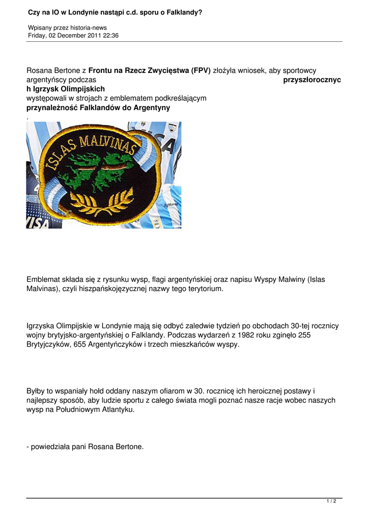 Czy na IO w Londynie nastąpi c.d. sporu o Falklandy? Wpisany przez historia-news Friday, 02 December 2011 22:36 Rosana Bertone z Frontu na Rzecz Zwycięstwa (FPV) złożyła wniosek, aby sportowcy argentyńscy podczas przyszłorocznyc h Igrzysk Olimpijskich występowali w strojach z emblematem podkreślającym przynależność Falklandów do Argentyny . Emblemat składa się z rysunku wysp, flagi argentyńskiej oraz napisu Wyspy Malwiny (Islas Malvinas), czyli hiszpańskojęzycznej nazwy tego terytorium. Igrzyska Olimpijskie w Londynie mają się odbyć zaledwie tydzień po obchodach 30-tej rocznicy wojny brytyjsko-argentyńskiej o Falklandy. Podczas wydarzeń z 1982 roku zginęło 255 Brytyjczyków, 655 Argentyńczyków i trzech mieszkańców wyspy. Byłby to wspaniały hołd oddany naszym ofiarom w 30. rocznicę ich heroicznej postawy i najlepszy sposób, aby ludzie sportu z całego świata mogli poznać nasze racje wobec naszych wysp na Południowym Atlantyku. - powiedziała pani Rosana Bertone. 1/2 Czy na IO w Londynie nastąpi c.d. sporu o Falklandy? Wpisany przez historia-news Friday, 02 December 2011 22:36 Porucznik lotnictwa w RAF, książę William, ma odbyć w Lutym rutynowe szkolenie na terenie Falklandów. Dla władz argentyńskich jest to swoisty akt prowokacji. Koalicja FPV nie ma większości w argentyńskim parlamencie, choć obecna prezydent tego kraju, pani Cristina Fernández de Kirchner, wywodzi się z tego ugrupowania. Gdyby jednak wniosek Rosany Bertone został przyjęty przez parlament, to musiałby jeszcze zostać zaakceptowany przez Międzynarodowy Komitet Olimpijski (MKOl) Mieszkańcy Falklandów stoją na stanowisku, że mają prawo do samodecydowania o swojej przynależności i proszą o poszanowanie dla ich wolności. Czytaj artykuł źródłowy 2/2