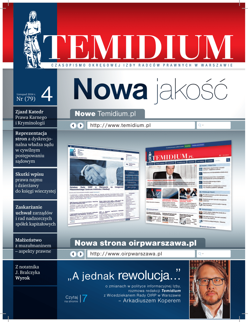 Listopad 2014 r. Nr (79) 4 Zjazd Katedr Prawa Karnego i Kryminologii Nowa jakość Nowe Temidium.pl http://www.temidium.pl Reprezentacja stron a dyskrecjonalna władza sądu w cywilnym postępowaniu sądowym Skutki wpisu prawa najmu i dzierżawy do księgi wieczystej Zaskarżanie uchwał zarządów i rad nadzorczych spółek kapitałowych Z notatnika J. Bralczyka Wyrok Nowa strona oirpwarszawa.pl http://www.oirpwarszawa.pl „A jednak Czytaj na stronie 7 rewolucja... o zmianach w polityce informacyjnej Izby, rozmowa redakcji Temidium z Wicedziekanem Rady OIRP w Warszawie – Arkadiuszem Koperem Fot. Borys Skrzyński Fot. Agencja fotograficzna gilarski.com Małżeństwo z muzułmaninem – aspekty prawne 2 temidium Listopad 2014 r. OKRĘGOWA IZBA RADCÓW PRAWNYCH ul. Żytnia 15 lok. 16, 01-014 Warszawa tel. 22 862 41 69 (do 71) faks 22 862 41 73 www.oirpwarszawa.pl e-mail: [email protected] Deutsche Bank PBC S.A. Oddział Warszawa nr 21 1910 1123 0250 0267 2121 0001 BIURO CZYNNE poniedziałek–piątek 9.00–17.00 W RADZIE OIRP W WARSZAWIE DYŻURUJĄ: DZIEKAN Rady OIRP Włodzimierz Chróścik wtorki w godz. 16.00–18.00 WICEDZIEKANi Ireneusz Dobrowolski wtorki w godz. 16.30–17.30 Arkadiusz Koper wtorki w godz. 16.00–18.00 Gerard Madejski czwartki w godz. 16.00–17.00 SEKRETARZ Jolanta Karpińska wtorki w godz. 16.30–18.30 SKARBNIK Adam Król wtorki w godz. 17.30–18.30 CZŁONEK PREZYDIUM Kinga Wójcicka-Pogorzelec środy w godz. 9.00–10.00 Tomasz Osiński wtorki w godz. 16.30–17.30 Spotkania z członkami Prezydium po wcześniejszym telefonicznym uzgodnieniu z sekretariatem Biura Rady OIRP tel. 22 862 41 69 (do 71) PRZEWODNICZĄCY KOMISJI DS. APLIKACJI Agnieszka Sawaszkiewicz-Żałobka wtorki w godz. 16.00–18.00 RZECZNIK DYSCYPLINARNY dr Tomasz Niedziński poniedziałki w godz. 10.00–12.00 Dyżur mediatora w Biurze OIRP pl. Konstytucji 5 pierwszy poniedziałek miesiąca w godz. 16.00–18.00 TEMIDIUM 4 (79), Listopad 2014 r. Tematyka: problematyka zawodowa radców prawnych Krąg odbiorców: radcowie prawni i aplikanci radcowscy w Warszawie Początek ukazywania się: 1997 r. Nakład 10 500 egz. ISSN 1429-46-13 WYDAWCA Okręgowa Izba Radców Prawnych w Warszawie Redakcja: Redaktor naczelny: Tomasz Osiński Redaktorzy prowadzący: Renata Piątkowska, Zbigniew Romatowski Członkowie Redakcji: Anna Fieducik-Szendzielarz, Ewelina Mika Projekt makiety i skład: Pisarczyk.com Skład Prawa i Praktyki: Wydawnictwo Wiedza i Praktyka Sp. z o.o. Marketing i reklama: Anna Andruczyk tel. 503 435 156, e-mail: [email protected] Anna Fieducik, tel. 609 066 619 e-mail:fieducik.a@ oirpwarszawa.pl Adres Redakcji: ul. Żytnia 15 lok. 16, 01–014 Warszawa tel. 22 862 41 69 (do 71), wew. 137 faks 22 862 41 73 e-mail: [email protected] Druk: Wydawnictwo Wiedza i Praktyka Sp. z o.o. Niech zbliżające się Święta Bożego Narodzenia spędzone w gronie najbliższych przyniosą wiele radości, ciepła i optymizmu, a Nowy Rok będzie czasem realizacji Państwa planów i zamierzeń Wszystkim Czytelnikom życzy Redakcja „Temidium” Nr 4 (79) Listopad 2014 r. Nr 4 (79) temidium temidium 3 W numerze Felieton Dziekana: Nowe Inicjatywy 2 Przegląd prasy 4 T emat numeru Nowa jakość 5 „A jednak rewolucja... o zmianach w polityce informacyjnej Izby. Wywiad z Wicedziekanem Rady OIRP w Warszawie Arkadiuszem Koperem 7 A ktualności Konkurs w „Temidium” 10 „Kancelaria Prawna” tylko dla radców i adwokatów 11 Zjazd Katedr Prawa Karnego i Kryminologii 12 Nowi aplikanci OIRP w Warszawie – wyniki… 14 Podsumowanie akcji „Niebieski Parasol” 16 Warszawscy radcowie prawni nagrodzeni przez Forbesa 18 OIRP Warszawa wśród światowych liderów World City Bar Leaders Conference 2014 20 Radcowie w neonowym świecie niegdysiejszej Warszawy 22 INTEGRACJA ŚRODOWISKOWA Kobieca twarz rugby w Lex Gallery 24 Jakże oni wspaniale zagrali, czyli subiektywna relacja z XIII Ogólnopolskich Mistrzostw Radców Prawnych i Aplikantów w Tenisie 26 Ze Spartakiady Prawników z medalami 28 OIRP w Warszawie organizatorem Spartakiady Prawników 2015! 29 XXII Regaty o Puchar Dziekana przeszły do historii 30 W lutym rusza kompleksowy program szkoleń z prawa karnego 32 Odeszli od nas 34 P rawo i Praktyka PROCEDURA CYWILNA Reprezentacja stron a dyskrecjonalna władza sądu w cywilnym postępowaniu sądowym 35 PRAWO CYWILNE Skutki wpisu prawa najmu i dzierżawy do księgi wieczystej 40 Nowe regulacje odpowiedzialności sprzedawcy z tytułu rękojmi za wady fizyczne rzeczy sprzedanej – zagadnienia wybrane 45 PRAWO HANDLOWE Zaskarżanie uchwał zarządów i rad nadzorczych spółek kapitałowych 51 Prawo Krajów UE Zasada autonomii proceduralnej w prawie Unii Europejskiej i jej ograniczenia w praktyce 57 R ozmaitości Małżeństwo z muzułmaninem – aspekty prawne 63 Ludzie ciekawi Prawnik na wakacjach. Rozmowa z radcą prawnym Elżbietą Kajdy 72 O zbrodni na boku z autorką... 78 Zdarza się, że poczucie czasu przestaje istnieć – mówi Jakub Sagan, autor zdjęć z wystawy " Kobieca twarz rugby" 80 Podróże Spacer po ulicach Brukseli 82 Moda Sposób na modę 88 Z notatnika Jerzego Bralczyka Wyrok 94 F elieton Dziekana Włodzimierz Chróścik Dziekan Rady OIRP w Warszawie Nowe inicjatywy P onad półtora roku temu, kiedy obejmowałem funkcję dziekana Rady naszej izby, postawiłem przed nami kilka wyzwań. Jednym z najistotniejszych było uczynienie samorządu bardziej przyjaznym dla radców prawnych i aplikantów. Przez ten okres wprowadziliśmy nową jakość w szkoleniach zawodowych. Zmieniliśmy kierunki działania w obszarze integracji środowiskowej – stawiając na te pola aktywności, które odpowiadają największej liczbie naszych członków. Poprawiliśmy zasady komunikacji. Dzięki naszej inicjatywie podział składki radcowskiej pomiędzy Krajową Radę Radców Prawnych a izby został zmieniony z wyraźną korzyścią na rzecz tych drugich. Tym samym będziemy dysponowali zdecydowanie większą iloś