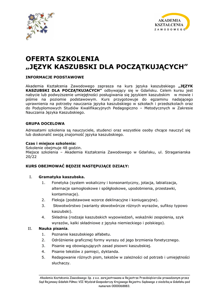 OFERTA SZKOLENIA „JĘZYK KASZUBSKI DLA POCZĄTKUJĄCYCH” INFORMACJE PODSTAWOWE Akademia Kształcenia Zawodowego zaprasza na kurs języka kaszubskiego „JĘZYK KASZUBSKI DLA POCZĄTKUJACYCH” odbywający się w Gdańsku. Celem kursu jest nabycie lub podwyższenie umiejętności posługiwania się językiem kaszubskim w mowie i piśmie na poziomie podstawowym. Kurs przygotowuje do egzaminu nadającego uprawnienia na potrzeby nauczania języka kaszubskiego w szkołach i przedszkolach oraz do Podyplomowych Studiów Kwalifikacyjnych Pedagogiczno – Metodycznych w Zakresie Nauczania Języka Kaszubskiego. GRUPA DOCELOWA Adresatami szkolenia są nauczyciele, studenci oraz wszystkie osoby chcące nauczyć się lub doskonalić swoją znajomość języka kaszubskiego. Czas i miejsce szkolenia: Szkolenie obejmuje 48 godzin. Miejsce szkolenia – Akademia Kształcenia Zawodowego w Gdańsku, ul. Straganiarska 20/22 KURS OBEJMOWAĆ BĘDZIE NASTĘPUJĄCE DZIAŁY: I. Gramatyka kaszubska. 1. Fonetyka (system wokaliczny i konsonantyczny, jotacja, labializacja, alternacje samogłoskowe i spółgłoskowe, upodobnienia, przestawki, kontaminacje). 2. 3. Fleksja (podstawowe wzorce deklinacyjne i koniugacyjne). Słowotwórstwo (warianty słowotwórcze różnych wyrazów, sufiksy typowo kaszubski). 4. Składnia (rodzaje kaszubskich wypowiedzeń, wskaźniki zespolenia, szyk wyrazów, kalki składniowe z języka niemieckiego i polskiego). II. Nauka pisania. 1. Poznanie kaszubskiego alfabetu. 2. Odróżnienie graficznej formy wyrazu od jego brzmienia fonetycznego. 3. Pisanie wg obowiązujących zasad pisowni kaszubskiej. 4. Pisanie tekstów z pamięci, dyktanda. 5. Redagowanie różnych pism, tekstów w zależności od potrzeb i umiejętności słuchaczy. ___________________________________________________________________________________ Akademia Kształcenia Zawodowego Sp. z o.o. zarejestrowana w Rejestrze Przedsiębiorców prowadzonym przez Sąd Rejonowy Gdańsk-Północ VII Wydział Gospodarczy Krajowego Rejestru Sądowego z siedzibą w Gdańsku pod numerem 0000068883. 6. Poprawianie własnych i obcych tekstów kaszubskich przy pomocy dostępnych słowników. III. Ćwiczenia z zakresu rozumienia tekstu (czytanie). 1. Rozumienie tekstów kaszubskich, tłumaczenie ich na język polski. WIELKOŚĆ GRUPY: około 10 - 12 osób MATERIAŁY I SPRZĘT W trakcie szkolenia zapewniamy książki, materiały biurowe (teczki, skoroszyty, długopisy itp.) oraz sprzęt niezbędny do przeprowadzenia wykładów (m.in. laptop i rzutnik multimedialny). ZAŚWIADCZENIA Każdy uczestnik otrzyma zaświadczenie o ukończonym szkoleniu zatwierdzone przez MEN CENA 1398,00 PLN INFORMACJE O WYKŁADOWCY Zajęcia poprowadzą wykładowcy Uniwersytetu Gdańskiego, członkowie Rady Języka Kaszubskiego oraz wykładowcy Akademii Kształcenia Zawodowego NADZÓR WEWNĘTRZNY I GWARANCJA JAKOŚCI: W trakcie szkoleń zapewniamy warunki, w których możliwa jest intensywna wymiana informacji w kierunkach: słuchacz-wykładowca oraz słuchacz-słuchacz, co znacznie indywidualizuje proces nauki. Po każdym szkoleniu organizowanym przez Akademię przeprowadzamy wśród uczestników ankietę wszechstronnie badającą ocenę szkolenia. Osoba uprawniona do kontaktu: Beata Lost, tel/fax 058 346 31 26, e-mail: [email protected] ___________________________________________________________________________________ Akademia Kształcenia Zawodowego Sp. z o.o. zarejestrowana w Rejestrze Przedsiębiorców prowadzonym przez Sąd Rejonowy Gdańsk-Północ VII Wydział Gospodarczy Krajowego Rejestru Sądowego z siedzibą w Gdańsku pod numerem 0000068883.
