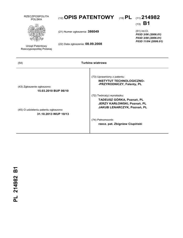 RZECZPOSPOLITA POLSKA (12) OPIS PATENTOWY (19) (21) Numer zgłoszenia: 386049 Urząd Patentowy Rzeczypospolitej Polskiej (22) Data zgłoszenia: 08.09.2008 PL 214982 (13) B1 (11) (51) Int.Cl. F03D 3/06 (2006.01) F03D 3/00 (2006.01) F03D 11/04 (2006.01) Turbina wiatrowa (54) (73) Uprawniony z patentu: (43) Zgłoszenie ogłoszono: INSTYTUT TECHNOLOGICZNO-PRZYRODNICZY, Falenty, PL 15.03.2010 BUP 06/10 (72) Twórca(y) wynalazku: (45) O udzieleniu patentu ogłoszono: TADEUSZ GÓRKA, Poznań, PL JERZY KARŁOWSKI, Poznań, PL JAKUB LENARCZYK, Poznań, PL 31.10.2013 WUP 10/13 (74) Pełnomocnik: PL 214982 B1 rzecz. pat. Zbigniew Ciupiński 2 PL 214 982 B1 Opis wynalazku Przedmiotem wynalazku jest turbina wiatrowa o pionowej osi obrotu służąca do zamiany energii wiatru na moment obrotowy. Znane są turbiny wiatrowe o pionowej osi obrotu zaopatrzone w promieniowo rozmieszczone płaty, które są równoległe do osi obrotu. Z opisu zgłoszenia wynalazku nr 298 245 znany jest silnik wiatrowy posiadający pionowy wał napędowy, do którego za pomocą promieniowych wsporników przytwierdzone są skrzydła o kształcie zbliżonym do prostokąta. Skrzydło ma ramę, w której na osiach osadzone są zastawki mogące odchylać się tylko w jednym kierunku. Znany jest z opisu patentowego nr 162 656 silnik wiatrowy o pionowej osi wirnika mający łopaty, które w przekroju poprzecznym mają kształt skrzydła samolotu. Łopata jest podzielona wzdłuż osi wzdłużnej na dwie części, górną i dolną. Pomiędzy częściami umieszczona jest belka stabilizująco- wzmacniająca. Część górna i dolna łopaty są ze sobą połączone wahliwie. Turbina wiatrowa o pionowej osi obrotu według wynalazku posiadająca co najmniej dwa płaty połączone wspornikami z wałem, charakteryzuje się tym, że płat składa się z jednakowych segmentów połączonych rozłącznie z wspornikami. Segmenty połączone są ze sobą osadzonymi na nich osłonami wsporników. Natomiast na końcach płata osadzone są skrajne osłony wsporników, które zawierają kierownicę strugi powietrza stanowiącą z osłoną wspornika monolityczną całość. Elementy mocujące wsporniki osadzone są na wale przesuwnie oraz w odpowiednich miejscach są na wale blokowane. Turbinę wiatrową według wynalazku charakteryzuje możliwość stosowania jednego typu segmentów oraz wału do turbin o różnych wielkościach. Konstrukcja rozwiązania nadaje się do stosowania dla turbin z płatami prostymi, skośnymi lub spiralnymi. Turbina może mieć dwa lub kilka płatów. Umożliwia to dobranie optymalnego rodzaju turbiny do potrzeb wynikających z warunków wiatrowych. Umieszczenie na końcach płatów osłon z kierownicą powoduje zmniejszenie turbulencji. Możliwość przesuwania na wale elementów mocujących wsporniki i unieruchomienia ich na wale w kilku różnych miejscach, pozwala na zmianę kształtu płatów i parametrów technicznych turbiny. Turbina jest łatwa w montażu i może być produkowana w formie zestawów do samodzielnego montażu, co obniży koszty. Przedmiot wynalazku uwidoczniony jest w przykładzie wykonania na rysunku, na którym fig. 1 przedstawia schematycznie płat turbiny połączony z wałem, fig. 2 przedstawia osłonę wspornika, fig. 3 - skrajną osłonę wspornika. Turbina posiada cztery płaty 1 połączone wspornikami 2 z wałem 3. Każdy płat 1 składa się z trzech identycznych segmentów 4 łączących się z wspornikami 2. W miejscu łączenia dwóch segmentów z wspornikiem osadzona jest osłona wspornika 5 w postaci opaski mającej kształt identyczny jak segment w przekroju poprzecznym. Osłona wspornika 5 obejmuje końce sąsiadujących ze sobą segmentów. Osłona wspornika powoduje zachowanie ciągłości profilu pomiędzy segmentami płata. Na końcach płata 1 osadzone są skrajne osłony wsporników 6, które mają kształt identyczny jak osłona wspornika 5, lecz na końcu posiadają kierownicę 7 w kształcie płaskiego elementu. Osłona wspornika 5 i skrajna osłona wspornika 6 mają wycięcie 8 umożliwiające osadzenie na płacie i końcu wspornika. Wał 3 osadzony jest w łożyskowanej podstawie 9 wyposażonej w nogi 10 umożliwiające umieszczenie płatów turbiny na odpowiedniej wysokości. Wał 3 połączony jest elastycznym sprzęgłem 11 z wolnoobrotową prądnicą. Elementy mocujące 12 wsporniki 2 w postaci półpierścieni osadzone są na wale 3 przesuwnie lecz w odpowiednio wybranych miejscach elementy mocujące 12 są unieruchomione przez zaciśnięcie półpierścieni na wale 3 za pomocą niewidocznych na rysunku śrub. Zastrzeżenia patentowe 1. Turbina wiatrowa o pionowej osi obrotu posiadająca co najmniej dwa płaty połączone wspornikami i elementami mocującymi z wałem, znamienna tym, że płat (1) składa się z jednakowych segmentów (4) połączonych rozłącznie z wspornikami (2) oraz segmenty (4) połączone są ze sobą osadzonymi na nich osłonami wsporników (5), zaś na końcach płata (1) osadzone są skrajne osłony wsporników (6). 2. Turbina wiatrowa według zastrz. 1, znamienna tym, że skrajna osłona wspornika (6) zawiera kierownicę (7) strugi powietrza stanowiącą z nią monolityczną całość. 3. Turbina wiatrowa według zastrz. 1, znamienna tym, że elementy mocujące (12) połączone z wspornikami (2) osadzone są na wale (3) przesuwnie oraz są na nim w określonych położeniach unieruchomione. PL 214 982 B1 Rysunki 3 4 PL 214 982 B1 Departament Wydawnictw UP RP Cena 2,46 zł (w tym 23% VAT)