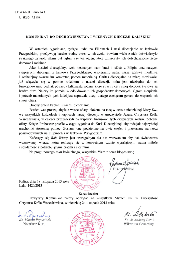 EDWARD JANIAK Biskup Kaliski KOMUNIKAT DO DUCHOWIEŃSTWA I WIERNYCH DIECEZJI KALISKIEJ W ostatnich tygodniach, tysiące ludzi na Filipinach i nasi diecezjanie w Jankowie Przygodzkim, przeżywają bardzo trudny okres w ich życiu, bowiem wielu z nich doświadczyło strasznego żywiołu jakim był tajfun czy też ogień, które zniszczyły ich dotychczasowe życie domowe i rodzinne. Jako kościół diecezjalny, tych nieznanych nam braci i sióstr z Filipin oraz naszych cierpiących diecezjan z Jankowa Przygodzkiego, wspierajmy nadal naszą gorliwą modlitwą i zechciejmy okazać im konkretną pomoc materialną Caritas diecezjalna na miarę możliwości już włączyła się w pomoc rodzinom z naszej diecezji, która jest niezbędna do ich funkcjonowania. Jednak potrzeby kilkunastu rodzin, które straciły cały swój dorobek życiowy są bardzo duże. Należy im pomóc, w odbudowaniu ich gospodarstw domowych. Ogrom cierpienia i potrzeb materialnych tych ludzi jest naprawdę duży, dlatego zachęcam gorąco do wsparcia ich swoją ofiarą. Drodzy bracia kapłani i wierni diecezjanie, Bardzo was proszę, abyście wasze ofiary złożone na tacę w czasie niedzielnej Mszy Św., we wszystkich kościołach i kaplicach naszej diecezji, w uroczystość Jezusa Chrystusa Króla Wszechświata, w całości przeznaczyli na wsparcie finansowe tych cierpiących rodzin. Zebrane ofiary Ksiądz Proboszcz prześle w ciągu tygodnia do Kurii Diecezjalnej, aby móc jak najszybciej uruchomić stosowną pomoc. Zostaną one podzielone na dwie części i przekazane na rzecz poszkodowanych na Filipinach i w Jankowie Przygodzkim. Kończący się Rok Wiary jest szczególnym dla nas wezwaniem aby dać świadectwo wyznawanej wierze, która realizuje się w konkretnym czynie wyrażającym naszą miłość i solidarność z potrzebującymi braćmi i siostrami. Na progu nowego roku kościelnego, wszystkim Wam z serca błogosławię Kalisz, dnia 18 listopada 2013 roku L.dz. 1420/2013 Zarządzenie: Powyższy Komunikat należy odczytać na wszystkich Mszach św. w Uroczystość Chrystusa Króla Wszechświata, w niedzielę 24 listopada 2013 roku.