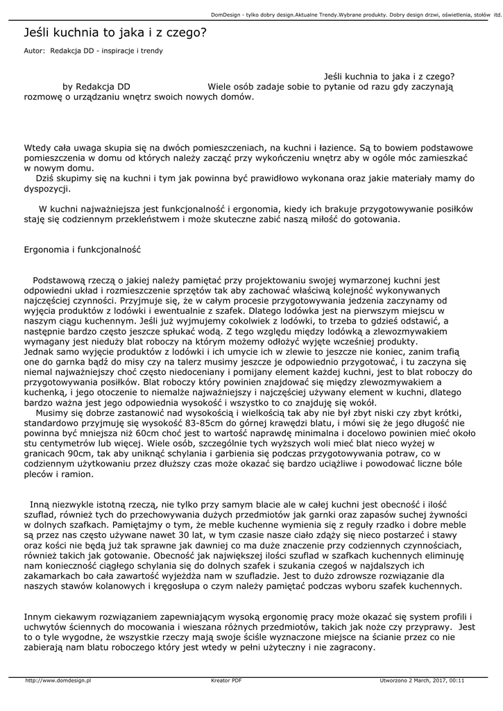 DomDesign - tylko dobry design.Aktualne Trendy.Wybrane produkty. Dobry design drzwi, oświetlenia, stołów itd.. Jeśli kuchnia to jaka i z czego? Autor: Redakcja DD - inspiracje i trendy Jeśli kuchnia to jaka i z czego? by Redakcja DD Wiele osób zadaje sobie to pytanie od razu gdy zaczynają rozmowę o urządzaniu wnętrz swoich nowych domów. Wtedy cała uwaga skupia się na dwóch pomieszczeniach, na kuchni i łazience. Są to bowiem podstawowe pomieszczenia w domu od których należy zacząć przy wykończeniu wnętrz aby w ogóle móc zamieszkać w nowym domu. Dziś skupimy się na kuchni i tym jak powinna być prawidłowo wykonana oraz jakie materiały mamy do dyspozycji. W kuchni najważniejsza jest funkcjonalność i ergonomia, kiedy ich brakuje przygotowywanie posiłków staję się codziennym przekleństwem i może skuteczne zabić naszą miłość do gotowania. Ergonomia i funkcjonalność Podstawową rzeczą o jakiej należy pamiętać przy projektowaniu swojej wymarzonej kuchni jest odpowiedni układ i rozmieszczenie sprzętów tak aby zachować właściwą kolejność wykonywanych najczęściej czynności. Przyjmuje się, że w całym procesie przygotowywania jedzenia zaczynamy od wyjęcia produktów z lodówki i ewentualnie z szafek. Dlatego lodówka jest na pierwszym miejscu w naszym ciągu kuchennym. Jeśli już wyjmujemy cokolwiek z lodówki, to trzeba to gdzieś odstawić, a następnie bardzo często jeszcze spłukać wodą. Z tego względu między lodówką a zlewozmywakiem wymagany jest nieduży blat roboczy na którym możemy odłożyć wyjęte wcześniej produkty. Jednak samo wyjęcie produktów z lodówki i ich umycie ich w zlewie to jeszcze nie koniec, zanim trafią one do garnka bądź do misy czy na talerz musimy jeszcze je odpowiednio przygotować, i tu zaczyna się niemal najważniejszy choć często niedoceniany i pomijany element każdej kuchni, jest to blat roboczy do przygotowywania posiłków. Blat roboczy który powinien znajdować się między zlewozmywakiem a kuchenką, i jego otoczenie to niemalże najważniejszy i najczęściej używany element w kuchni, dlatego bardzo ważna jest jego odpowiednia wysokość i wszystko to co znajduję się wokół. Musimy się dobrze zastanowić nad wysokością i wielkością tak aby nie był zbyt niski czy zbyt krótki, standardowo przyjmuję się wysokość 83-85cm do górnej krawędzi blatu, i mówi się że jego długość nie powinna być mniejsza niż 60cm choć jest to wartość naprawdę minimalna i docelowo powinien mieć około stu centymetrów lub więcej. Wiele osób, szczególnie tych wyższych woli mieć blat nieco wyżej w granicach 90cm, tak aby uniknąć schylania i garbienia się podczas przygotowywania potraw, co w codziennym użytkowaniu przez dłuższy czas może okazać się bardzo uciążliwe i powodować liczne bóle pleców i ramion. Inną niezwykle istotną rzeczą, nie tylko przy samym blacie ale w całej kuchni jest obecność i ilość szuflad, również tych do przechowywania dużych przedmiotów jak garnki oraz zapasów suchej żywności w dolnych szafkach. Pamiętajmy o tym, że meble kuchenne wymienia się z reguły rzadko i dobre meble są przez nas często używane nawet 30 lat, w tym czasie nasze ciało zdąży się nieco postarzeć i stawy oraz kości nie będą już tak sprawne jak dawniej co ma duże znaczenie przy codziennych czynnościach, również takich jak gotowanie. Obecność jak największej ilości szuflad w szafkach kuchennych eliminuję nam konieczność ciągłego schylania się do dolnych szafek i szukania czegoś w najdalszych ich zakamarkach bo cała zawartość wyjeżdża nam w szufladzie. Jest to dużo zdrowsze rozwiązanie dla naszych stawów kolanowych i kręgosłupa o czym należy pamiętać podczas wyboru szafek kuchennych. Innym ciekawym rozwiązaniem zapewniającym wysoką ergonomię pracy może okazać się system profili i uchwytów ściennych do mocowania i wieszana różnych przedmiotów, takich jak noże czy przyprawy. Jest to o tyle wygodne, że wszystkie rzeczy mają swoje ściśle wyznaczone miejsce na ścianie przez co nie zabierają nam blatu roboczego który jest wtedy w pełni użyteczny i nie zagracony. http://www.domdesign.pl Kreator PDF Utworzono 2 March, 2017, 00:11 DomDesign - tylko dobry design.Aktualne Trendy.Wybrane produkty. Dobry design drzwi, oświetlenia, stołów itd.. Ostatnim elementem na jaki należy zwrócić uwagę w kuchni jest płyta grzewcza. Tutaj dodatkowo trzeba zdecydować się na rodzaj płyty, wybrać między elektryczną, indukcyjną bądź gazową w zależności od naszych preferencji lub instalacji w domu. Należy przy tym zwrócić uwagę, że miłośnicy kuchni chińskiej są w pewnym stopniu poszkodowani, gdyż niewiele jest na rynku płyt elektrycznych i indukcyjnych ze specjalnie wyprofilowaną niecką na popularnego chińskiego woka. W zamian za to wielu producentów oferuję płyty gazowe z piątym palnikiem specjalnie przygotowanym do tego naczynia. Wracając do wysokości blatu bardzo ciekawym rozwiązaniem może okazać się zabieg odwrotny do tego jaki opisywany był wcześniej w przypadku wysokości blatu roboczego, tutaj z kolei obniżenie o kilka a nawet naście centymetrów blatu na którym umiejscowiona jest płyta może w interesujący sposób wydzielić nam część do gotowania. Mówi się nawet, że odpowiednia wysokość kuchenki to około 7075cm. Zaowocuje nam to niższym umiejscowieniem górnej krawędzi garnka co przekłada się bezpośrednio na poprawę komfortu podczas gotowania, jednak należy przy tym pamiętać albo w ślad za blatem obniżyć także wyciąg lub zastanowić się nad mocniejszym o większej wydajności. Zasada trójkąta. Projektanci i architekci mówią często o ustawieniu sprzętów kuchennych na planie trójkąta. Jeśli nie jest to możliwe, należy przyjąć zasadę opisywaną powyżej, czyli umieszczenie sprzętów w odpowiedniej kolejności: lodówka, mały