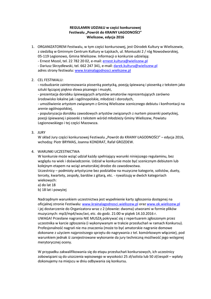 REGULAMIN UDZIAŁU w części konkursowej Festiwalu „Powrót do KRAINY ŁAGODNOŚCI” Wieliszew, edycja 2016 1. ORGANIZATOREM Festiwalu, w tym części konkursowej, jest Ośrodek Kultury w Wieliszewie, z siedzibą w Gminnym Centrum Kultury w Łajskach, ul. Moniuszki 2 / róg Nowodworskiej, 05-119 Legionowo, Gmina Wieliszew. Informacji o konkursie udzielają: - Ernest Mozol, tel. 22 782 20 02, e-mail: [email protected] - Dariusz Skrzydlewski, tel. 662 247 341, e-mail: [email protected] adres strony festiwalu: www.krainalagodnosci.wieliszew.pl 2. CEL FESTIWALU: - rozbudzanie zainteresowania piosenką poetycką, poezją śpiewaną i piosenką z tekstem jako sztuki łączącej piękno słowa pisanego i muzyki, - prezentacja dorobku śpiewających artystów amatorów reprezentujących zarówno środowisko lokalne jak i ogólnopolskie, młodzież i dorosłych, - umożliwienie artystom związanym z Gminą Wieliszew scenicznego debiutu i konfrontacji na arenie ogólnopolskiej, - popularyzacja dorobku zawodowych artystów związanych z nurtem piosenki poetyckiej, poezji śpiewanej i piosenki z tekstem wśród młodzieży Gminy Wieliszew, Powiatu Legionowskiego i tej części Mazowsza. 3. JURY W skład Jury części konkursowej Festiwalu „Powrót do KRAINY ŁAGODNOŚCI” – edycja 2016, wchodzą: Piotr BRYMAS, Joanna KONDRAT, Rafał GROZDEW. 4. WARUNKI UCZESTNICTWA W konkursie może wziąć udział każdy spełniający warunki niniejszego regulaminu, bez względu na wiek i doświadczenie. Udział w konkursie może być scenicznym debiutem lub kolejnym etapem na wciąż amatorskiej drodze do zawodowstwa. Uczestnicy – podmioty artystyczne bez podziałów na muzyczne kategorie, solistów, duety, tercety, kwartety, zespoły, bardów z gitarą, etc. - rywalizują w dwóch kategoriach wiekowych: a) do lat 18 b) 18 lat i powyżej Nadrzędnym warunkiem uczestnictwa jest wypełnienie karty zgłoszenia dostępnej na oficjalnej stronie Festiwalu: www.krainalagodnosci.wieliszew.pl oraz www.ok.wieliszew.pl i jej dostarczenie do Organizatora wraz z 2 (słownie: dwoma) utworami w formie plików muzycznych: mp3/mp4/wav/avi, etc. do godz. 21:00 w piątek 14.10.2016 r. UWAGA! Przesłane nagrania NIE MUSZĄ pokrywać się z repertuarem zgłoszonym przez uczestnika w karcie zgłoszenia (i wykonywanym w trakcie przesłuchań w ramach Konkursu). Profesjonalność nagrań nie ma znaczenia (może to być amatorskie nagranie domowe dokonane z użyciem najprostszego sprzętu do nagrywania z tel. komórkowym włącznie), pod warunkiem jednak iż zarejestrowane wykonanie da jury techniczną możliwość jego wstępnej merytorycznej oceny. W przypadku zakwalifikowania się do etapu przesłuchań konkursowych, ich uczestnicy zobowiązani są do uiszczenia wpisowego w wysokości 25 zł/solista lub 50 zł/zespół – wpłaty dokonujemy na miejscu w dniu odbywania się konkursu. 5. ZGŁOSZENIA Wypełnioną kartę zgłoszenia wraz z nagraniami należy dostarczyć Organizatorowi (do wyboru): - osobiście do biura Gminnego Centrum Kultury w Łajskach (ul. Stanisława Moniuszki 2 / róg Nowodworskiej, poniedziałek-piątek w godz. 9:00-21:00, soboty w godz. 9:00-15:00), - na adres mejlowy: [email protected] (uwaga, pliki muzyczne nie większe niż 10mb), - pocztą (za dostarczenie karty zgłoszenia wraz z nagraniem na płycie cd / dvd w terminie przyjmujemy jego faktyczne otrzymanie najpóźniej w dniu 14.10.2016 r., nie decyduje stempel pocztowy) z dopiskiem „KONKURS KRAINA ŁAGODNOŚCI 2016”, na adres: Ośrodek Kultury w Wieliszewie Gminne Centrum Kultury Łajski, ul. Moniuszki 2, 05-119 Legionowo 6. ETAPY KONKURSU: - eliminacje (do 14.10.2016 r.) Etap eliminacji przebiega korespondencyjnie – organizatorzy rejestrują zgłoszenia a jury wstępnie ocenia dostarczone utwory i tworzy listę podmiotów artystycznych zakwalifikowanych do przesłuchań konkursowych. Uczestnicy otrzymują informację o kwalifikacji do dnia 18.10.2016 r. - przesłuchania konkursowe (22.10.2016 r., godz. 11:00) Przesłuchania konkursowe odbywają się w dniu 22.10.2016 r. (start o godz. 11:00 – możliwa zmiana w zależności od ilości zgłoszeń, obiekt otwarty od godz. 10:00 – w miarę możliwości uczestników prosimy o wcześniejsze przybycie i uregulowanie opłaty startowej), w Sali Koncertowej im. Krzysztofa Klenczona w Wieliszewie (kompleks administracyjny przy ul. Modlińskiej 1) wg ustalonej przez jury kolejności prezentacji. Przed rozpoczęciem przesłuchań ich uczestnicy wpłacają (na miejscu) Organizatorowi wpisowe w wysokości 25 zł/solista lub 50 zł/zespół. - koncert laureatów i zaproszonych artystów (22.10.2016 r., godz. 18:00) W koncercie laureatów udział wezmą nagrodzeni przez jury uczestnicy przesłuchań – zdobywcy I, II, III miejsca oraz (na prośbę i wskazanie Jury/Organizatorów) wyróżnień. Obok laureatów konkursu na scenie wystąpią ŁUKASZ NOWAK i MARCIN SNOKOWSKI. 7. KRYTERIA OCENY JURY Przyjęta przez organizatorów otwarta formuła dopuszcza zarówno wykonywanie cudzych utworów oraz ich prezentację przy mechanicznym akompaniamencie (na płycie cd lub innym nośniku, o którym powiadamiamy w karcie zgłoszenia) jak i autorskie kompozycje muzyczne, własne teksty oraz akompaniament „na żywo”. 8. NAGRODY Jury przyzna I, II, III miejsce i wyróżnienia w obu kategoriach wiekowych. Jury zastrzega jednocześnie prawo do nie przyznania poszczególnych nagród lub przyznania dwóch i więcej nagród równoległych. Pula nagród w konkursie wynosi około 2000 PLN (słownie: dwa tysiące polskich nowych złotych) do rozdysponowania wg decyzji jury (proponowane nagrody pieniężne w obu kat. wiekowych: miejsce 1 – 400 zł, miejsce II – 300 zł, miejsce III – 200 zł, wyróżnienie – nagroda rzeczowa), w postaci bonów wartościowych lub nagród rzeczowych. 9. UWAGI ORGANIZATORA a) Organizator zastrzega, że przyjazd i ubezpieczenie finalistów odbywają się na ich własny koszt. b) W ka
