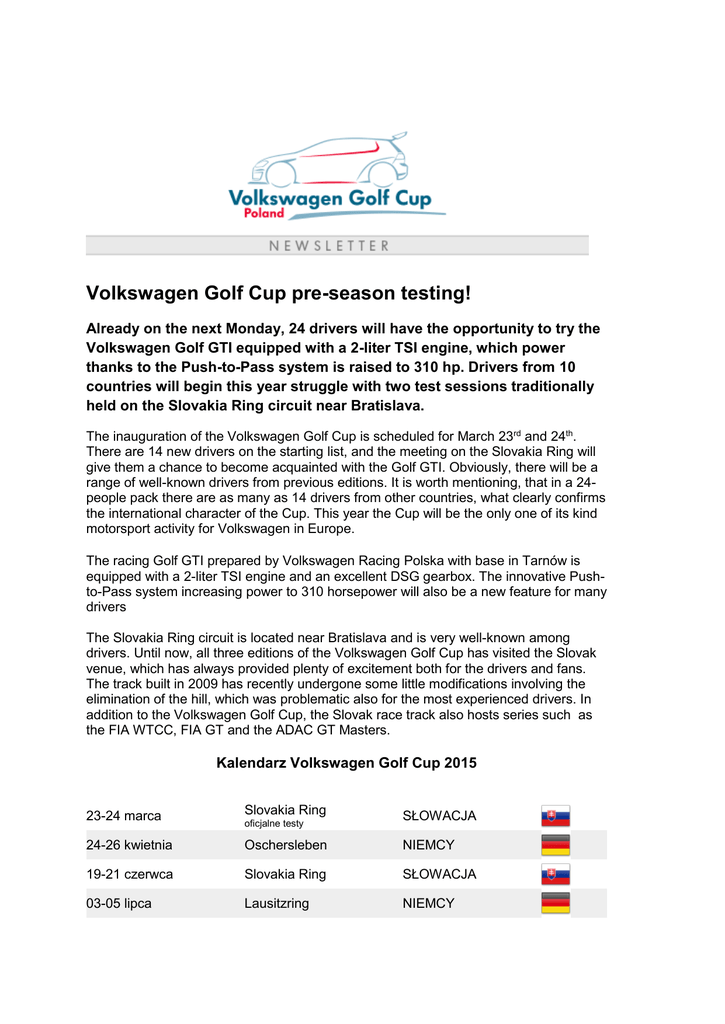Volkswagen Golf Cup pre-season testing! Already on the next Monday, 24 drivers will have the opportunity to try the Volkswagen Golf GTI equipped with a 2-liter TSI engine, which power thanks to the Push-to-Pass system is raised to 310 hp. Drivers from 10 countries will begin this year struggle with two test sessions traditionally held on the Slovakia Ring circuit near Bratislava. The inauguration of the Volkswagen Golf Cup is scheduled for March 23rd and 24th. There are 14 new drivers on the starting list, and the meeting on the Slovakia Ring will give them a chance to become acquainted with the Golf GTI. Obviously, there will be a range of well-known drivers from previous editions. It is worth mentioning, that in a 24people pack there are as many as 14 drivers from other countries, what clearly confirms the international character of the Cup. This year the Cup will be the only one of its kind motorsport activity for Volkswagen in Europe. The racing Golf GTI prepared by Volkswagen Racing Polska with base in Tarnów is equipped with a 2-liter TSI engine and an excellent DSG gearbox. The innovative Pushto-Pass system increasing power to 310 horsepower will also be a new feature for many drivers The Slovakia Ring circuit is located near Bratislava and is very well-known among drivers. Until now, all three editions of the Volkswagen Golf Cup has visited the Slovak venue, which has always provided plenty of excitement both for the drivers and fans. The track built in 2009 has recently undergone some little modifications involving the elimination of the hill, which was problematic also for the most experienced drivers. In addition to the Volkswagen Golf Cup, the Slovak race track also hosts series such as the FIA WTCC, FIA GT and the ADAC GT Masters. Kalendarz Volkswagen Golf Cup 2015 23-24 marca Slovakia Ring 24-26 kwietnia Oschersleben NIEMCY 19-21 czerwca Slovakia Ring SŁOWACJA 03-05 lipca Lausitzring NIEMCY oficjalne testy SŁOWACJA 28-30 sierpnia Sachsenring NIEMCY 18-20 września Automotodrom Brno CZECHY 02-03 października Tor Poznań POLSKA Lista startowa w sezonie 2015 1. ARRIOLA Sebastian GWATEMALA 2. ARTEMYEV Alexandr KAZACHSTAN 3. DUDEK Jerzy POLSKA 4. EGOROV Artur ROSJA 5. FAHNAUER Manuel NIEMCY 6. FLUCH Marcus SZWECJA 7. GADOMSKI Michał POLSKA 8. GIES Andre NIEMCY 9. HOFFMANN Pascal NIEMCY 10. IBRAGIMOV Ilshat ROSJA 11. JAROS Marcin POLSKA 12. KOTARBA-MAJKUTEWICZ Dominik POLSKA 13. KRAMER Alfred AUSTRIA 14. KRUGER Jeffrey RPA 15. LARSSON Simon NIEMCY 16. METZNER Kevin NIEMCY 17. MUHONEN Simo FINLANDIA 18. PALUSKO Bartosz POLSKA 19. PARYS Piotr POLSKA 20. PEREIRA Dylan LUKSEMBURG 21. RDEST Gosia POLSKA 22. RZEPECKI Adam POLSKA 23. STRZESAK Patryk POLSKA SZCZEŚNIAK Jędrzej 24. POLSKA Nowy logotyp pucharu Volkswagen Golf Cup: Do pobrania plik JPG RGB i plik EPS CMYK Kontakt dla mediów: Koordynacja PR (WRC Public Relations): Wojciech Garbarz, tel. 606 221 000, e-mail: [email protected]
