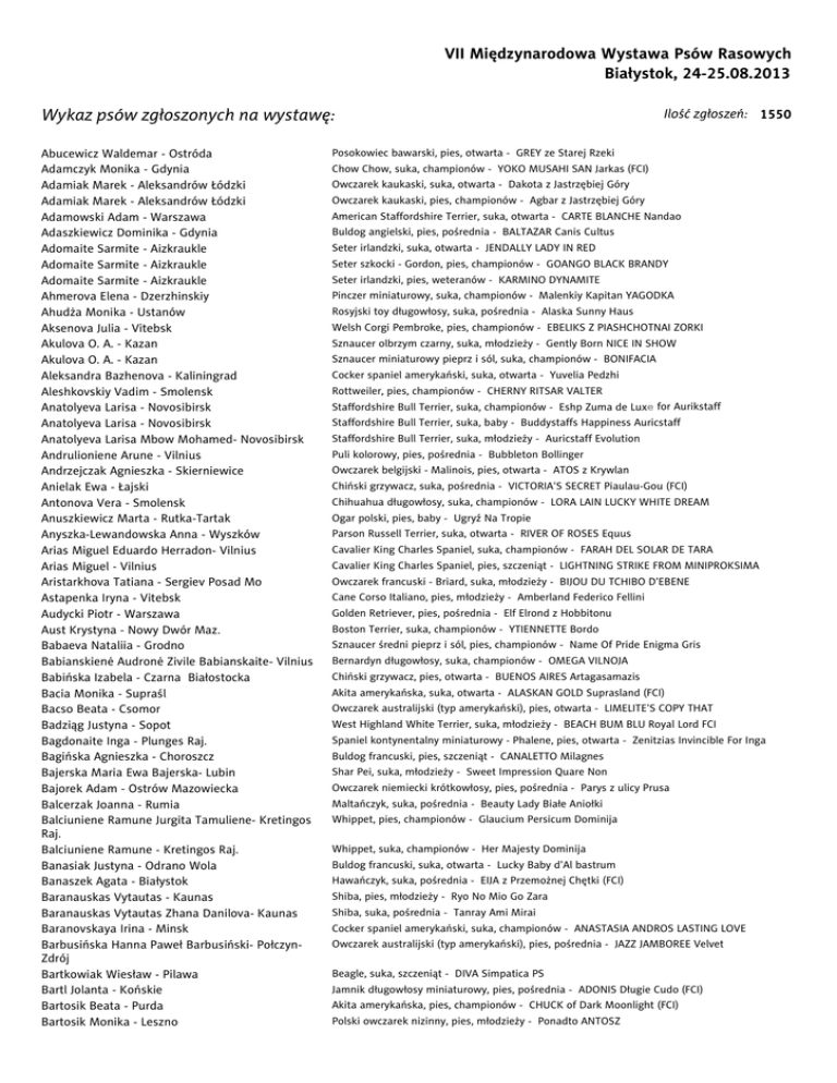 VII Międzynarodowa Wystawa Psów Rasowych Białystok, 24-25.08.2013 Wykaz psów zgłoszonych na wystawę: Abucewicz Waldemar - Ostróda Adamczyk Monika - Gdynia Adamiak Marek - Aleksandrów Łódzki Adamiak Marek - Aleksandrów Łódzki Adamowski Adam - Warszawa Adaszkiewicz Dominika - Gdynia Adomaite Sarmite - Aizkraukle Adomaite Sarmite - Aizkraukle Adomaite Sarmite - Aizkraukle Ahmerova Elena - Dzerzhinskiy Ahudża Monika - Ustanów Aksenova Julia - Vitebsk Akulova O. A. - Kazan Akulova O. A. - Kazan Aleksandra Bazhenova - Kaliningrad Aleshkovskiy Vadim - Smolensk Anatolyeva Larisa - Novosibirsk Anatolyeva Larisa - Novosibirsk Anatolyeva Larisa Mbow Mohamed- Novosibirsk Andrulioniene Arune - Vilnius Andrzejczak Agnieszka - Skierniewice Anielak Ewa - Łajski Antonova Vera - Smolensk Anuszkiewicz Marta - Rutka-Tartak Anyszka-Lewandowska Anna - Wyszków Arias Miguel Eduardo Herradon- Vilnius Arias Miguel - Vilnius Aristarkhova Tatiana - Sergiev Posad Mo Astapenka Iryna - Vitebsk Audycki Piotr - Warszawa Aust Krystyna - Nowy Dwór Maz. Babaeva Nataliia - Grodno Babianskienė Audronė Zivile Babianskaite- Vilnius Babińska Izabela - Czarna Białostocka Bacia Monika - Supraśl Bacso Beata - Csomor Badziąg Justyna - Sopot Bagdonaite Inga - Plunges Raj. Bagińska Agnieszka - Choroszcz Bajerska Maria Ewa Bajerska- Lubin Bajorek Adam - Ostrów Mazowiecka Balcerzak Joanna - Rumia Balciuniene Ramune Jurgita Tamuliene- Kretingos Raj. Balciuniene Ramune - Kretingos Raj. Banasiak Justyna - Odrano Wola Banaszek Agata - Białystok Baranauskas Vytautas - Kaunas Baranauskas Vytautas Zhana Danilova- Kaunas Baranovskaya Irina - Minsk Barbusińska Hanna Paweł Barbusiński- PołczynZdrój Bartkowiak Wiesław - Pilawa Bartl Jolanta - Końskie Bartosik Beata - Purda Bartosik Monika - Leszno Ilość zgłoszeń: 1550 Posokowiec bawarski, pies, otwarta - GREY ze Starej Rzeki Chow Chow, suka, championów - YOKO MUSAHI SAN Jarkas (FCI) Owczarek kaukaski, suka, otwarta - Dakota z Jastrzębiej Góry Owczarek kaukaski, pies, championów - Agbar z Jastrzębiej Góry American Staffordshire Terrier, suka, otwarta - CARTE BLANCHE Nandao Buldog angielski, pies, pośrednia - BALTAZAR Canis Cultus Seter irlandzki, suka, otwarta - JENDALLY LADY IN RED Seter szkocki - Gordon, pies, championów - GOANGO BLACK BRANDY Seter irlandzki, pies, weteranów - KARMINO DYNAMITE Pinczer miniaturowy, suka, championów - Malenkiy Kapitan YAGODKA Rosyjski toy długowłosy, suka, pośrednia - Alaska Sunny Haus Welsh Corgi Pembroke, pies, championów - EBELIKS Z PIASHCHOTNAI ZORKI Sznaucer olbrzym czarny, suka, młodzieży - Gently Born NICE IN SHOW Sznaucer miniaturowy pieprz i sól, suka, championów - BONIFACIA Cocker spaniel amerykański, suka, otwarta - Yuvelia Pedzhi Rottweiler, pies, championów - CHERNY RITSAR VALTER Staffordshire Bull Terrier, suka, championów - Eshp Zuma de Luxе for Aurikstaff Staffordshire Bull Terrier, suka, baby - Buddystaffs Happiness Auricstaff Staffordshire Bull Terrier, suka, młodzieży - Auricstaff Evolution Puli kolorowy, pies, pośrednia - Bubbleton Bollinger Owczarek belgijski - Malinois, pies, otwarta - ATOS z Krywlan Chiński grzywacz, suka, pośrednia - VICTORIA'S SECRET Piaulau-Gou (FCI) Chihuahua długowłosy, suka, championów - LORA LAIN LUCKY WHITE DREAM Ogar polski, pies, baby - Ugryź Na Tropie Parson Russell Terrier, suka, otwarta - RIVER OF ROSES Equus Cavalier King Charles Spaniel, suka, championów - FARAH DEL SOLAR DE TARA Cavalier King Charles Spaniel, pies, szczeniąt - LIGHTNING STRIKE FROM MINIPROKSIMA Owczarek francuski - Briard, suka, młodzieży - BIJOU DU TCHIBO D'EBENE Cane Corso Italiano, pies, młodzieży - Amberland Federico Fellini Golden Retriever, pies, pośrednia - Elf Elrond z Hobbitonu Boston Terrier, suka, championów - YTIENNETTE Bordo Sznaucer średni pieprz i sól, pies, championów - Name Of Pride Enigma Gris Bernardyn długowłosy, suka, championów - OMEGA VILNOJA Chiński grzywacz, pies, otwarta - BUENOS AIRES Artagasamazis Akita amerykańska, suka, otwarta - ALASKAN GOLD Suprasland (FCI) Owczarek australijski (typ amerykański), pies, otwarta - LIMELITE'S COPY THAT West Highland White Terrier, suka, młodzieży - BEACH BUM BLU Royal Lord FCI Spaniel kontynentalny miniaturowy - Phalene, pies, otwarta - Zenitzias Invincible For Inga Buldog francuski, pies, szczeniąt - CANALETTO Milagnes Shar Pei, suka, młodzieży - Sweet Impression Quare Non Owczarek niemiecki krótkowłosy, pies, pośrednia - Parys z ulicy Prusa Maltańczyk, suka, pośrednia - Beauty Lady Białe Aniołki Whippet, pies, championów - Glaucium Persicum Dominija Whippet, suka, championów - Her Majesty Dominija Buldog francuski, suka, otwarta - Lucky Baby d'Al bastrum Hawańczyk, suka, pośrednia - EIJA z Przemożnej Chętki (FCI) Shiba, pies, młodzieży - Ryo No Mio Go Zara Shiba, suka, pośrednia - Tanray Ami Mirai Cocker spaniel amerykański, suka, championów - ANASTASIA ANDROS LASTING LOVE Owczarek australijski (typ amerykański), pies, pośrednia - JAZZ JAMBOREE Velvet Beagle, suka, szczeniąt - DIVA Simpatica PS Jamnik długowłosy miniaturowy, pies, pośrednia - ADONIS Długie Cudo (FCI) Akita amerykańska, pies, championów - CHUCK of Dark Moonlight (FCI) Polski owczarek nizinny, pies, młodzieży - Ponadto ANTOSZ Bartoszcze Lucyna - Motycz Batozskaya Marina Svetlana Vinediktova- Moscow Batozskaya Marina - Moscow Bąk Beata - Świątki Bednara Lidia - Stalowa Wola Bednarska Ewa - Warszawa Bednarska Ewa - Warszawa Bednarska Ewa - Warszawa Bednarska Joanna - Olsztyn Bednarska Joanna - Olsztyn Belugina Elena - Sankt-Peterburg Benka Katarzyna - Gdańsk Benka Katarzyna - Gdańsk Bezruk Janna - Krasnogorsk Bezruk Janna - Krasnogorsk Białooki Bartosz - Gdańsk Białowicz Robert - Białystok Bielecka Zofia - Warszawa Bielecki Piotr Stanisław Kościuch- Suwałki Bielecki Piotr - Suwałki Bielinyte Lina - Kritizio Km., Raguvos Sen. Bielinyte Lina - Kritizio Km., Raguvos Sen. Birycka Ewa - Kr