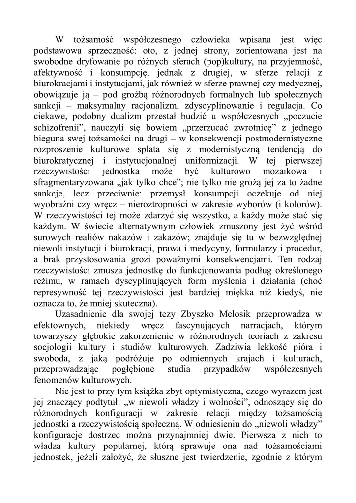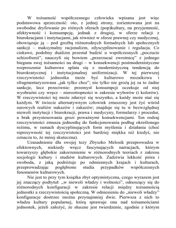 W tożsamość współczesnego człowieka wpisana jest więc podstawowa sprzeczność: oto, z jednej strony, zorientowana jest na swobodne dryfowanie po różnych sferach (pop)kultury, na przyjemność, afektywność i konsumpcję, jednak z drugiej, w sferze relacji z biurokracjami i instytucjami, jak również w sferze prawnej czy medycznej, obowiązuje ją – pod groźbą różnorodnych formalnych lub społecznych sankcji – maksymalny racjonalizm, zdyscyplinowanie i regulacja. Co ciekawe, podobny dualizm przestał budzić u współczesnych „poczucie schizofrenii”, nauczyli się bowiem „przerzucać zwrotnicę” z jednego bieguna swej tożsamości na drugi – w konsekwencji postmodernistyczne rozproszenie kulturowe splata się z modernistyczną tendencją do biurokratycznej i instytucjonalnej uniformizacji. W tej pierwszej rzeczywistości jednostka może być kulturowo mozaikowa i sfragmentaryzowana „jak tylko chce”; nie tylko nie grożą jej za to żadne sankcje, lecz przeciwnie: przemysł konsumpcji oczekuje od niej wyobraźni czy wręcz – nieroztropności w zakresie wyborów (i kolorów). W rzeczywistości tej może zdarzyć się wszystko, a każdy może stać się każdym. W świecie alternatywnym człowiek zmuszony jest żyć wśród surowych realiów nakazów i zakazów; znajduje się tu w bezwzględnej niewoli instytucji i biurokracji, prawa i medycyny, formularzy i procedur, a brak przystosowania grozi poważnymi konsekwencjami. Ten rodzaj rzeczywistości zmusza jednostkę do funkcjonowania podług określonego reżimu, w ramach dyscyplinujących form myślenia i działania (choć represywność tej rzeczywistości jest bardziej miękka niż kiedyś, nie oznacza to, że mniej skuteczna). Uzasadnienie dla swojej tezy Zbyszko Melosik przeprowadza w efektownych, niekiedy wręcz fascynujących narracjach, którym towarzyszy głębokie zakorzenienie w różnorodnych teoriach z zakresu socjologii kultury i studiów kulturowych. Zadziwia lekkość pióra i swoboda, z jaką podróżuje po odmiennych krajach i kulturach, przeprowadzając pogłębione studia przypadków współczesnych fenomenów kulturowych. Nie jest to przy tym książka zbyt optymistyczna, czego wyrazem jest jej znaczący podtytuł: „w niewoli władzy i wolności”, odnoszący się do różnorodnych konfiguracji w zakresie relacji między tożsamością jednostki a rzeczywistością społeczną. W odniesieniu do „niewoli władzy” konfiguracje dostrzec można przynajmniej dwie. Pierwsza z nich to władza kultury popularnej, którą sprawuje ona nad tożsamościami jednostek, jeżeli założyć, że słuszne jest twierdzenie, zgodnie z którym jednostka poddaje się w sposób bezwolny i bezrefleksyjny narzucanym jej znaczeniom, formom konsumpcji czy przyjemności. Druga konfiguracja związana jest z władzą sprawowaną przez biurokrację, szereg instytucji, prawo bądź medycynę, poprzez szereg procesów dyscyplinujących i regulujących tożsamość. Widniejąca w podtytule druga z kategorii – wolność – pozornie tylko ma charakter emancypujący; paradoksalnie, wolność może być zniewalająca, gdyż skazuje jednostkę na konieczność dokonywania nieustannych wyborów, co oznacza przejęcie całkowitej odpowiedzialności za swoje życie (bez możliwości oparcia się na społeczności). Swobodne dryfowanie przez popkulturę w celu maksymalizacji ekspresji wolności może nabrać charakteru kompulsywnego – jednostka zaczyna wówczas praktykować swoją wolność bez przeznaczenia; odrywa się od wszelkich ideałów i stanowi wartość samą w sobie. Zamienia się w swobodną podróż bez końca. Niekiedy jest redukowana do wolności wyboru spośród dostępnych gadżetów kulturowych. Zamienia się w swoje przeciwieństwo. Nie można przed nią uciec w neurotycznej kakafonii rywalizujących ze sobą możliwości, jakie oferuje przemysł pop-kultury i konsumpcji. I tak w rozdziale pierwszym części pierwszej Zbyszko Melosik, konfrontuje, wykorzystując przy tym dziesiątki kulturowych przykładów, koncepcję homologii Pierre’a Bourdieu z ideą „wszystkożerności” kulturowej – w kontekście kultury wysokiej i popularnej: Jakie znaczenie, z jakiegokolwiek powodu, może mieć sposób, w jaki odczytuje obraz Rembrandta wyrafinowany intelektualista i z drugiej strony – robotnik? Cóż z tego, że ten pierwszy być może „wie wszystko”, a ten drugi „nie wie nic”? Obecnie każda interpretacja zdaje się być społecznie dozwolona, a nawet równoprawna – ważne jest to, co widzi i pojmuje jednostka1. I dalej: Można w tym miejscu dodać, że w takich przypadkach następuje paradoksalne obustronne wzajemne potwierdzanie swojego kulturowego znaczenia (i prestiżu!) przez te tradycyjnie kontrastowane ze sobą praktyki kulturowe, jakimi są kultura wysoka i kultura popularna. Koncert gwiazdy rocka czy nawet popu, który ma 1 Z. Melosik, Kultura popularna i tożsamość młodzieży. W niewoli władzy i wolności, IMPULS, Kraków 2013, s. 24. miejsce w filharmonii w towarzystwie znakomitej orkiestry staje się wydarzeniem niekiedy wręcz „elitarnym”, który podważa samą logikę podziału praktyk kulturowych na wysokie i niskie. Gwiazda i jej muzyka są w tym kontekście uprawomocniane przez dyrygenta i smyczki. Banalne dźwięki nabierają wzniosłej, klasycznej stylizacji. Z kolei orkiestra symfoniczna uzyskuje swoje popularne uprawomocnienie, nie tylko poprzez przechwytywanie części sławy od gwiazdy, ale także poprzez pokazanie, iż muzyka klasyczna może stanowić wspaniała oprawę dla muzyki pop. I mówiąc ironicznie, już nie wiadomo, kogo „spotkał zaszczyt” – czy Amy McDonalds, iż zechciała z nią wystąpić znakomita orkiestra symfoniczna, czy znakomitą orkiestrę symfoniczną, iż miała unikatową możliwości towarzyszyć popularnej piosenkarce2. W rozdziale drugim, wykorzystując zarówno teorię klasyków, jak i kontestatorów brytyjskich studi