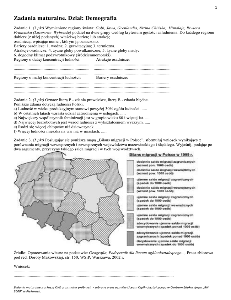 1 Zadania maturalne. Dział: Demografia Zadanie 1. (3 pkt) Wymienione regiony świata: Gobi, Jawa, Grenlandia, Nizina Chińska, Himalaje, Riwiera Francuska (Lazurowe Wybrzeże) podziel na dwie grupy według kryterium gęstości zaludnienia. Do każdego regionu dobierz (z niżej podanych) właściwą barierę lub atrakcję osadniczą, wpisując numer, którym ją oznaczono. Bariery osadnicze: 1. wodna; 2. grawitacyjna; 3. termiczna. Atrakcje osadnicze: 4. żyzne gleby powulkaniczne; 5. żyzne gleby mady; 6. dogodny klimat podzwrotnikowy (śródziemnomorski). Regiony o dużej koncentracji ludności: Atrakcje osadnicze: ....................................................................... ....................................................................... ....................................................................... ........................................................................ ...................................................................... ........................................................................ Regiony o małej koncentracji ludności: Bariery osadnicze: ....................................................................... ....................................................................... ....................................................................... ........................................................................ ...................................................................... ........................................................................ Zadanie 2. (3 pkt) Oznacz literą P - zdania prawdziwe, literą B - zdania błędne. Poniższe zdania dotyczą ludności Polski. a) Ludność w wieku produkcyjnym stanowi powyżej 30% ogółu ludności. ..... b) W ostatnich latach wzrasta udział zatrudnienia w usługach. ..... c) Największy współczynnik feminizacji jest w grupie wieku 80 i więcej lat. ..... d) Najwięcej bezrobotnych jest wśród ludności z wykształceniem wyższym. ..... e) Rodzi się więcej chłopców niż dziewczynek. ..... f) Więcej ludności mieszka na wsi niż w miastach. ..... Zadanie 3. (5 pkt) Posługując się poniższą mapą „Bilans migracji w Polsce”, sformułuj wniosek wynikający z porównania migracji wewnętrznych i zewnętrznych województwa mazowieckiego i śląskiego. Wyjaśnij, podając po dwa argumenty, przyczyny takiego salda migracji w tych województwach. Źródło: Opracowanie własne na podstawie: Geografia, Podręcznik dla liceum ogólnokształcącego..., Praca zbiorowa pod red. Doroty Makowskiej, str. 150, WSiP, Warszawa, 2002 r. Wniosek: ...................................................................................................................................................... ...................................................................................................................................................... ...................................................................................................................................................... Zadania maturalne z arkuszy OKE oraz matur próbnych - zebrane przez uczniów Liceum Ogólnokształcącego w Centrum Edukacyjnym „RN 2000” w Piekarach. 2 Wyjaśnienie przyczyny salda migracji: Województwo mazowieckie: ...................................................................................................................................................... ...................................................................................................................................................... ...................................................................................................................................................... ...................................................................................................................................................... Województwo śląskie: ...................................................................................................................................................... ...................................................................................................................................................... ...................................................................................................................................................... ...................................................................................................................................................... Zadanie 4. (3 pkt) Z wymienionych niżej określeń zakreśl trzy, które dotyczą krajów wysoko rozwiniętych: a) w strukturze wiekowej duży udział ludności w podeszłym wieku b) przewaga surowców w strukturze towarowej eksportu c) przewaga zatrudnienia w rolnictwie d) znaczny udział usług w tworzeniu PKB e) duże zasoby taniej siły roboczej f) duże zużycie energii elektrycznej na jednego mieszkańca Zadanie 5. (2 pkt) Wyjaśnij, podając dwa argumenty, dlaczego średnia długość życia ludności jest jednym z mierników poziomu rozwoju gospodarczego państw. ...................................................................................................................................................... ...................................................................................................................................................... ...................................................................................................................................................... ...................................................................................................................................................... ...................................................................................................................................................... Zadanie 6. (2 pkt) Globalizację można różnie oceniać. Jak każdy proces o charakterze światowym ma swe pozytywne, ale i również negatywne
