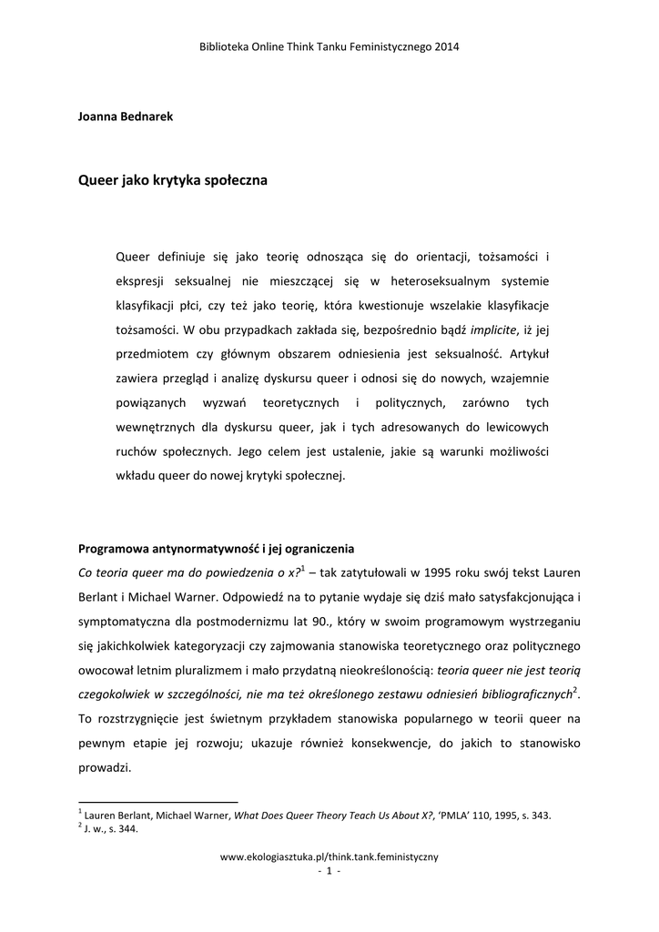 Biblioteka Online Think Tanku Feministycznego 2014 Joanna Bednarek Queer jako krytyka społeczna Queer definiuje się jako teorię odnosząca się do orientacji, tożsamości i ekspresji seksualnej nie mieszczącej się w heteroseksualnym systemie klasyfikacji płci, czy też jako teorię, która kwestionuje wszelakie klasyfikacje tożsamości. W obu przypadkach zakłada się, bezpośrednio bądź implicite, iż jej przedmiotem czy głównym obszarem odniesienia jest seksualność. Artykuł zawiera przegląd i analizę dyskursu queer i odnosi się do nowych, wzajemnie powiązanych wyzwań teoretycznych i politycznych, zarówno tych wewnętrznych dla dyskursu queer, jak i tych adresowanych do lewicowych ruchów społecznych. Jego celem jest ustalenie, jakie są warunki możliwości wkładu queer do nowej krytyki społecznej. Programowa antynormatywność i jej ograniczenia Co teoria queer ma do powiedzenia o x?1 – tak zatytułowali w 1995 roku swój tekst Lauren Berlant i Michael Warner. Odpowiedź na to pytanie wydaje się dziś mało satysfakcjonująca i symptomatyczna dla postmodernizmu lat 90., który w swoim programowym wystrzeganiu się jakichkolwiek kategoryzacji czy zajmowania stanowiska teoretycznego oraz politycznego owocował letnim pluralizmem i mało przydatną nieokreślonością: teoria queer nie jest teorią czegokolwiek w szczególności, nie ma też określonego zestawu odniesień bibliograficznych2. To rozstrzygnięcie jest świetnym przykładem stanowiska popularnego w teorii queer na pewnym etapie jej rozwoju; ukazuje również konsekwencje, do jakich to stanowisko prowadzi. 1 2 Lauren Berlant, Michael Warner, What Does Queer Theory Teach Us About X?, ‘PMLA’ 110, 1995, s. 343. J. w., s. 344. www.ekologiasztuka.pl/think.tank.feministyczny - 1 - Biblioteka Online Think Tanku Feministycznego 2014 Teoria queer zdaje się bowiem, czy też do niedawna zdawała, oscylować między dwoma biegunami. Z jednej strony jej właściwym i uprawnionym przedmiotem jest seksualna odmienność czy też nienormatywność. Jest ona teorią tworzoną przez odmieńców, dla odmieńców i o odmieńcach. Co więcej, jej głównym założeniem ma być opieranie się skłonności do katalogowania, opatrywania etykietkami, szufladkowania przypadków tej odmienności3. Queer wyłonił się w reakcji na poczucie niewystarczalności dwóch podejść metodologicznych: perspektywy feministycznej operującej kategorią płci kulturowej oraz perspektywy studiów gejowskich i lesbijskich. Choć narodziły się one jako próby zakwestionowania patriarchalnego i heteronormatywnego systemu klasyfikacji, obie te perspektywy z czasem zaczęły zdradzać tendencję do przeradzania się w dziedziny o ściśle określonych, nieprzepuszczalnych granicach, co zrodziło potrzebę stworzenia teorii (dla) tych, którzy i które nie byli widoczni w ich obrębie albo nie czuli się przez nie reprezentowani. Z drugiej strony, właśnie ten nacisk na unikanie dookreśleń sprawia, że teoria queer nie powinna posiadać żadnego właściwego sobie przedmiotu: [q]ueer oznacza opór wobec kategorii tożsamościowych albo łatwych kategoryzacji4. Jego wyznacznikiem ma być nie określone tematycznie pole badawcze, ale sam gest kwestionowania tego, co normatywne – jak się czasem implicite zakłada, chodzi o normatywność seksualną, jednak takie ograniczenie oznaczałoby przecież zawężenie i nieuprawnione zamknięcie horyzontu badawczego. Jak zauważa Judith Butler w tekście Against Proper Objects, wspomniane przypisywanie teorii queer seksualności (tzn. orientacji, tożsamości i ekspresji seksualnej) jako właściwego przedmiotu stanowi konsekwencję wcześniejszego oddzielenia women’s i gender studies od studiów gejowskich i lesbijskich5. Zaproponowane przez Gayle Rubin w 1983 roku6 w 3 Zob. Annamarie Jagose, Queer Theory. A Introduction, Melbourne-New York 1996. Noreen Giffney, Introduction: the ‘q’ Word, w: Giffney Noreen, O’Rourke Michael (red.), The Ashgate Research Companion to Queer Theory, Farnham-Burlington 2009, s. 2. 5 Judith Butler, Against Proper Objects. Introduction, ‘differences’ 6, 1994, http://www.sfu.ca/~decaste/OISE/page2/files/ButlerAgainstProper.pdf (8.11.2014). 4 www.ekologiasztuka.pl/think.tank.feministyczny - 2 - Biblioteka Online Think Tanku Feministycznego 2014 kontekście polemiki z nurtem antypornograficznym w obrębie feminizmu, miało na celu obronę analiz seksualności przed zbyt pospiesznym stosowaniem dualizmu męskie-kobiece i redukowaniem różnorodnych praktyk seksualnych (odtwarzanie ról, BDSM) do odtwarzania tego dualizmu. Oddzielenie „seksualności” od płci kulturowej ogranicza jednak możliwość produktywnej wymiany między feminizmem a studiami LGBT i teorią queer; sugeruje, że płeć kulturową i seksualność można rozpatrywać oddzielnie oraz że nie wpływają one na siebie nawzajem. Płeć, rasa i klasa są współkształtowane przez seksualność, ale i same ją kształtują; wyróżnikiem teorii queer powinno być zatem przeciwstawianie się próbom ustanowienia dyscyplinarnego „podziału pracy” i nacisk na przecinanie się i wzajemną modyfikację kategorii określających tożsamość. Choć kwestionowanie seksualnej normatywności nadal pozostaje wyznacznikiem queeru, nie należy go traktować jako czynnika każącego wytyczać granice i wykluczać pewne obszary problemowe. Queer można by więc, jak uznaje Tomasz Basiuk, pojmować jako antytożsamościowy suplement czy też krytyczny nadmiar LGBT7. Takie jego rozumienie, które ustaliło się w latach 90., jest dość rozpowszechnione. Kłirowe jest z definicji wszystko to, co nie pasuje do normalności, tego co uprawomocnione, tego, co dominujące8 – przekonuje, w dziś już klasycznej i często przytaczanej definicji David Halperin. Ta otwartość niesie ze sobą jednak pewne ryzyko. Programowa antynormatywność queeru może przerodzić się w kolejną formę dogmatyzmu. Wi