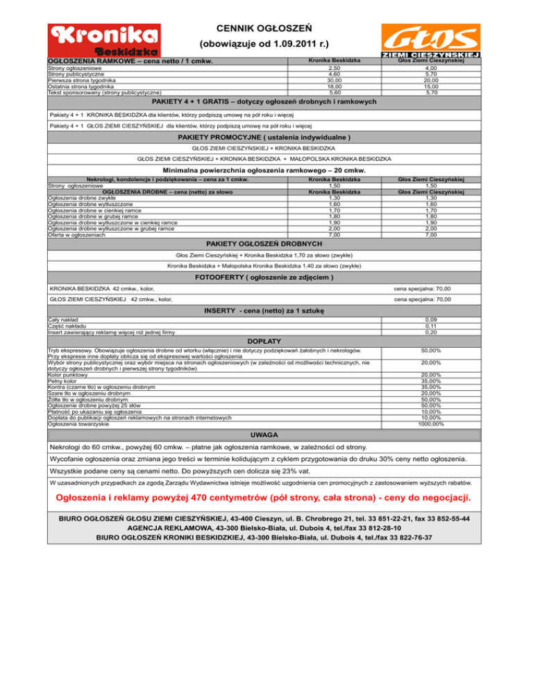 CENNIK OGŁOSZEŃ (obowiązuje od 1.09.2011 r.) Kronika Beskidzka 2,50 4,60 30,00 18,00 5,60 OGŁOSZENIA RAMKOWE – cena netto / 1 cmkw. Strony ogłoszeniowe Strony publicystyczne Pierwsza strona tygodnika Ostatnia strona tygodnika Tekst sponsorowany (strony publicystyczne) Głos Ziemi Cieszyńskiej 4,00 5,70 20,00 15,00 5,70 PAKIETY 4 + 1 GRATIS – dotyczy ogłoszeń drobnych i ramkowych Pakiety 4 + 1 KRONIKA BESKIDZKA dla klientów, którzy podpiszą umowę na pół roku i więcej Pakiety 4 + 1 GŁOS ZIEMI CIESZYŃSKIEJ dla klientów, którzy podpiszą umowę na pół roku i więcej PAKIETY PROMOCYJNE ( ustalenia indywidualne ) GŁOS ZIEMI CIESZYŃSKIEJ + KRONIKA BESKIDZKA GŁOS ZIEMI CIESZYŃSKIEJ + KRONIKA BESKIDZKA + MAŁOPOLSKA KRONIKA BESKIDZKA Minimalna powierzchnia ogłoszenia ramkowego – 20 cmkw. Nekrologi, kondolencje i podziękowania – cena za 1 cmkw. Strony ogłoszeniowe OGŁOSZENIA DROBNE – cena (netto) za słowo Ogłoszenia drobne zwykłe Ogłoszenia drobne wytłuszczone Ogłoszenia drobne w cienkiej ramce Ogłoszenia drobne w grubej ramce Ogłoszenia drobne wytłuszczone w cienkiej ramce Ogłoszenia drobne wytłuszczone w grubej ramce Oferta w ogłoszeniach Kronika Beskidzka 1,50 Kronika Beskidzka 1,30 1,60 1,70 1,80 1,90 2,00 7,00 Głos Ziemi Cieszyńskiej 1,50 Głos Ziemi Cieszyńskiej 1,30 1,60 1,70 1,80 1,90 2,00 7,00 PAKIETY OGŁOSZEŃ DROBNYCH Głos Ziemi Cieszyńskiej + Kronika Beskidzka 1,70 za słowo (zwykłe) Kronika Beskidzka + Małopolska Kronika Beskidzka 1,40 za słowo (zwykłe) FOTOOFERTY ( ogłoszenie ze zdjęciem ) KRONIKA BESKIDZKA 42 cmkw., kolor, cena specjalna: 70,00 GŁOS ZIEMI CIESZYŃSKIEJ 42 cmkw., kolor, cena specjalna: 70,00 INSERTY - cena (netto) za 1 sztukę Cały nakład Część nakładu Insert zawierający reklamę więcej niż jednej firmy 0,09 0,11 0,20 DOPŁATY Tryb ekspresowy. Obowiązuje ogłoszenia drobne od wtorku (włącznie) i nie dotyczy podziękowań żałobnych i nekrologów. Przy ekspresie inne dopłaty oblicza się od ekspresowej wartości ogłoszenia Wybór strony publicystycznej oraz wybór miejsca na stronach ogłoszeniowych (w zależności od możliwości technicznych, nie dotyczy ogłoszeń drobnych i pierwszej strony tygodników) Kolor punktowy Pełny kolor Kontra (czarne tło) w ogłoszeniu drobnym Szare tło w ogłoszeniu drobnym Żółte tło w ogłoszeniu drobnym Ogłoszenie drobne powyżej 25 słów Płatność po ukazaniu się ogłoszenia Dopłata do publikacji ogłoszeń reklamowych na stronach internetowych Ogłoszenia towarzyskie 50,00% 20,00% 20,00% 35,00% 35,00% 20,00% 50,00% 50,00% 10,00% 10,00% 1000,00% UWAGA Nekrologi do 60 cmkw., powyżej 60 cmkw. – płatne jak ogłoszenia ramkowe, w zależności od strony. Wycofanie ogłoszenia oraz zmiana jego treści w terminie kolidującym z cyklem przygotowania do druku 30% ceny netto ogłoszenia. Wszystkie podane ceny są cenami netto. Do powyższych cen dolicza się 23% vat. W uzasadnionych przypadkach za zgodą Zarządu Wydawnictwa istnieje możliwość uzgodnienia cen promocyjnych z zastosowaniem wyższych rabatów. Ogłoszenia i reklamy powyżej 470 centymetrów (pół strony, cała strona) - ceny do negocjacji. BIURO OGŁOSZEŃ GŁOSU ZIEMI CIESZYŃSKIEJ, 43-400 Cieszyn, ul. B. Chrobrego 21, tel. 33 851-22-21, fax 33 852-55-44 AGENCJA REKLAMOWA, 43-300 Bielsko-Biała, ul. Dubois 4, tel./fax 33 812-28-10 BIURO OGŁOSZEŃ KRONIKI BESKIDZKIEJ, 43-300 Bielsko-Biała, ul. Dubois 4, tel./fax 33 822-76-37