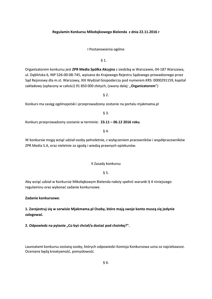 Regulamin Konkursu Mikołajkowego Bielenda z dnia 22.11.2016 r I Postanowienia ogólne § 1. Organizatorem konkursu jest ZPR Media Spółka Akcyjna z siedzibą w Warszawie, 04-187 Warszawa, ul. Dęblińska 6, NIP 526-00-08-745, wpisana do Krajowego Rejestru Sądowego prowadzonego przez Sąd Rejonowy dla m.st. Warszawy, XIII Wydział Gospodarczy pod numerem KRS: 0000291159, kapitał zakładowy (opłacony w całości) 91 850 000 złotych, (zwany dalej: „Organizatorem”) § 2. Konkurs ma zasięg ogólnopolski i przeprowadzony zostanie na portalu mjakmama.pl § 3. Konkurs przeprowadzony zostanie w terminie: 23.11 – 06.12 2016 roku. § 4. W konkursie mogą wziąć udział osoby pełnoletnie, z wyłączeniem pracowników i współpracowników ZPR Media S.A, oraz nieletnie za zgodą i wiedzą prawnych opiekunów. II Zasady konkursu § 5. Aby wziąć udział w Konkursie Mikołajkowym Bielenda należy spełnić warunki § 4 niniejszego regulaminu oraz wykonać zadanie konkursowe. Zadanie konkursowe: 1. Zarejestruj się w serwisie Mjakmama.pl Osoby, które mają swoje konto muszą się jedynie zalogować. 2. Odpowiedz na pytanie „Co byś chciał/a dostać pod choinkę?”. Laureatami konkursu zostaną osoby, których odpowiedzi Komisja Konkursowa uzna za najciekawsze. Oceniane będą kreatywność, pomysłowość. § 6. Każdy uczestnik poprzez zgłoszenie się do konkursu wyraża zgodę na warunki niniejszego Regulaminu, w tym publiczne ujawnienie, zamieszczenie na stronie serwisu Mjakmama.pl nicku podanego przy rejestracji w serwisie. § 7. Nagrodami w Konkursie Mikołajkowym Bielenda są: 6 zestawów kosmetyków Sexy Mama od firmy Bielenda o wartości 73 zł. Skład zestawu: kuracja do biustu, kuracja przeciw rozstępom, krem na opuchnięte nogi, oliwka w żelu, balsam ujędrniający i balsam nawilżający. W konkursie nagrodzimy 6 uczestników, którzy według Komisji Konkursowej udzielą najciekawszej odpowiedzi oraz spełnią jednocześnie przesłanki punktu 5 niniejszego regulaminu, co potwierdzi Komisja Konkursowa. Właścicielem nagród jest Sponsor, firma Bielenda. W imieniu Sponsora organizator ZPR Media Spółka Akcyjna przekaże nagrody laureatom konkursu na podany adres korespondencyjny. § 8. W skład Komisji Konkursowej wchodzą: Redaktor prowadząca serwisu Mjakmama.pl – Justyna Smolińska Redaktor serwisu Mjakmama.pl – Anna Szubińska Dział Marketingu – Klaudia Sobotka § 9. Komisja Konkursowa potwierdza zgodność przeprowadzenia konkursu z niniejszym regulaminem. § 10. Nad prawidłowością przebiegu konkursu i pracy Komisji Konkursowej czuwają władze statutowe Organizatora. § 11. Nicki laureatów konkursu zostaną opublikowane do 16.12.2016 roku w serwisie mjakmama.pl pod artykułem konkursowym. § 12. O wygranej nagród organizator konkursu poinformuje zwycięzców drogą mailową w terminie do 16.12.2016 r. Nagrody zostaną wysłane laureatowi przesyłka pocztową. W tym przypadku laureat konkursu zostanie poproszony o podanie adresu wysyłki (imię, nazwisko, ulica, miejsce zamieszkania, kod pocztowy, miasto, telefon). § 13. W przypadku niepodania przez laureata adresu dla doręczeń w terminie 14 dni od e-mailowego powiadomienia o przyznaniu nagrody, nagroda przechodzi na własność organizatora. § 14. Organizator może powiększyć pulę nagród w trakcie trwania konkursu. III Postanowienia końcowe § 15. Regulamin jest dostępny w lokalu Organizatora przy ul. Dęblińskiej 6, 04-187 Warszawa w dniu od poniedziałku do piątku w godzinach od 9:00 do 16:00 oraz na stronie mjakmama.pl w czasie trwania konkursu i w terminie 14 dni roboczych od jego zakończenia. § 16. Ewentualne reklamacje związane z konkursem mogą być kierowane do Organizatora w formie pisemnej, na adres Organizatora w terminie 14 dni roboczych od daty jego zakończenia. W przypadku przesłania reklamacji za pośrednictwem poczty decyduje data stempla pocztowego. § 17. Reklamacja powinna zawierać imię, nazwisko, dokładny adres i numer telefonu, jak również dokładny opis i powód reklamacji. § 18. Złożone przez uczestników reklamacje będą rozpatrywane przez Organizatora niezwłocznie, jednakże nie później niż w terminie 14 dni od daty otrzymania reklamacji przez Organizatora. § 19. Zainteresowani uczestnicy zostaną powiadomieni o wyniku rozpatrzenia reklamacji na piśmie, najpóźniej w ciągu 14 dni od daty rozpatrzenia reklamacji przez Organizatora. § 20. Niniejszy konkurs nie jest grą hazardową w rozumieniu ustawy o grach hazardowych z dnia 19.11.2009r. § 21. Niniejszy regulamin stanowi podstawę prowadzenia konkursu i określa jego warunki oraz prawa i obowiązki jego uczestników. § 22. Adres e-mail Organizatora, pod którym można uzyskać informacje na temat organizacji konkursu: [email protected] W imieniu Organizatora Klaudia Sobotka Warszawa, 22.11.2016 r.