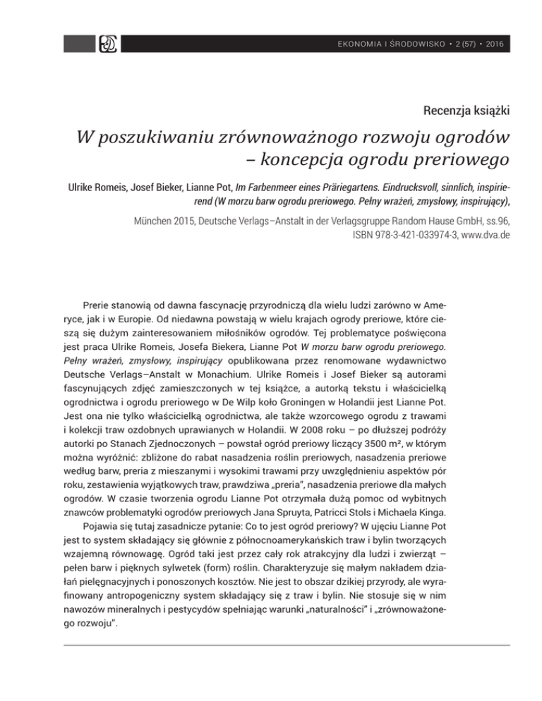 EKONOMIA I ŚRODOWISKO • 2 (57) • 2016 Recenzja książki W poszukiwaniu zrównoważnogo rozwoju ogrodów – koncepcja ogrodu preriowego Ulrike Romeis, Josef Bieker, Lianne Pot, Im Farbenmeer eines Präriegartens. Eindrucksvoll, sinnlich, inspirierend (W morzu barw ogrodu preriowego. Pełny wrażeń, zmysłowy, inspirujący), München 2015, Deutsche Verlags–Anstalt in der Verlagsgruppe Random Hause GmbH, ss.96, ISBN 978-3-421-033974-3, www.dva.de Prerie stanowią od dawna fascynację przyrodniczą dla wielu ludzi zarówno w Ameryce, jak i w Europie. Od niedawna powstają w wielu krajach ogrody preriowe, które cieszą się dużym zainteresowaniem miłośników ogrodów. Tej problematyce poświęcona jest praca Ulrike Romeis, Josefa Biekera, Lianne Pot W morzu barw ogrodu preriowego. Pełny wrażeń, zmysłowy, inspirujący opublikowana przez renomowane wydawnictwo Deutsche Verlags–Anstalt w Monachium. Ulrike Romeis i Josef Bieker są autorami fascynujących zdjęć zamieszczonych w tej książce, a autorką tekstu i właścicielką ogrodnictwa i ogrodu preriowego w De Wilp koło Groningen w Holandii jest Lianne Pot. Jest ona nie tylko właścicielką ogrodnictwa, ale także wzorcowego ogrodu z trawami i kolekcji traw ozdobnych uprawianych w Holandii. W 2008 roku – po dłuższej podróży autorki po Stanach Zjednoczonych – powstał ogród preriowy liczący 3500 m², w którym można wyróżnić: zbliżone do rabat nasadzenia roślin preriowych, nasadzenia preriowe według barw, preria z mieszanymi i wysokimi trawami przy uwzględnieniu aspektów pór roku, zestawienia wyjątkowych traw, prawdziwa „preria”, nasadzenia preriowe dla małych ogrodów. W czasie tworzenia ogrodu Lianne Pot otrzymała dużą pomoc od wybitnych znawców problematyki ogrodów preriowych Jana Spruyta, Patricci Stols i Michaela Kinga. Pojawia się tutaj zasadnicze pytanie: Co to jest ogród preriowy? W ujęciu Lianne Pot jest to system składający się głównie z północnoamerykańskich traw i bylin tworzących wzajemną równowagę. Ogród taki jest przez cały rok atrakcyjny dla ludzi i zwierząt – pełen barw i pięknych sylwetek (form) roślin. Charakteryzuje się małym nakładem działań pielęgnacyjnych i ponoszonych kosztów. Nie jest to obszar dzikiej przyrody, ale wyrafinowany antropogeniczny system składający się z traw i bylin. Nie stosuje się w nim nawozów mineralnych i pestycydów spełniając warunki „naturalności” i „zrównoważonego rozwoju”. 312 Recenzje, omówienia, przeglądy EKONOMIA I ŚRODOWISKO 2 (57) • 2016 Struktura książki przedstawia się następująco: Wprowadzenie. Od prerii do ogrodu preriowego w De Wilp; Bujny maj. Wiosna przebija się; Bogaty w kwiaty czerwiec. W drodze do zrównoważonego ogrodu preriowego; Zmysłowy lipiec. Lśniące kwiaty; Błyszczący sierpień. Projekt i tematy mojego ogrodu preriowego; Lśniący wrzesień. Prawdziwe trawy i turzyce; Gwałtowny październik. Duże trawy i mieszane nasadzenia preriowe; Melancholijny listopad. Zmysłowy nastrój. Lianne Pot początkowo pracowała w miastach. W 1994 osiadła na wsi De Wilp niedaleko miasta Groningen na północy Holandii, gdzie dominowały gleby piaszczyste z domieszką gliny. W założonym ogrodnictwie zajęła się wspólnotami traw i bylin. W 2008 roku odwiedziła ona Stany Zjednoczone, gdzie zapoznała się z pierwotnymi obszarami preriowymi. Na podstawie własnych obserwacji i rozmów ze specjalistami założyła ona ogród preriowy, gdzie przesłankami było piękno nasadzeń roślin preriowych, a także ich zrównoważony rozwój. Pojęcie prerii obejmuje: prerie z niskimi trawami, prerie z mieszanymi trawami, prerie z wysokimi trawami. Te dwie ostatnie występują w stanie naturalnym – między innymi w amerykańskim stanie Kansas. Ważnymi czynnikami utrzymania prerii są nie tylko przyroda, właściwości gleb i położenie geograficzne, ale ogień (w tym sztuczny), a także przemieszczające się stada bizonów. Czynniki te usiłuje się stosować na terenie obszarów chroniących w USA, gdzie co trzy lata wykorzystuje się ogień. Większość prerii znajduje się na żyznych glebach, które dobrze utrzymują wilgoć. Idealne dla ogrodu preriowego są tutaj gliniaste gleby piaszczyste i gleby piaszczyste z domieszką gliny. Początek wiosny w założonym ogrodzie preriowym zaczyna się w lutym. Wtedy zaczynają kwitnąć krokusy, a później pojawiają się tulipany botaniczne i ozdobne czosnki. Ważne znaczenie mają kamasje (Camassia), zwane popularnie liliami preriowymi, kwitnące od początku maja. W maju dominują w ogrodzie różnorodne odmiany łubinów, które tworzą barwne „plamy”. Kolejna część pracy jest zatytułowana Bogaty w kwiaty czerwiec. W drodze do zrównoważonego ogrodu preriowego. Barwy kwiatów stają się bardziej pastelowe. Obok łubinów dominują bodziszki i wilczomlecze. Rośliny preriowe mogą przetrwać dwa miesiące suszy. Korzenie roślin preriowych przenikają głęboko do gleby uniemożliwiając też rozwój chwastów. Każdego roku – w lutym – powinno odbyć się koszenie i wycinanie suchych roślin. W ogrodach preriowych stosuje się żwir lawowy jako ściółkę. Zmysłowy lipiec. Lśniące kwiaty przedstawiają apogeum rozwoju ogrodu preriowego – wszędzie występują kwiaty, liście, zieleń. Kwitną wtedy już floksy, przegorzany (Echinops), liatry, pysznogłówki, słoneczniki i dzielżany. Stanowią one dobry pożytek dla owadów (pszczół i innych). Te ostatnie są bardzo ważne dla wielu roślin uprawnych. W części książki Błyszczący sierpień. Projekt i tematy mojego ogrodu preriowego omawia się początek sezonu kwitnienia wielu traw (między innymi Sporobolus heterolepis, Molinia arundinacea, M. caerulea). Niektórzy autorzy określają ten miesiąć nawet jako najpiękniejszy. Natomiast kolejna część pracy Błyszczący wrzesień. Prawdziwe trawy i turzyce przedstawia najważniejsze rośliny 