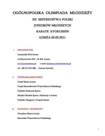 OGÓLNOPOLSKA OLIMPIADA MŁODZIEŻY XII MISTRZOSTWA POLSKI JUNIORÓW MŁODSZYCH KARATE KYOKUSHIN ŁOMŻA 03.05.2011 I. ORGANIZATOR Łomżyński Klub Karate ul.Mazowiecka 4/54 ,18-404 Łomża www.karatelomza.pl e-mail: [email protected] tel: +48 512-319-088 - Dariusz Syrnicki II. WSPÓŁORGANIZATORZY Urząd Miasta Łomża Urząd Marszałkowski Województwa Podlaskiego Podlaska Federacja Sportu Miejski Ośrodek Sportu i Rekreacji w Łomży Podlaski Okręgowy Związek Karate III. PATRONAT HONOROWY Prezydent Miasta Łomży Marszałek Województwa Podlaskiego 1 IV. TERMIN I MIEJSCE ZAWODÓW 3 maja 2011 Hala sportowo - widowiskowa im. Olimpijczyków Polskich ul. Księżnej Anny 18 , 18-400 Łomża V. KATEGORIE Junior młodszy – rocznik 1994 - 1995 1.Kumite semi kontakt chłopcy kategorie wagowe : -60 kg; -65 kg; -70 kg; -75 kg; +75 kg 2. Kumite semi kontakt dziewczęta kategorie wagowe : -55 kg; +55 kg 3. Kata chłopcy 4. Kata dziewczęta 5. Walki reżyserowane ( dopuszcza się pary mieszane ) * Konkurencja kata zostanie rozegrana w trzech turach. Tura pierwsza obowiązkowa, zawodnik wykonuje kata podane przez sędziego. Tura druga i trzecia, zawodnik wykonuje kata dowolne z obowiązujących w poniższej tabeli. I TURA Pinian Sono Ni Pinian Sono San Pinian Sono Yon II TURA Pinian Sono Go Tsuki No Kata Gekisai Dai II TURA Saiha Yantsu Gekisai Sho * Konkurencja kumite semi kontakt rozegrana według przepisów Polskiego Związku Karate zatwierdzonych w dniu 11.03.2011r. Czas trwania walki 2 minuty , czas jedynej dogrywki 2 minuty. Do pierwszej walki nie wolno zakładać jakichkolwiek bandaży ani plastrów. Owijanie kontuzjowanych kończyn oraz stawów jest dozwolone jedynie po 2 badaniu wykonanym przez oficjalnego lekarza turnieju i po uzyskaniu wcześniejszej zgody sędziego głównego. Kontuzjowany zawodnik nie może być dopuszczony do udziału w turnieju. Techniki dozwolone : - techniki ręczne i nożne na tułów ( strefa „chudan” ) w kontakcie na tułów: ręczne : seiken tsuki, mawashi uchi, uraken shita uchi, nożne : hiza geri, mae geri, yoko geri, mawashi geri, ushiro geri -techniki nożne na nogi (strefa „gedan”) w kontakcie na nogi: mawashi geri, ashi barai, hiza geri, kakato geri( kopnięcie piętą z zewnątrz), ushiro mawashi geri ( kopnięcie piętą w udo z obrotu) -techniki nożne na głowę ( strefa „jodan”), techniki w lekkim kontakcie – dotknięcie kasku: mawashi geri, uchi geri, kake geri. Ochraniacze na tułów (hogo), pięści oraz głowę (kask) zapewnia organizator. Podczas oficjalnego ważenia przed turniejem każdy zawodnik musi posiadać wagę poniżej limitu swojej kategorii, w przeciwnym wypadku nie zostanie on dopuszczony do rywalizacji w tej kategorii wagowej. Konkurencja kumite rozegrana będzie bez walki o 3 miejsce. Zawody są ubezpieczone przez organizatora. * Konkurencja walki reżyserowane - układ max. 2 minuty (własny podkład muzyczny ) * Punktacja drużynowa : I miejsce – 5pkt, II miejsce – 3 pkt, III miejsce – 1 pkt VI. WARUNKI UCZESTNICTWA 1. Klub zgłaszający ekipę do zawodów musi posiadać aktualną licencję PZK. 2. Do startu dopuszczeni będą zawodnicy posiadający : a/ licencję zawodnika PZK 3 b/aktualną kartę zdrowia sportowca c/minimum 6 kyu d/ dokument ze zdjęciem potwierdzający tożsamość i datę urodzenia e/ białe osobiste ochraniacze : goleń – stopa - chłopcy : na krocze własne standardowe suspensorium ( plastikowa wkładka ) włożone pod spodnie - dziewczeta : na piersi własne standardowe miseczki z pianki ( nie mogą być plastikowe) wyraźnie rozłączone, włożone pod koszulkę. f/ czyste, białe karategi g/ zgoda rodziców na start w zawodach 3. W zawodach mogą wziąć udział ekipy zkładające się z 2 zawodników w danej kategorii. VII. ZGŁOSZENIA ZAWODNIKÓW PRZYJMOWANE BĘDĄ DO 27 KWIETNIA 2011 NA KARCIE ZGŁOSZEŃ NA ADRES E-MAIL : [email protected] W dniu 29.04.2011 zostaną zamieszczone listy zgłoszonych zawodników na stronie Łomżyńskiego Klubu Karate (www.karatelomza.pl) celem weryfikacji. VIII. OPŁATA ZA UDZIAŁ W ZAWODACH WYNOSI 150,00 ZŁ Słownie: sto pięćdziesiąt złotych 00/100 a/ kalkulacja kosztów : 50,00 zł – startowe 50,00 zł – nocleg 02/03.05.2011 r. 50,00 zł – wyżywienie : kolacja 02.05.2011, śniadanie i obiad 03.05.2011 b/kierownicy ekip ( sędziowie ) 120 ,00 zł ( w tym sayonara ) c/ opłate należy dokonać na konto klubu do 27 kwietnia 2011r. lub gotówką w dniu przyjazdu . d/ w przypadku wpłaty na konto należy w dniu przyjazdu okazać dowód wpłaty nr konta bankowego klubu – BS w Łomży : 29 8757 0001 0001 1484 2000 0010 4 ZAKWATEROWANIE IX. Zawodnicy : Bursa Szkolna nr 2 ul. Stacha Konwy 13 , 18-400 Łomża Kierownicy ekip – sędziowie : Hotel „ Labirynt ” ul. Sikorskiego 345 , 18-400 Łomża PROGRAM ZAWODÓW X. Poniedziałek 02.05.2011r. • 15:00 – 19:00 - przybycie ekip i kwaterowanie w bursie i hotelu • 16:00 – 20:00 – weryfikacja zawodników i badania lekarskie na hali sportowej ul. Księżnej Anny 18 w Łomży • 18:00 – 19:00 – kolacja dla zawodników ( bursa ) • 20:00 – 21:00 – narada kierowników ośrodków i sędziów • 21:00 - sayonara Wtorek 03.05.2011r. • 07:30 – 08:30 - śniadanie • 09:00 – 09:30 – narada sędziów na hali • 10:00 - rozpoczęcie zawodów: eliminacje i finały kata, walki reżyserowane, eliminacje kumite na 3 matach 5 XI. • 13:00 – 15:00 – obiad na hali • 16:00 - oficjalne otwarcie zawodów • 16:30 - eliminacje kumite c.d. i finały • 18:00 – 19:00 – dekoracja medalistów POSTANOWIENIA KOŃCOWE 1. Sędzią Głównym zawodów jest shihan Andrzej Drewniak 7 Dan. 2. Przewodniczącym Komisji Weryfikacyjnej i Losującej jest sensei Edward Urbańczyk 4 Dan 3. W sprawach nie objętych regulaminem decyduje Sędzia Główny i Organizator . 4. Protesty należy składać u Sędziego Głównego po wpłaceniu wadium – 100 zł. 5. W przypadku odrzucenia protestu w