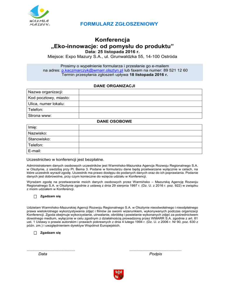 FORMULARZ ZGŁOSZENIOWY Konferencja „Eko-innowacje: od pomysłu do produktu” Data: 25 listopada 2016 r. Miejsce: Expo Mazury S.A., ul. Grunwaldzka 55, 14-100 Ostróda Prosimy o wypełnienie formularza i przesłanie go e-mailem na adres: [email protected] lub faxem na numer: 89 521 12 60 Termin przesyłania zgłoszeń upływa 18 listopada 2016 r. DANE ORGANIZACJI Nazwa organizacji: Kod pocztowy, miasto: Ulica, numer lokalu: Telefon: Strona www: DANE OSOBOWE Imię: Nazwisko: Stanowisko: Telefon: E-mail: Uczestnictwo w konferencji jest bezpłatne. Administratorem danych osobowych uczestników jest Warmińsko-Mazurska Agencja Rozwoju Regionalnego S.A. w Olsztynie, z siedzibą przy Pl. Bema 3. Podane w formularzu dane będą przetwarzane wyłącznie w celach, na które uczestnik wyraził zgodę. Uczestnik ma prawo dostępu do podanych danych oraz do ich poprawiania. Podanie danych jest dobrowolne, przy czym konieczne do wzięcia udziału w Konferencji. Wyrażam zgodę na przetwarzanie moich danych osobowych przez Warmińsko – Mazurską Agencję Rozwoju Regionalnego S.A. w Olsztynie zgodnie z ustawą z dnia 29 sierpnia 1997 r. (Dz. U. z 2016 r. poz. 922) w związku z moim udziałem w Konferencji. ⎕ Zgadzam się Udzielam Warmińsko-Mazurskiej Agencji Rozwoju Regionalnego S.A. w Olsztynie nieodwołalnego i nieodpłatnego prawa wielokrotnego wykorzystywania zdjęć i filmów ze swoim wizerunkiem, wykonywanych podczas organizacji Konferencji. Zgoda obejmuje wykorzystanie, utrwalanie, obróbkę i powielanie wykonanych zdjęć za pośrednictwem dowolnego medium, wyłącznie w celu zgodnym z działalnością prowadzoną przez WMARR S.A. zgodnie z art. 81 ust. 1 Ustawy o prawie autorskim i prawach pokrewnych z dnia 4 lutego 1994 r. (Dz. U. z 2006 r. Nr 90, poz. 630 z późn. zm.) i uwzględnieniem dyrektyw Wspólnot Europejskich. ⎕ Zgadzam się .......................................... Data ............................................. Podpis