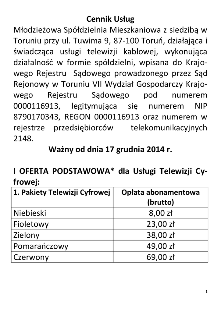 Cennik Usług Młodzieżowa Spółdzielnia Mieszkaniowa z siedzibą w Toruniu przy ul. Tuwima 9, 87-100 Toruń, działająca i świadcząca usługi telewizji kablowej, wykonująca działalność w formie spółdzielni, wpisana do Krajowego Rejestru Sądowego prowadzonego przez Sąd Rejonowy w Toruniu VII Wydział Gospodarczy Krajowego Rejestru Sądowego pod numerem 0000116913, legitymująca się numerem NIP 8790170343, REGON 0000116913 oraz numerem w rejestrze przedsiębiorców telekomunikacyjnych 2148. Ważny od dnia 17 grudnia 2014 r. I OFERTA PODSTAWOWA* dla Usługi Telewizji Cyfrowej: 1. Pakiety Telewizji Cyfrowej Niebieski Fioletowy Zielony Pomarańczowy Czerwony Opłata abonamentowa (brutto) 8,00 zł 23,00 zł 38,00 zł 49,00 zł 69,00 zł 1 2. Pakiety Premium Canal+ Platinum Canal+ Gold Canal+ Silver HBO HD Cinemax HD Filmbox TV Republika 3. Usługa Multiroom Multiroom 1 Multiroom 2 Opłata abonamentowa (brutto) 69,00 zł 59,00 zł 49,00 zł 40,00 zł 40,00 zł 15,00 zł 5,00 zł Opłata abonamentowa (brutto) 15,00 zł 20,00 zł 4. Dostęp do Telewizji Cyfrowej Opłata abonamentowa (brutto) Dekoder SD (bez karty) Dekoder SD Moduł CAM Dekoder HD Dekoder HD PVR 1,23 zł 10,00 zł 2 5. Aktywacja Telewizji Cyfrowej Pakiety Premium Usługa Multiroom Czas trwania umowy Telewizja 24 miesiące Cyfrowa 12 miesięcy Czas nieoznaczony Opłata jednorazowa (brutto) 49,00 zł 99,00 zł Moduł Dekoder Dekoder CAM HD HD PVR 1,23 zł 1,23 zł 199,00 zł 49,00 zł 99,00 zł 299,00 zł 99,00 zł 199,00 zł 399,00 zł II OFERTA PODSTAWOWA* dla Usługi Internetu Stacjonarnego: 1. Internet Opłata abonamentowa (brutto) Stacjonarny Umowa na Umowa na Umowa na 24 miesiące 12 miesięcy czas nieoznaczony 8 Mbit/s 49,00 zł 54,00 zł 74,00 zł 16 Mbit/s 54,00 zł 64,00 zł 84,00 zł 32 Mbit/s 64,00 zł 74,00 zł 94,00 zł 64 Mbit/s 84,00 zł 94,00 zł 114,00 zł 128 Mbit/s 104,00 zł 114,00 zł 124,00 zł 3 2. Pakiety dodatkowe „Oko na dom: Aktywacja pakietu „Oko na dom” 3. Aktywacja Internetu Opłata abonamentowa (brutto) Umowa na 24 miesiące 10,00 zł 1,00 zł Umowa na czas nieoznaczony 20,00 zł 99,00 zł Opłata jednorazowa (brutto) Umowa na 24 miesiące 1,23 zł Modem kablowy Modem z route- 1,23 zł rem WiFi Dostęp do WiFi 10,00 zł (opłata abonamentowa) Umowa na 12 miesięcy 49,00 zł Umowa na czas nieoznaczony 99,00 zł 49,00 zł 99,00 zł 10,00 zł 10,00 zł 4 III OFERTA PODSTAWOWA* dla Usług Telefonu Domowego 1. Telefon Opłata abonamentowa (brutto) domowy Umowa na Umowa na Umowa na 24 miesiące 12 miesięcy czas nieoznaczony Telefon 10,00 zł 10,00 zł 10,00 zł domowy Telefon 25,00 zł 30,00 zł 35,00 zł domowy 100 minut Telefon 35,00 zł 40,00 zł 45,00 zł domowy 300 minut Telefon 49,00 zł 55,00 zł 60,00 zł domowy 600 minut 5 2. Aktywacja Telefonu Domowego Z Internetem Sam telefon domowy Cena jednorazowa (brutto) Umowa Umowa na 24 na 12 miesiące miesięcy 1,23 zł 49,00 zł 49,00 zł 99,00 zł Umowa na czas nieoznaczony 99,00 zł 149,00 zł IV OFERTA USŁUG DODATKOWYCH 1. Opłaty związane z pracami serwisu dotyczące zleceń płatnych Opłata jednorazowa (brutto) Programowanie odbiornika ana- 45,00 zł / 70,00 zł logowego (CRT) / Programowanie z układaniem listy kanałów Programowanie odbiornika cy- 45,00 zł / 70,00 zł frowego / Programowanie z układaniem listy kanałów Konfiguracja routera TVK Toruń 60,00 zł Konfiguracja usługi Multiroom 55,00 zł Instalacja dekodera w domu 55,00 zł abonenta Sprawdzenie instalacji abonenc45,00 zł 6 kiej Montaż gniazda antenowego w 120,00 zł obrębie lokalu Wykonanie dodatkowego punk160,00 zł tu odbioru / gniazda antenowego / z zestawu rozdzielczego / klatki schodowej Naprawa instalacji RTV weNa podstawie prownątrz lokalu tokołu wg rzeczywistych kosztów wykonania 2. Inne Aktywacja sygnału po odłączeniu Zmiana pakietu analogowego Zawieszenie sygnału telewizji analogowej Zmiana miejsca świadczenia usługi dostępu do Internetu Zawieszenie dostępu do Internetu Przydzielenie indywidualnego adresu IP Odbiór sprzętu od abonenta na życzenie Opłata jednorazowa (brutto) 35,00 zł 35,00 zł 35,00 zł 86,10 zł 12,30 zł 6,10 zł 30,00 zł 7 Koszty monitoringu opłat Szczegółowy wykaz połączeń Zmiana numeru telefonu 12,30 zł 5,00 zł 39,00 zł V Opłaty dodatkowe za brakujący / uszkodzony / niezdany sprzęt: Brakujący / uszkodzony / Opłata jednorazowa niezdany element przy (brutto) wg aktualnej cezdawaniu sprzętu: ny sprzętu Karta dostępu 100,00 zł Kabel USB 12,00 zł Kabel Ethernet 10,00 zł Karty dodatkowe do 100,00 zł / szt. Multiroom Zasilacz do modemu 40,00 zł Pilot od dekodera 100,00 zł Kabel HDMI 30,00 zł Kabel Euro 20,00 zł Zasilacz od dekodera 40,00 zł Opakowanie od dekodera 20,00 zł Opakowanie od modemu, 10,00 zł modułu CAM, Multiroom Instrukcja od modemu, 10,00 zł modułu CAM, Multiroom Instrukcja od dekodera 20,00 zł 8 Płyta z oprogramowa10,00 zł niem urządzenia * Podane ceny dotyczą opłat bez skorzystania z opcji e-faktury. Kwota z e-fakturą jest zawsze o 5 zł niższa od cen uwzględnionych w Cenniku. Zarząd Młodzieżowej Spółdzielni Mieszkaniowej może wprowadzić zmiany w stawkach określonych w Cenniku Telewizji Kablowej Toruń. 9