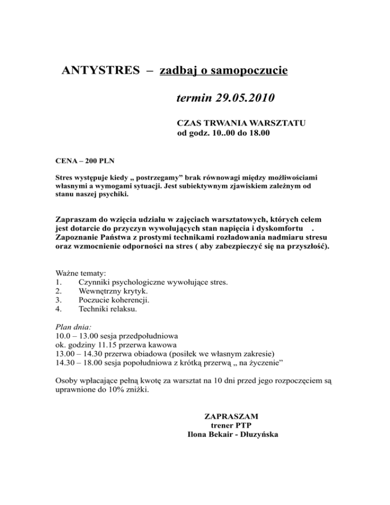 ANTYSTRES – zadbaj o samopoczucie termin 29.05.2010 CZAS TRWANIA WARSZTATU od godz. 10..00 do 18.00 CENA – 200 PLN Stres występuje kiedy „ postrzegamy” brak równowagi między możliwościami własnymi a wymogami sytuacji. Jest subiektywnym zjawiskiem zależnym od stanu naszej psychiki. Zapraszam do wzięcia udziału w zajęciach warsztatowych, których celem jest dotarcie do przyczyn wywołujących stan napięcia i dyskomfortu . Zapoznanie Państwa z prostymi technikami rozładowania nadmiaru stresu oraz wzmocnienie odporności na stres ( aby zabezpieczyć się na przyszłość). Ważne tematy: 1. Czynniki psychologiczne wywołujące stres. 2. Wewnętrzny krytyk. 3. Poczucie koherencji. 4. Techniki relaksu. Plan dnia: 10.0 – 13.00 sesja przedpołudniowa ok. godziny 11.15 przerwa kawowa 13.00 – 14.30 przerwa obiadowa (posiłek we własnym zakresie) 14.30 – 18.00 sesja popołudniowa z krótką przerwą „ na życzenie” Osoby wpłacające pełną kwotę za warsztat na 10 dni przed jego rozpoczęciem są uprawnione do 10% zniżki. ZAPRASZAM trener PTP Ilona Bekair - Dłuzyńska