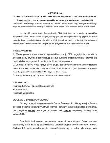 ARTYKUŁ 36 KONSTYTUCJI GENERALNYCH FRANCISZKAŃSKIEGO ZAKONU ŚWIECKICH (tekst oparty o opracowanie włoskie - z pewnymi zmianami i dodatkami) Omówienia powyższego Artykułu dokonał O. Robert Rabka OFM Cap, Delegat Konferencji. Asystentów Generalnych na Kapitułę odbywającą się w dniach 16-18 września 2016 r. w Warszawie. Artykuł 36 Konstytucji Generalnych FZŚ jest jednym z wielu przykładów bogactwa, jakie Zakon ofiaruje tym, którzy pragną zaangażować się głębiej w życie powołaniem chrześcijańskim dla służby Kościołowi, w całej rozciągłości istniejących możliwości, krocząc śladami Chrystusa za przykładem św. Franciszka z Asyżu. Tekst Artykułu 36: 1. Wielką pomocą w duchowym i apostolskim rozwoju FZŚ mogą być bracia, którzy poprzez śluby prywatne zobowiązują się żyć duchem Błogosławieństw i stawać się bardziej dyspozycyjnymi do kontemplacji i służby wspólnocie. 2. Ci bracia i siostry mogą łączyć się w grupy, zgodnie ze Statutami zatwierdzonymi przez Radę Narodową albo, gdy rozprzestrzenienie się tych grup przekracza granice narodu, przez Prezydium Rady Międzynarodowej FZŚ. 3. Statuty te muszą być zgodne z niniejszymi Konstytucjami. CEL (Art. 36,1): • rozwój duchowy i apostolski całego FZŚ; • kontemplacja; • posługa wspólnocie. OGÓLNIE O DARZE POWOŁANIA Dar tego specyficznego wezwania Ducha Świętego do bliższej relacji z Panem poprzez złożenie ślubów prywatnych dotyka i dotyczy, jak zresztą każde powołanie, poszczególnej osoby, która go otrzymuje oraz innych: wspólnoty lokalnej oraz całego FZŚ. Powołanie jest zawsze wezwaniem, wewnętrznym głosem Pana, któremu towarzyszy łaska Boża, by je zrealizować (charyzmaty) dla dobra własnego i innych. Dlatego też bycie powołanym do zaangażowania się w jeden lub więcej ślub 1 powoduje, że osoba powołana w pełni realizuje siebie według woli Bożej i, realizując siebie, rozciąga na innych owoce tego daru. To już samo z siebie jest darem łaski dającym radość i nie potrzebuje innych, dalszych potwierdzeń. Pierwszymi, którzy wynoszą korzyść z daru powołania osoby wezwanej do złożenia ślubów, są bracia i siostry ze wspólnoty, do której ona przynależy, a także cały Zakon. Choć już sama Profesja złożona przez świeckich franciszkanów zobowiązuje do przeżywania z głębokim zaangażowaniem życia ewangelicznego, to jednak Duch Pański może w pełnej wolności wezwać niektórych z nich do podjęcia kolejnych specyficznych wyzwań, zawsze w obrębie tego samego powołania franciszkańskiego i świeckiego. Sam św. Franciszek wzywa do tego, aby pragnąć posiadać i szukać w swym życiu przede wszystkim Ducha Pańskiego i Jego świętego działania (2 Reg 10,8: «(...) lecz niech zważają [na to], że nade wszystko powinni pragnąć mieć Ducha Pańskiego i Jego święte działanie»). Obecność i działanie Ducha Świętego są przeciwne wszelkiej skostniałości, pasywności, legalizmowi, gdyż zawsze prowadzą do wyjścia poza własny świat, do podjęcia ryzyka i otwarcia się na nowość życia według Ewangelii. Duch Święty działa w każdym człowieku inaczej, dlatego też wspólnota jest niesamowitym darem, bogactwem, ale również wyzwaniem do wzajemnej akceptacji różnorodności. Powołania pochodzące od Boga mogą być bardzo zróżnicowane, nawet w obrębie jednej i tej samej wspólnoty lokalnej. Może być to wezwanie przez Boga do zaangażowania w życie według ducha błogosławieństw z jeszcze większą intensywnością poprzez jakiś jeden - lub więcej - ślub prywatny dotyczący jednej (lub więcej) rady ewangelicznej. Chodzi w tym wszystkim o większą intensywność zaangażowania, gdyż w rzeczywistości wszyscy franciszkanie świeccy są już bezpośrednio związani tym zobowiązaniem. Reguła FZŚ 11: « Chrystus, ufając Ojcu, jakkolwiek łagodnie i z wyrozumiałością traktował rzeczy stworzone, wybrał dla siebie i Swojej Matki życie ubogie i pokorne (2 LW 5); tak samo Franciszkanie świeccy niech w zakresie dóbr doczesnych zachowują należyty umiar, zaspokajając swoje potrzeby materialne; świadomi, że zgodnie z Ewangelią są administratorami otrzymanych dóbr na korzyść synów Bożych. „Jako przechodnie i przybysze", zdążający do domu Ojca, niech też w duchu Błogosławieństw starają się oczyścić serca ze wszystkich skłonności oraz żądzy posiadania i panowania (Rz 8,17)». 2 Konst. Gen. FZŚ 15,1: «Franciszkanie świeccy angażują się, aby żyć duchem Błogosławieństw, a w szczególny sposób duchem ubóstwa. ubóstwo ewangeliczne ukazuje ufność w Ojcu, daje wolność wewnętrzną i skłania do popierania sprawiedliwego podziału dóbr». KONSTYTUCJE GENERALNE NIE WYJAŚNIAJĄ, JAKIE MAJĄ BYĆ TE ŚLUBY. Powszechnie dotychczas mylono śluby (także prywatne) z życiem zakonnym regularnym w ścisłym tego terminu znaczeniu. Myślano więc, że śluby muszą mieć za przedmiot - koniecznie i wyłącznie - trzy tradycyjne rady ewangeliczne, zazwyczaj połączone z specjalną konsekracją: ubóstwo, posłuszeństwo i czystość. Jednak w rzeczywistości nie są to jedyne rady ewangeliczne, a duch Błogosławieństw ewangelicznych rozciąga się także na inne równie ważne rzeczywistości. Są w nich zawarte także inne możliwe śluby, jak: radość, pokora (już praktykowana w różnorodnych instytutach), jakaś specyficzna działalność apostolska dla Królestwa Bożego, nie mówiąc już o tym, że Duch Święty, w swym niewyczerpanym bogactwie, może wiać którędy chce i jak chce. Duch Święty może wezwać do jakiegokolwiek zaangażowania dla dobra jednostki, wspólnoty czy całego Kościoła, a Jego pomysłowość i bogactwo różnorodnych wezwań ciągle może zaskakiwać. Może na przykład wezwać kogoś do życia poświęconego poprzez ślubowanie dla sprawy jednego z błogosławieństw, albo do czegoś zupełnie nowego, powołanego