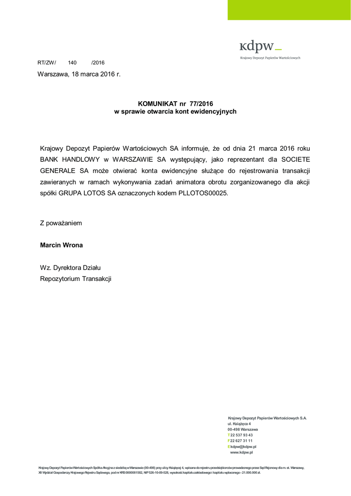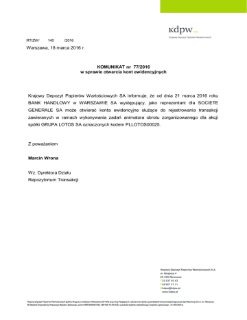 RT/ZW/ 140 /2016 Warszawa, 18 marca 2016 r. KOMUNIKAT nr 77/2016 w sprawie otwarcia kont ewidencyjnych Krajowy Depozyt Papierów Wartościowych SA informuje, że od dnia 21 marca 2016 roku BANK HANDLOWY w WARSZAWIE SA występujący, jako reprezentant dla SOCIETE GENERALE SA może otwierać konta ewidencyjne służące do rejestrowania transakcji zawieranych w ramach wykonywania zadań animatora obrotu zorganizowanego dla akcji spółki GRUPA LOTOS SA oznaczonych kodem PLLOTOS00025. Z poważaniem Marcin Wrona Wz. Dyrektora Działu Repozytorium Transakcji Krajowy Depozyt Papierów Wartościowych S.A. ul. Książęca 4 00-498 Warszawa T 22 537 93 43 F 22 627 31 11 E [email protected] www.kdpw.pl Krajowy Depozyt Papierów Wartościowych Spółka Akcyjna z siedzibą w Warszawie (00-498) przy ulicy Książęcej 4, wpisana do rejestru przedsiębiorców prowadzonego przez Sąd Rejonowy dla m. st. Warszawy, XII Wydział Gospodarczy Krajowego Rejestru Sądowego, pod nr KRS 0000081582, NIP526-10-09-528, wysokość kapitału zakładowego i kapitału wpłaconego - 21.000.000 zł.