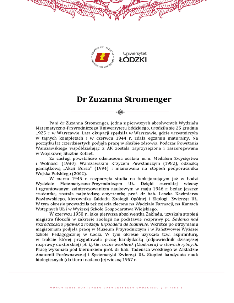 Dr Zuzanna Stromenger Pani dr Zuzanna Stromenger, jedna z pierwszych absolwentek Wydziału Matematyczno-Przyrodniczego Uniwersytetu Łódzkiego, urodziła się 25 grudnia 1925 r. w Warszawie. Lata okupacji spędziła w Warszawie, gdzie uczestniczyła w tajnych kompletach i w czerwcu 1944 r. zdała egzamin maturalny. Na początku lat czterdziestych podjęła pracę w służbie zdrowia. Podczas Powstania Warszawskiego współdziałając z AK została zaprzysiężona i zaszeregowana w Wojskowej Służbie Kobiet. Za zasługi powstańcze odznaczona została m.in. Medalem Zwycięstwa i Wolności (1980), Warszawskim Krzyżem Powstańczym (1982), odznaką pamiątkową „Akcji Burza” (1994) i mianowana na stopień podporucznika Wojska Polskiego (2002). W marcu 1945 r. rozpoczęła studia na funkcjonującym już w Łodzi Wydziale Matematyczno-Przyrodniczym UŁ. Dzięki szerokiej wiedzy i ugruntowanym zainteresowaniom naukowym w maju 1946 r. będąc jeszcze studentką, została najmłodszą astystentką prof. dr hab. Leszka Kazimierza Pawłowskiego, kierownika Zakładu Zoologii Ogólnej i Ekologii Zwierząt UŁ. W tym okresie prowadziła też zajęcia zlecone na Wydziale Farmacji, na Kursach Wstępnych UŁ i w Wyższej Szkole Gospodarstwa Wiejskiego. W czerwcu 1950 r., jako pierwsza absolwentka Zakładu, uzyskała stopień magistra filozofii w zakresie zoologii na podstawie rozprawy pt. Badania nad rozrodczością pijawek z rodzaju Erpobdella de Blainville. Wkrótce po otrzymaniu magisterium podjęła pracę w Muzeum Przyrodniczym i w Państwowej Wyższej Szkole Pedagogicznej w Łodzi. W tym okresie uzyskała tzw. aspiranturę, w trakcie której przygotowała pracę kandydacką (odpowiednik dzisiejszej rozprawy doktorskiej) pt. Cykle roczne wioślarek (Cladocera) w stawach rybnych. Pracę wykonała pod kierunkiem prof. dr hab. Tadeusza wolskiego w Zakładzie Anatomii Porównawczej i Systematyki Zwierząt UŁ. Stopień kandydata nauk biologicznych (doktora) nadano Jej wiosną 1957 r. O D N O W I E N I E D O K T O R A T U U N I W E R S Y T E T U Ł Ó D Z K I E G O / S t r o n a 1 O D N O W I E N I E D O K T O R A T U U N I W E R S Y T E T U Ł Ó D Z K I E G O Lata pięćdziesiąte i sześćdziesiąte były bardzo ważne w życiu i twórczości dr Stromenger. W okresie tym nadzwyczaj aktywnie uczestniczyła w działalności Towarzystwa Wiedzy Powszechnej. Po przeprowadzce do stolicy odbyła szereg podróży zagranicznych. Postępujące pogorszenie wzroku pozbawiło Ją możliwości prowadzenia badań eksperymentalnych i nakierowało zainteresowania naukowe na zagadnienia teoretyczne. Pani dr Zuzanna Stromenger może się poszczycić imponującym dorobkiem w zakresie propagowania wiedzy przyrodniczej, zwłaszcza zaś biologii, etologii i ekologii zwierząt, zagadnień ewolucjonizmu oraz seksuologii i etologii człowieka. Jest autorką lub współautorką 14 książek, około 300 artykułów popularnonaukowych, licznych przekładów z literatury obcej, haseł encyklopedycznych, audycji radiowych oraz wykładów wygłaszanych w ramach działalności TWP i towarzystw naukowych. Oprócz książek i artykułów o charakterze popularyzatorskim opublikowała szereg wartościowych prac naukowych i wygłosiła cykle wykładów dla studentów wyższych uczelni Warszawy i Łodzi oraz dla uczestników kursów naukowych. Wśród opublikowanych przez Nią książek chyba najwięcej oceniane są tomy poświęcone kotom, których jest wybitnym znawcą i miłośnikiem. Zawierają one nie tylko interesujące dane o pochodzeniu tych zwierząt , rasach, przystosowaniach i metodach hodowli, ale przede wszystkim opisy zwyczajów, oparte na własnych obserwacjach Autorki. Szereg książek Zuzanny Stromenger poświęconych tematyce ewolucyjnej : Zwierzęta z rodowodem (Iskry, 1973), Dziwny Świat zwierząt (PWRiL, 1983) Przystosowani pożyją dłużej (Śląsk, 1985), Zwierzęta wciąż nieznane (Książka i Wiedza, 1999) napisanych jest świetnym językiem i popartych bogatym materiałem faktograficznym. To rzetelne źródło wiedzy o mechanizmach doboru naturalnego, kierunkach ewolucji, a także o zachowaniach i zwyczajach zwierząt. Ważny nurt twórczości dr Stromenger stanowią etologia człowieka i seksuologia. Podsumowaniem tych zainteresowań jest wydana w 2003 roku książka W niewoli płci. Geneza i funkcje płciowości – historia naturalna zachowań seksualnych. Duże uznanie i popularność przyniosły Pani Stromenger wygłaszane przez Nią na antenie Programu I Polskiego Radia pogadanki radiowe, zwłaszcza audycje cykliczne Przyrodnik odpowiada, Tajemnice biologii oraz artykuły przeglądowe i popularnonaukowe publikowane zarówno w prasie codziennej jak i w periodykach specjalistycznych. Równolegle z działalnością publicystyczną pozostaje w kontaktach z uczelniami wyższymi i centrami szkolenia podyplomowego. O D N O W I E N I E D O K T O R A T U U N I W E R S Y T E T U Ł Ó D Z K I E G O / S t r o n a 2 O D N O W I E N I E D O K T O R A T U U N I W E R S Y T E T U Ł Ó D Z K I E G O Ważnym polem twórczości dr Stromenger są przekłady książek oraz redakcja naukowa wielu dziel naukowych, które odegrały ogromną rolę nie tylko w podniesieniu poziomu wiedzy przyrodniczej społeczeństwa, ale też, w okresie izolacji od zagranicznych ośrodków naukowych, kształtowały światopogląd polskich elit intelektualnych. O D N O W I E N I E D O K T O R A T U U N I W E R S Y T E T U Ł Ó D Z K I E G O / S t r o n a 3