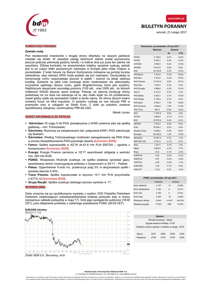 BIULETYN PORANNY wtorek, 21 lutego 2017 KOMENTARZ PORANNY Notowania: poniedziałek, 20 luty 2017 Wartość Zawiało nudą Pod nieobecność inwestorów z drugiej strony Atlantyku na naszym parkiecie niewiele się działo. W zasadzie zasięg dziennych wahań został wyznaczony jeszcze podczas pierwszej godziny handlu i w trakcie dnie już poza ten zakres nie wyszliśmy. DZisiaj kontrakty na amerykańskie indeksy wyraźnie zyskują, jednak jest to po części efekt pozytywnych nastrojów w Europie jakie miały miejsce w poniedziałek. Z kolei futures na Starym Kontynencie notowane są poniżej kursów odniesienia, więc również GPW może poddać się tym nastrojom. Oznaczałoby to kontynuację ruchu rozpoczętego jeszcze w piątek i szansa na jakąś większą korektę. Zyskanie na jakiś czas przewagi przez niedźwiedzie nie zaburzyłoby oczywiście ogólnego obrazu rynku, gdzie długoterminowy trend jest wyraźny. Najbliższymi wsparciami pozostają poziomy 2100 pkt. oraz 2000 pkt., do których indeksowi WIG20 jeszcze sporo brakuje. Patrząc na obecną kondycję strony podażowej nic na razie nie wskazuje na to, aby miało dojść do ich przełamania, nawet gdyby udało się sprowadzić indeks w tamte rejony. Ze strony danych makro możemy liczyć na kilka impulsów. O poranku czekają na nas odczyty PMI w przemyśle oraz w usługach ze Strefy Euro. Z kolei po południu zostanie opublikowany usługowy i przemysłowy PMI dla USA. Marek Jurzec SKRÓT INFORMACJI ZE SPÓŁEK Górnictwo: W ciągu 5 lat PGG (powiększona o KHW) powinna stać się spółką giełdową – min. Tchórzewski; Górnictwo: Rozmowy ze związkowcami dot. połączenia KHW i PGG zakończyły się fiaskiem; Górnictwo: Według Tchórzewskiego możliwość zaangażowania się PKN Orlen w proces dokapitalizowania PGG pozostaje otwarta [komentarz BDM]; Famur: Spółka wypracowała w 4Q’16 ok.61,8 mln PLN EBITDA – zgodnie z konsensusem [komentarz BDM]; Energa: Energa Finance zamierza w 1Q’17 wyemitować obligacje o wartości min. 250 mln EUR; PGNiG: Wiceprezes Woźniak oczekuje, że spółka zwiększy sprzedaż gazu; spodziewany termin rozstrzygnięcia arbitrażu z Gazpromem w 3Q’17 – Parkiet; Pekao: Oppenheimer Funds Inc. przekroczył próg 5% w akcjonariacie spółki i posiada obecnie 5,35%; Trans Polonia: Spółka wypracowała w styczniu 15,7 mln PLN przychodów (+417% r/r) [komentarz BDM]; Grupa Recykl: Spółka oczekuje istotnego wzrostu wyników w ’17. Zmiana 1D YTD WIG20 2 192,8 0,2% 12,6% WIG30 2 540,1 0,3% 13,2% mWIG40 4 800,5 0,2% 13,9% sWIG80 15 615,1 0,8% 9,5% WIG 58 120,8 0,3% 12,3% WIG Banki 7 321,8 -0,3% 16,9% WIG Bud 3 372,9 -0,3% 18,0% WIG Chemia 16 333,2 0,9% 18,7% WIG Dew 1 927,5 0,3% 5,4% WIG Energia 2 806,6 -0,2% 10,0% WIG IT 2 313,7 0,7% 7,3% WIG Media 5 020,1 0,7% 10,0% WIG Paliwa 6 138,3 0,7% 8,3% WIG Spoż 4 842,3 1,3% 16,6% WIG Surowce 4 636,2 1,9% 31,8% 681,6 0,4% -6,6% DAX 11 827,6 0,6% 3,0% CAC40 4 865,0 -0,1% 0,1% BUX 33 973,6 0,4% 6,2% S&P500 2 351,2 0,2% 5,0% DJIA 20 624,1 0,0% 4,4% Nasdaq Comp 5 838,6 0,4% 8,5% Bovespa 68 532,9 1,2% 13,8% Nikkei225 19 381,4 0,7% 1,4% S&P/ASX 200 5 791,0 -0,1% 2,2% Złoto 1 237,5 -0,1% 7,3% Miedź 5 960,0 -0,7% 7,7% Ropa 53,4 0,1% -2,3% EUR/PLN 4,32 -0,4% -2,0% USD/PLN 4,07 -0,4% -2,8% CHF/PLN 4,05 -0,5% -1,3% EUR/USD 1,06 -0,1% 0,9% USD/JPY 113,2 0,3% -3,3% WIG Telco FW20: poniedziałek, 20 luty 2017 Wartość zmiana WYKRES DNIA Kurs otwarcia 2 197 -13 -0,59% Kurs zamknięcia 2 190 6 0,27% Dolar umacnia się po opublikowaniu wywiadu z szefem FED Filadelfia Patrickiem Harkerem zwiększającym prawdopodobieństwo kolejnej podwyżki stóp w marcu (konsensus zakłada podwyżkę w maju’17). Dziś jego wystąpienie publiczne (18:00 CET), jutro odtajnienie protokołu z ostatniego posiedzenia FOMC (20:00 CET) Kurs min. 2 184 5 0,23% Kurs max. 2 200 -19 -0,86% Wolumen obrotu 8 044 -14 437 -64,22% Otwarte pozycje 73 641 -296 -0,40% EUR/USD intraday System: Aktualna pozycja – długa Sygnał otwarcia krótkiej– 2129 Ostatnia zmiana sygnału z krótkiej na długą - 2016 Opory: 2227 2250 2300 2350 Wsparcia: 2165 2145 2105 2054 Źródło: BDM S.A., Bloomberg, GUS Wydział Analiz i Informacji Dom Maklerski BDM S.A. ul. 3-go Maja 23, 40-096 Katowice, Tel.: 032 208 14 12, [email protected] Opracowanie ma charakter czysto informacyjny i zostało opracowany na podstawie informacji uznanych przez autorów za wiarygodne . Zawarte w nim komentarze są subiektywnymi poglądami autorów. Opracowanie i zawarte w nim komentarze nie są podstawą żadnej rekomendacji kupna bądź sprzedaży w rozumieniu obowiązującego prawa i nie powinny być tak interpretowane. Publikowanie w prasie lub w Internecie całości lub części opracowania wymaga zgody sporządzających raport. BIULETYN PORANNY wtorek, 21 lutego 2017 GPW – PODSUMOWANIE Indeksy GPW FW20 (2,197.00, 2,200.00, 2,184.00, 2,190.00, +6.00000) 2250 2200 2150 2100 Zmiana Obrót Indeks Open Low High Close WIG20 2 193,4 2 186,3 2 200,5 2 192,8 0,2% 356 WIG30 2 542,0 2 531,5 2 545,6 2 540,1 0,3% 396 MWIG40 4 802,0 15 541,8 15 615,1 4 800,5 0,2% 89 SWIG80 15 541,8 4 795,0 4 815,2 15 615,1 0,8% 44 WIG-PL 59 133,8 58 983,9 59 133,8 59 076,5 0,2% 511 WIG 58 168,7 58 001,3 58 262,6 58 120,8 0,3% 515 2050 WIG20 Cena Mkt Cap 2000 Alior 1950 1900 1850 1800 1750 1700 29 5 12 19 September 26 3 10 October 17 24 31 7 14 21 November 28 5 12 19 December 27 2 9 2017 16 23 30 6 13 February 20 27 6 March WIG20 (2,193.39, 2,200.49, 2,186.28, 2,192.79, +4.48999) 2250 2200 2150 2100 2050 2000 1950 1900 1850 1800 1750 1700 16 22 29 5 12 19 September 26 3 10 October 17 24 31 7 14 November 21 28 5 12 19 December 27 2 9 2017 16 23 30 6 13 February 20 27 6 March KOMENTARZ POPOŁUDNIOWY Bez Wall Street nie handlujemy Choć w Europie odbywało się kolejne spotkanie w sprawie pomocy Grecji, a wielu inwestorów spogląda na wzrost popularności Marie Le Pen w sondażach przed wyborami we Francji, rynki były dziś spokojne. Brak aktywnoś