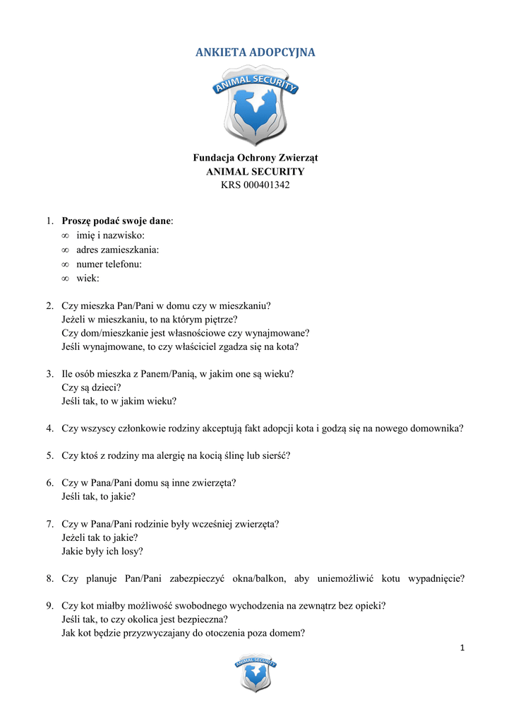 ANKIETA ADOPCYJNA Fundacja Ochrony Zwierząt ANIMAL SECURITY KRS 000401342 1. Proszę podać swoje dane: • imię i nazwisko: • adres zamieszkania: • numer telefonu: • wiek: 2. Czy mieszka Pan/Pani w domu czy w mieszkaniu? Jeżeli w mieszkaniu, to na którym piętrze? Czy dom/mieszkanie jest własnościowe czy wynajmowane? Jeśli wynajmowane, to czy właściciel zgadza się na kota? 3. Ile osób mieszka z Panem/Panią, w jakim one są wieku? Czy są dzieci? Jeśli tak, to w jakim wieku? 4. Czy wszyscy członkowie rodziny akceptują fakt adopcji kota i godzą się na nowego domownika? 5. Czy ktoś z rodziny ma alergię na kocią ślinę lub sierść? 6. Czy w Pana/Pani domu są inne zwierzęta? Jeśli tak, to jakie? 7. Czy w Pana/Pani rodzinie były wcześniej zwierzęta? Jeżeli tak to jakie? Jakie były ich losy? 8. Czy planuje Pan/Pani zabezpieczyć okna/balkon, aby uniemożliwić kotu wypadnięcie? 9. Czy kot miałby możliwość swobodnego wychodzenia na zewnątrz bez opieki? Jeśli tak, to czy okolica jest bezpieczna? Jak kot będzie przyzwyczajany do otoczenia poza domem? 1 10. Czy planuje Pan/Pani wydatki związane z zakupem potrzebnych akcesoriów dla kota, np.: kuwety, drapaka, transportera i innych? 11. Czy jest Pan/Pani przygotowany/a na wydatki związane z koniecznymi szczepieniami, regularnym odrobaczaniem kota oraz z wydatkami związanymi z ewentualną chorobą kota? 12. Czym zamierza Pan/Pani karmić kota? Jaki rodzaj karmy? 13. Koty w nowym miejscu mogą odczuwać lęk, być zestresowane nawet przez dłuższy czas, załatwić swoje potrzeby nie tam, gdzie trzeba, mogą coś zniszczyć itd. W tym czasie kot powinien mieć zapewnione spokojne miejsce, gdzie będzie jego azyl, nikt nie powinien go na siłę do niczego zmuszać, kot powinien mieć możliwość spokojnego zapoznania się z domem. Czy jest Pan/Pani gotowy/a to znieść i jest świadomy/a takiego obowiązku? 14. Jaki jest Pana/Pani stosunek do sterylizacji/kastracji zwierząt? 15. Kot może żyć ponad 15 lat, czy w zawiązku z tym przewidziane jest dla niego miejsce w życiu rodziny na tak długo? 16. Co się będzie działo z kotem w czasie Pana/Pani wyjazdów, wakacji itp.? 17. Z usług jakiego weterynarza dotychczas Pan/Pani korzystał/a, mając uprzednio zwierzę, bądź z usług jakiego weterynarza zamierza Pan/Pani korzystać? 18. Ile godzin dziennie kot będzie pozostawał sam w domu? 19. Czy jest Pan/Pani świadomy/a, że mały kociak potrzebuje więcej uwagi i zabawy niż kot dorosły? 20. Czy jest Pan/Pani świadomy/a, że mały kociak może obgryzać kwiatki, drapać meble, niszczyć bibeloty, skakać po firankach, chodzić po stołach, podkradać jedzenie, jak i że zdarza mu się nie zdążyć do kuwety itd.? 21. Czy jest Pan/Pani gotowy/a podpisać umowę adopcyjną, w której ważnym punktem będzie deklaracja kastracji/sterylizacji kota (o ile zabieg nie został wcześniej wykonany), oraz że kot NIGDY nie trafi na ulicę albo do schroniska, a w razie, gdyby Pan/Pani jednak nie mógł/a go zatrzymać, odda go Pan/Pani wyłącznie przedstawicielowi Fundacji? Osoba podpisująca umowę musi być pełnoletnia. 22. Czy godzi się Pan/Pani na wizytę wolontariusza w Pana/Pani domu? SERDECZNIE DZIĘKUJEMY ZA WYPEŁNIENIE ANKIETY www.animal-security.pl 2